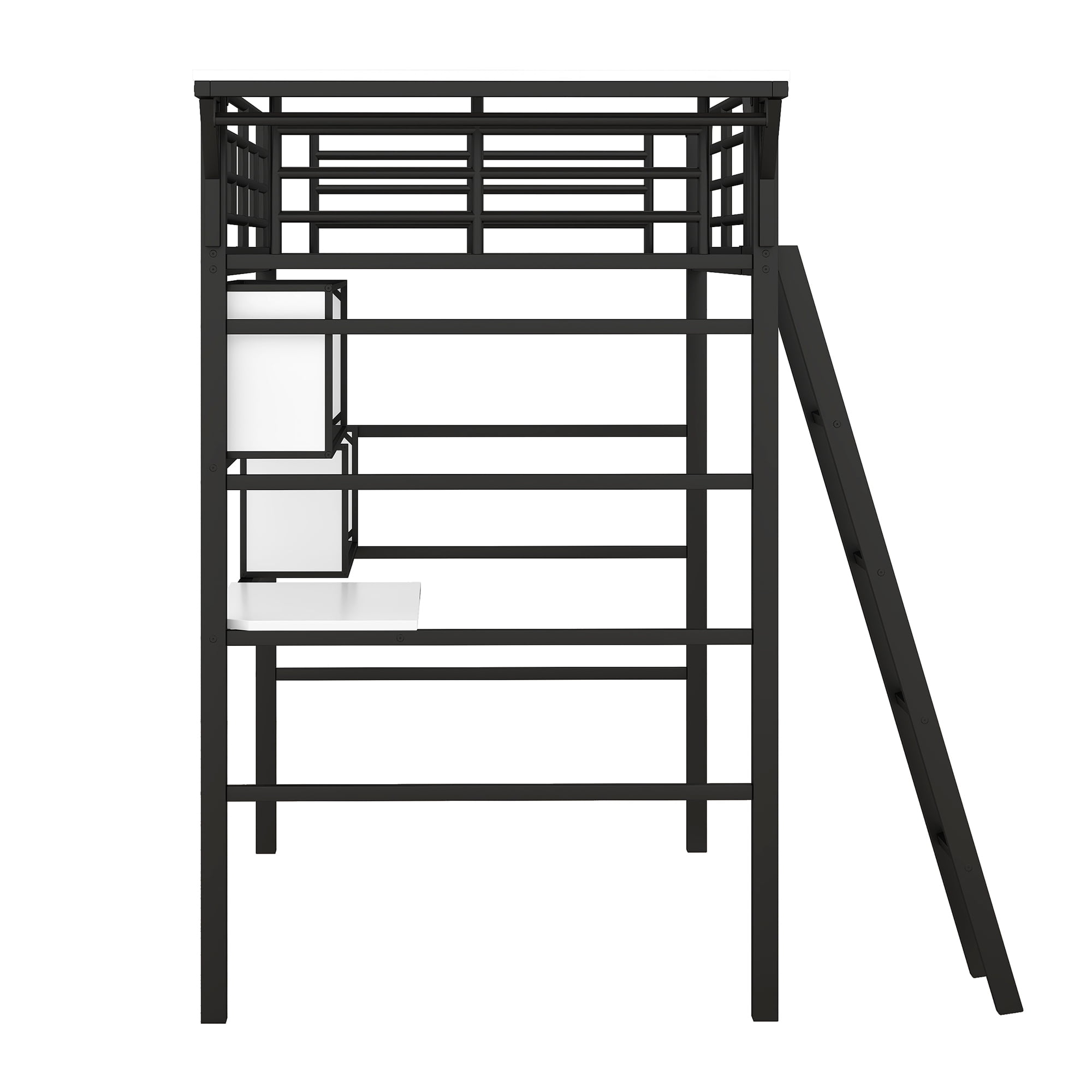 Features : [Minimalist Appeal]Contemporary and simple in design, this loft bed is flawlessly finished in a metallic powder coating that boasts a clean, textured touch and a lasting lifespan. Designed with a sleek silhouette and neutral color palette to suit a variety of bedroom aesthetics while offering an abundance of sleeping space. [Build to Last]This bed’s metal frame is expertly welded with a premium powder coated finish and secured with heavy duty screws for superior support you can trust. Complete with built-in metal slats on both the upper and lower bunk, experience solid mattress support and even body distribution and say goodbye to sleepless nights. Compact in nature, this bed is also suited for small and tight bedrooms. [Versatile Use]Featuring a twin size upper bed and built in desk under the bed, this loft is perfect for accommodating varying sleeping space needs. [Integrated Desk]The built-in study desk seamlessly integrated underneath makes this bed an ideal choice for those who do office work or homework without a dedicated space and spurs productivity. Devided shelf can store books. Attached desktop is good for daily books and clothes hanger will help you store daily clothes. [Simple Assembly]Light assembly with instructional manual included. Specifications: Overall Product Dimension: 89”L x 40.4”W x 68.2”H Dimensions of top bed: 75.2” x 39” Total heigh: 68.2” Spring box: No Need Bed Capacity: 250lb Mattress Included: No