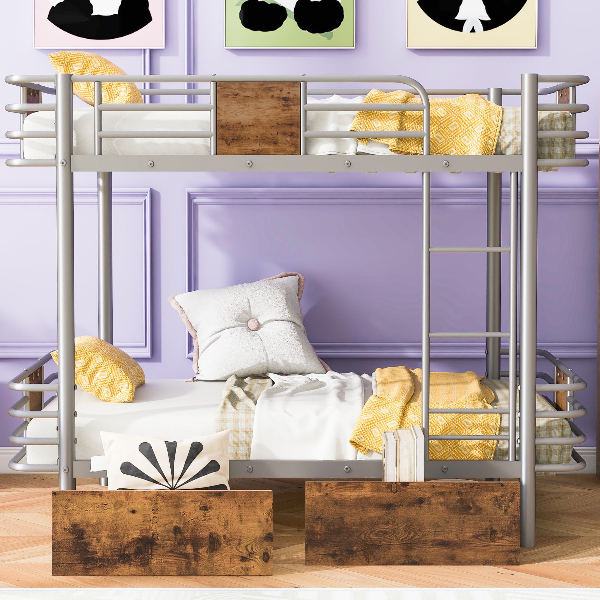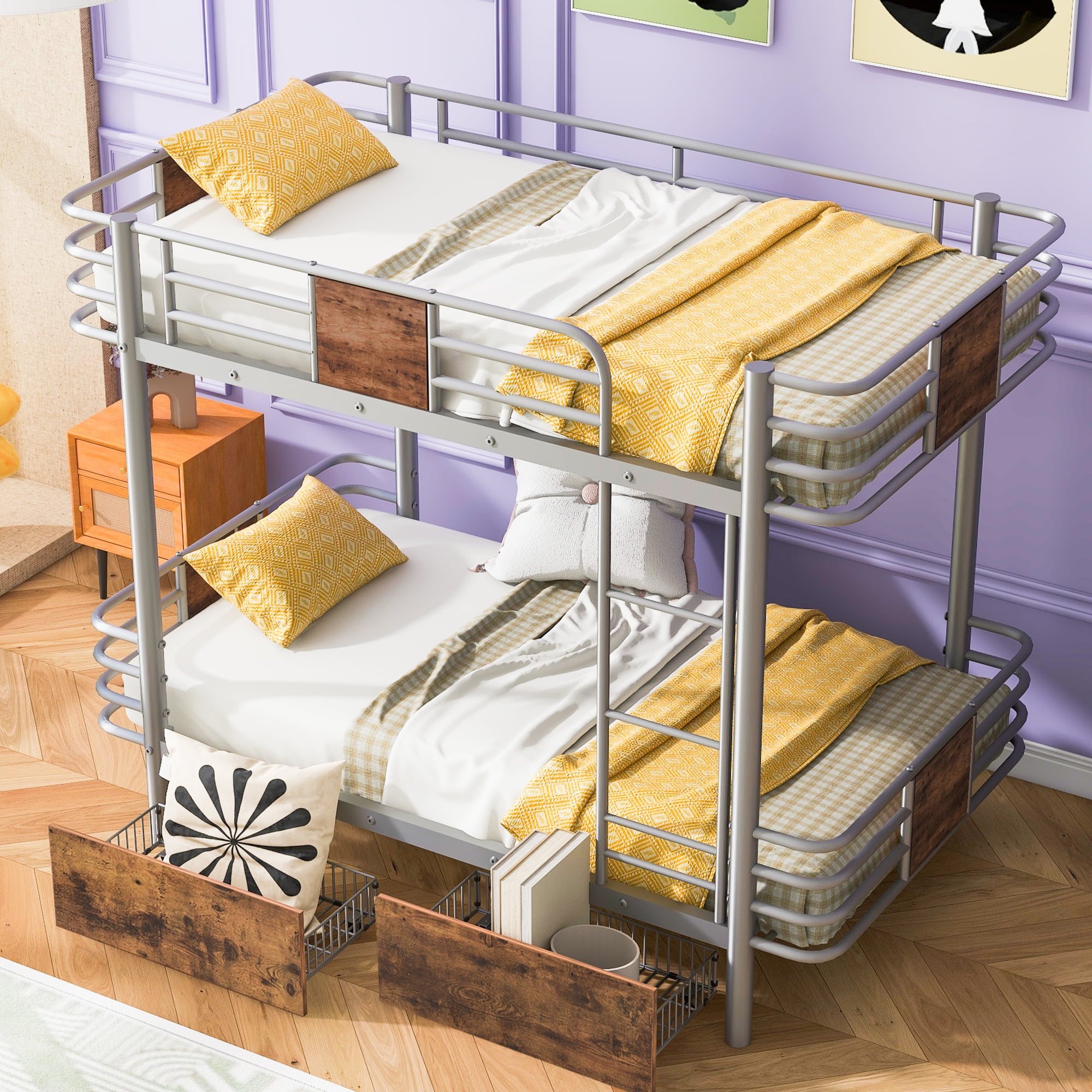Features : [Bunk Bed with Drawers]: This bed is equipped with two big drawers under the bed for you. You can store books, toys and other accessories on it to solve space. [Safe and Stable]: Both the upper bed and the lower bed are equipped with full guardrails to protect your kids. The built in ladder between the bed will provide easy and safe access to the upper bunk. [Solid Construction]: Constructed from solid steel, this metal bunk bed will stand the test of time and last for years. High-quality metal will be stable, without any wobbling when sleeping on it. [Easy to Assemble]: All the parts and tools needed will be packed in the package. The instruction and accessories are also included in the package. Just follow the instruction, and then you will get your own bed. Specifications: Size: Twin XL over Twin XL Overall Product Dimension: 81.5”L x 41.3”W x 66.3”H Inner Size: 80.3” x 39.4” Overall Product Weight: 107lb Bed Weight Capacity: 300lb Mattress Included: No Total Height: 66.3″ Assembly Required: Yes Recommend Bed Mattress Thickness: 6-8”