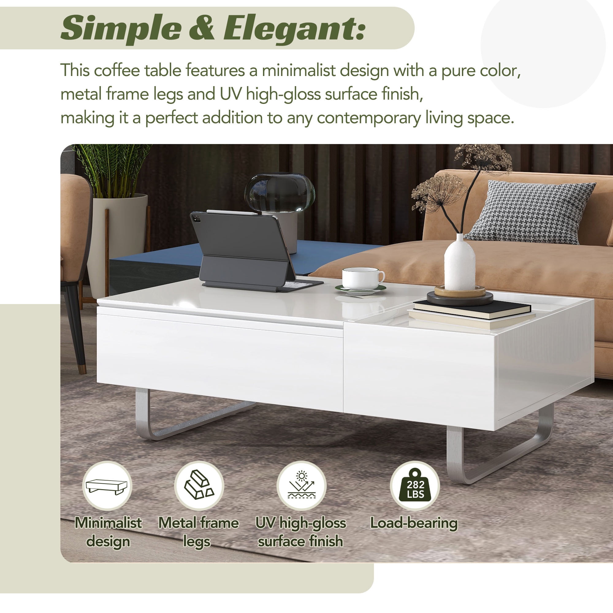 【Simple & Elegant】This coffee table features a minimalist design with a pure color, metal frame legs and UV high-gloss surface finish, making it a perfect addition to any contemporary living space. 【Versatile Lift-top Design】Unique designed lifted tabletop allows users to easily lift the tabletop according to their preference and turns it to a comfortable dining table or a temporary workplace. 【Living Room Organizer】This coffee table is equipped with a hidden space below the adjustable tabletop and a drawer aside, providing practical storage for commonly used items and keeping them within easy reach. 【High Quality Material】It is made of high-quality MDF with excellent pressure resistance. Finished with a high-gloss water-repellent finish and baking varnish metal frame legs, it’s both aesthetically pleasing and functional. 【Dimensions】Overall size: 45.3”Lx26.6”Dx14”H. Load-bearing: 282LBS. Notice: 1.The plastic film for protecting UV from scratches should be teared off before put into use. If there is light dust on the edge, it can be wiped with a wet rag. 2.Painted product may produce slight color difference in different light conditions or in different displays.