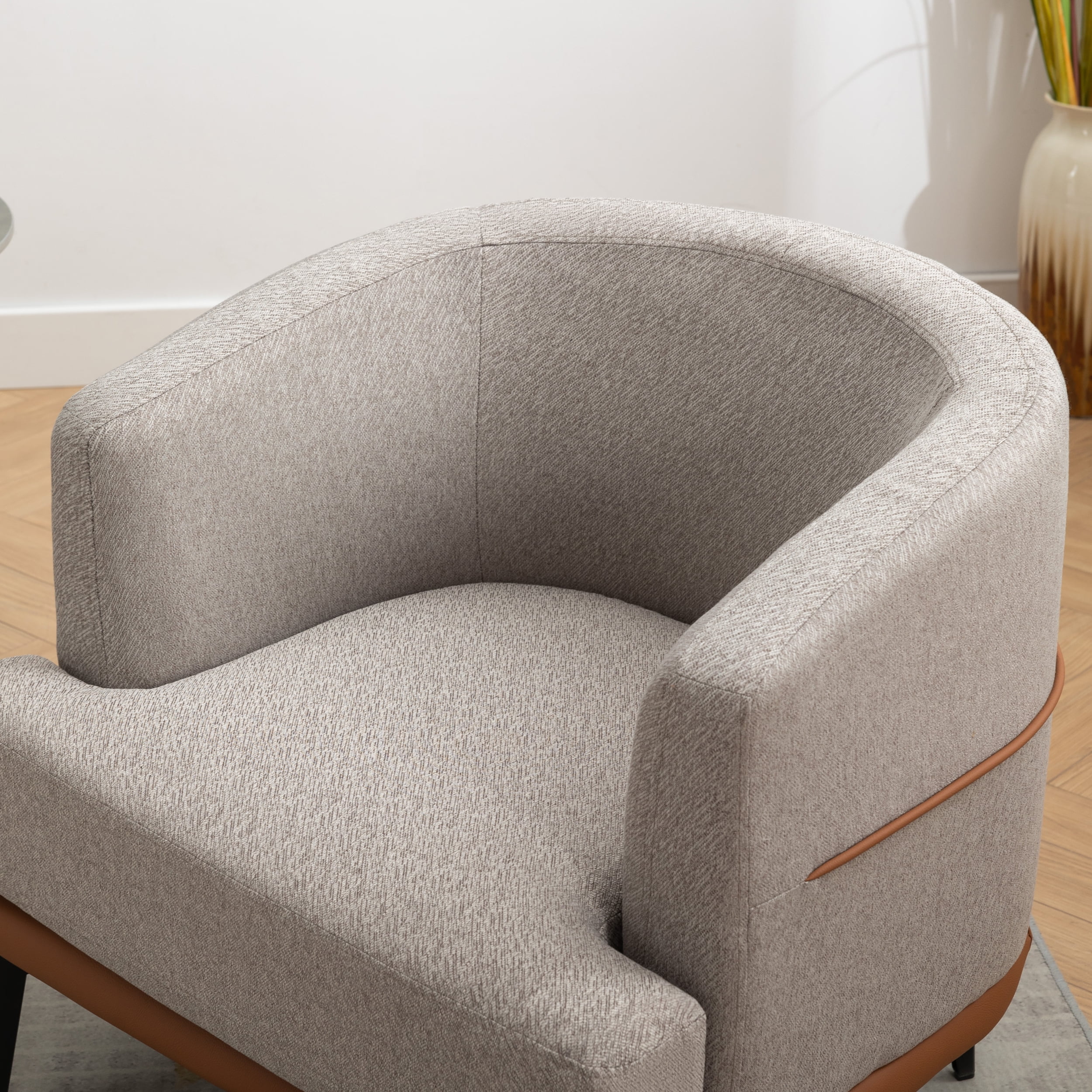 Its on-trend design will enhance the look of any space, such as your living room, bedroom, home office or reading nook. Cozy up in the plush fabric that was carefully selected for its beauty and soft feel. Look for a new dresser for your clothes, display your favorite books with a bookcase or create your home office with a desk and a cube organizer. You’ll also find kitchen and dining tables and chairs, living room furniture and kid’s furniture. 【Stylish and design】This chair is made of a combination of linen and PU leather, which is both dirt resistant and scratch resistant. The perfect combination of the two materials creates a delicate modern style.This chair is perfect for your modern or contemporary inspired home. Works great in offices, bedrooms or living rooms. Perfect for your nest and you can really enjoy the peaceful and tranquil time of reading or pleasant chatting time.Can be used in multiple room settings: as a dressing chair, accent chair, arm chair, lounge chair, club chair. 【Humanized design】This barrel chair sits atop four sturdy metal legs for a high weight capacity up to 330lbs, which offers you strong support to sit comfortably. Screw-in floor protectors are used for the legs, which not only protectors your floor but also add minor height flexibility.The ergonomic curved backrest and soft padded seat provide great comfort for you and your guests whether you and your guests are dining or chatting. The best sitting posture of this chair is to sit cross-legged on it to read a book or curl up on it to rest and watch TV. 【Quality Construction】Comfortable fabric encases high-density foam padded cushions to give you hours of comfortable sitting without sacrificing fashion and style. Thick and broad cushions provide added support and comfort. You can freely adjust your most comfortable position on the chair. 【Confidence in purchase】Our items isn’t just a piece of furniture; it’s a statement of quality and commitment. Crafted by seasoned professionals, we’re confident in its durability. 【Dimensions】28.9″L x 27.6″W x 28.3″H inches, it is designed to fit well in most room.Embrace the perfect blend of utility and elegance.Spacious space can create a comfortable feeling.Our armchair is suitable for bedroom, living room, balcony, office, etc. You can enjoy your own leisure time on it.Simple assembly is required. Only need to screw the four metal legs to the chair with bare hands and done.