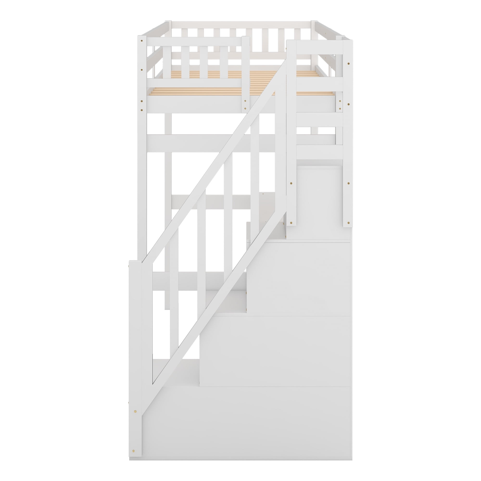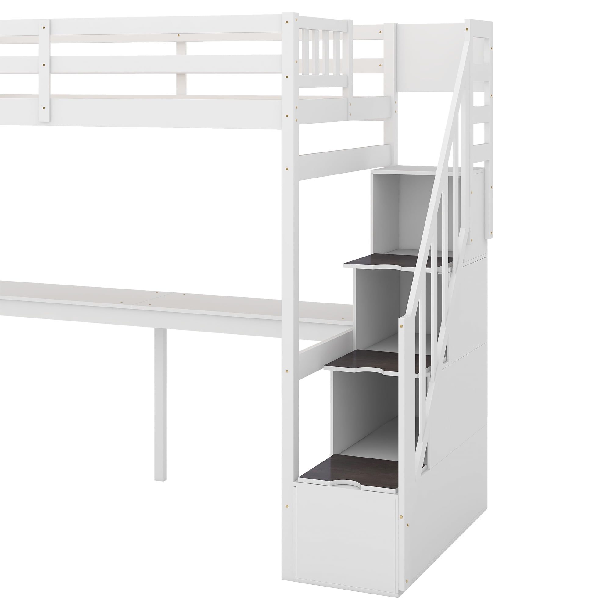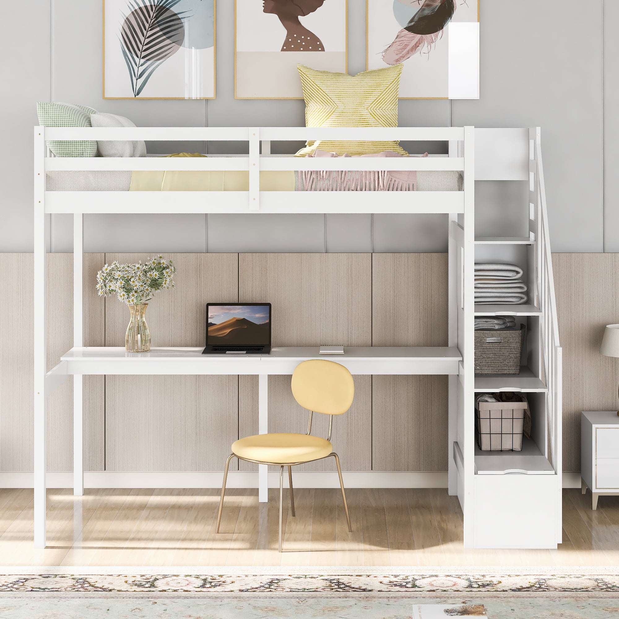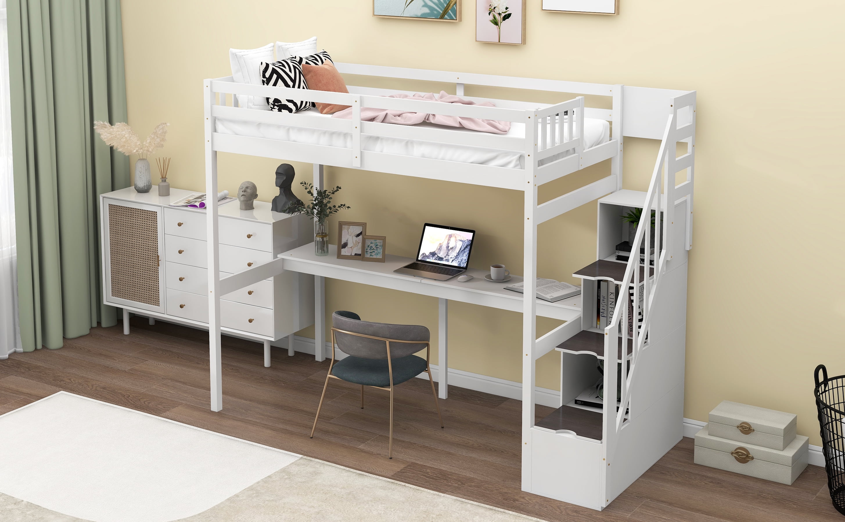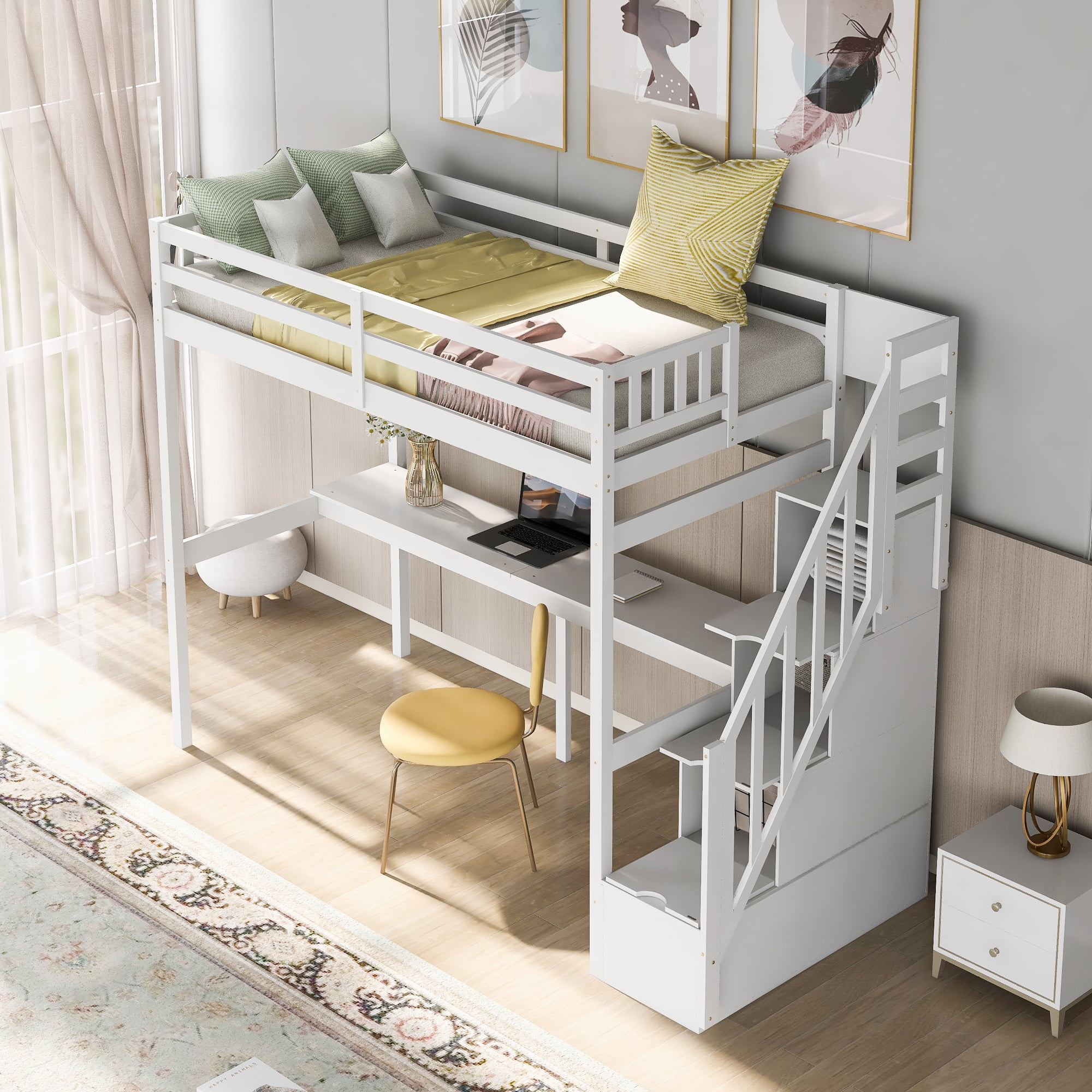 EUROCO Modern Twin Size Loft Bed with Storage Staircase and Built-in Desk for Kids Teens, White