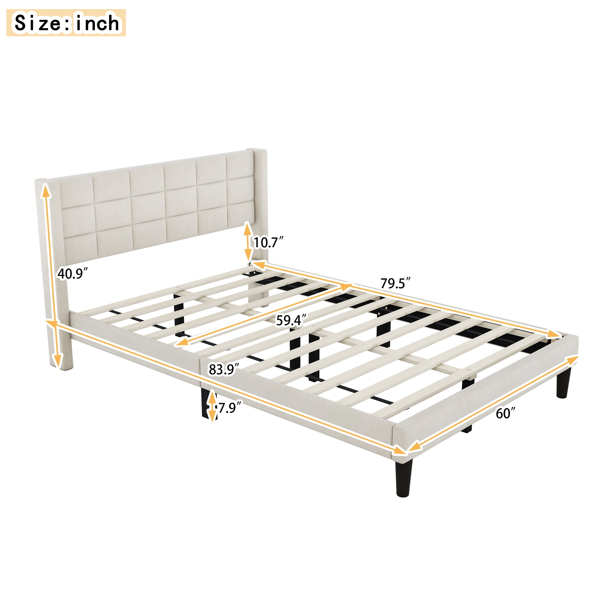 Features: [Upholstery Platform Bed]: Euroco bed is the simply and elegant for your modern bedroom. Upholstery design will suit any room decorations and add more charming to your living room. With or without drawer for you to choose, meeting different needs. [Storage Drawer]: This bed is equipped with a big drawer under the bed. With wheels on it, you can pull it in and out easily and quietly. Good place for books, toys and clothes. You can also choose the item without the drawer. [Headboard and Footboard]: Both the headboard and the sideboard are upholstered. You can lean on it to read or watching. The design and shape of the headboard is tufted, making your bed unique and special. [Solid Construction]: Constructed from solid pine wood and high quality linen, this bed will stand the test of time and last for years. Slats included, so box spring is no needed. Queen size bed for both child and adults. [Easy to Assemble]: All the parts and tools needed will be packed in the package. The instruction and the accessories are also included in the package. Just follow the instruction, and then you will get your own bed. Specification: Size: Queen Overall Product Dimension: 83.9”L x 60”W x 40.9”H Bed Inner Size: 79.5” x 59.4” Overall Product Weight: 80lb Bed Weight Capacity: 700lb Mattress Included: No Total Height: 40.9″ Assembly Required: Yes Recommend Bed Mattress Thickness: 8-10”