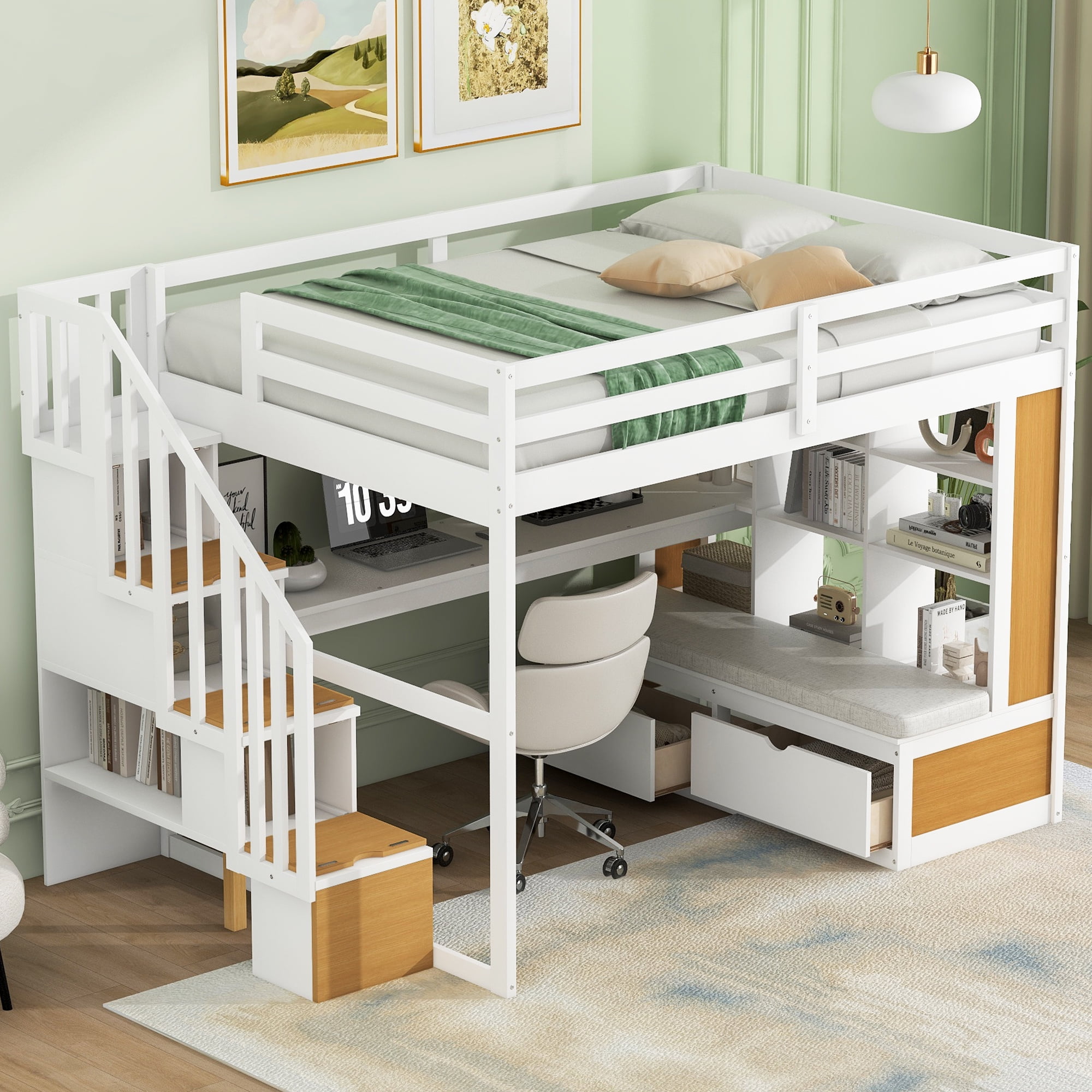 Euroco Modern Wood Full Size Loft Bed with Desk and Shelves, Storage Staircase and Drawers for Kids Teens, Wood