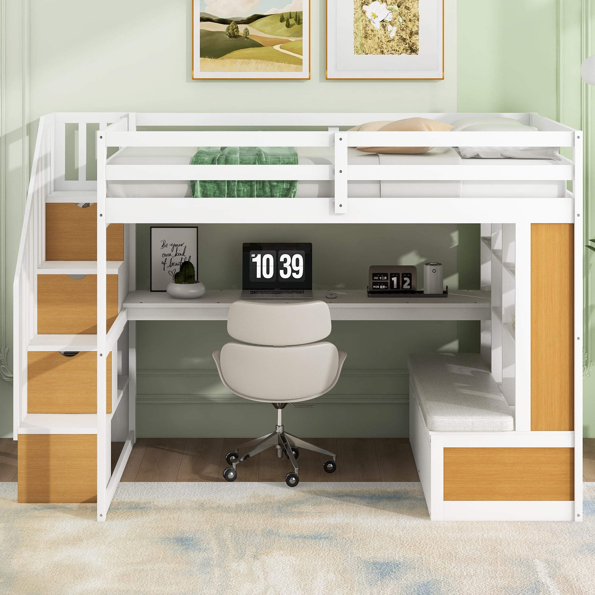 Features: [Functional Loft]: The Euroco full size loft bed will provide more space for your growing kids. The space under the bed is fully used, so that it can save your space and make your room tidy and organized. White or wood finish will suit different room decorations. [Desk and Shelf]: The space under the loft has a desk for studying and reading. You can make it into a working station. The right side is a shelf with two drawers, and the shelf has been divided into nine different cabinets. You can put books and decorations. [Safe and Comfortable]: Full-length guardrails on the upper bed prevent accidental falls. The built-in staircase tightly attaches to the bed for easy access and wobble-free footing. You can also use the staircase for extra storage. [Solid Construction]: Made of solid pine wood and MDF board, this loft bed is built to withstand the test of time and serve your family for years. The bed frame is manufactured for sound stability and security that can withstand playing without dangerous wobbling. [Easy to Assemble]: With detailed instructions included, you can easily assemble with loft bed on your own. White or gray painted finish is smooth and easy to clean. All the parts and tools needed will be packed in the package. Specification: Size: Full Overall Product Dimension: 93.3”L*56”W*61.4”H Bed Size: 76”x 54.4” Overall Product Weight: 263.3lb Weight Capacity: 400lb Mattress Included: No Total Height: 61.4″ Assembly Required: Yes Recommend Bed Mattress Thickness: 6” Material: Pine Wood+MDF Spring box: No need