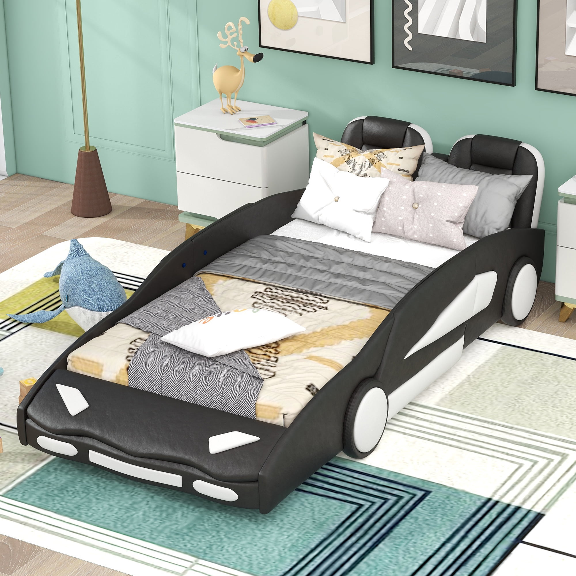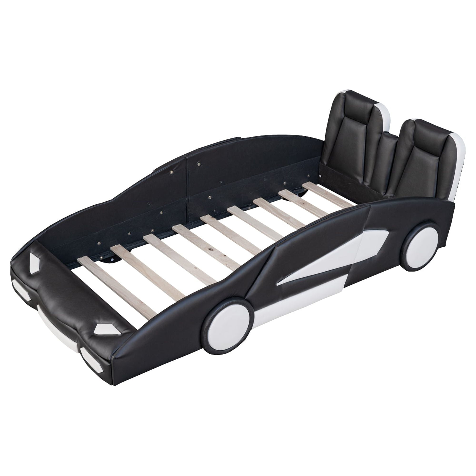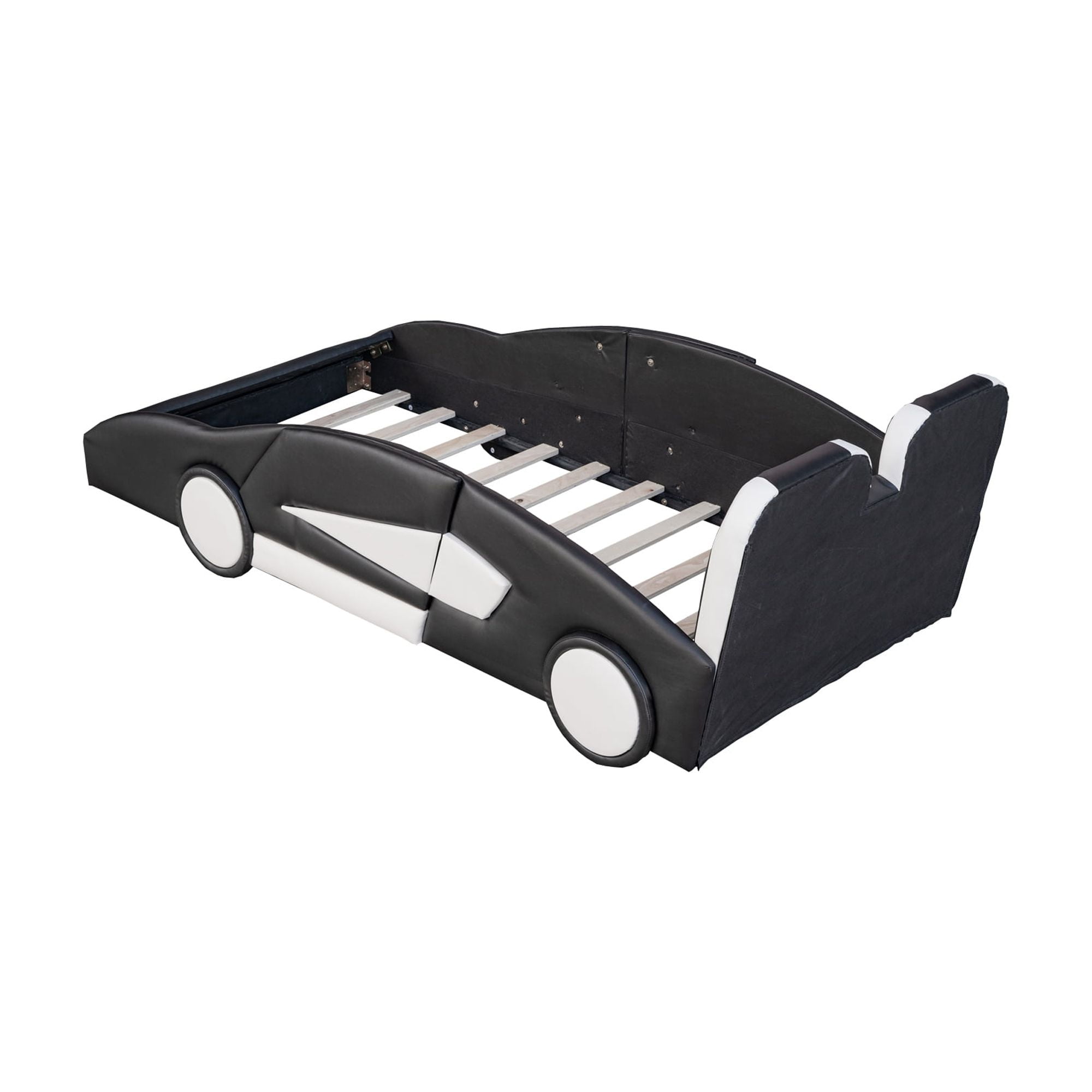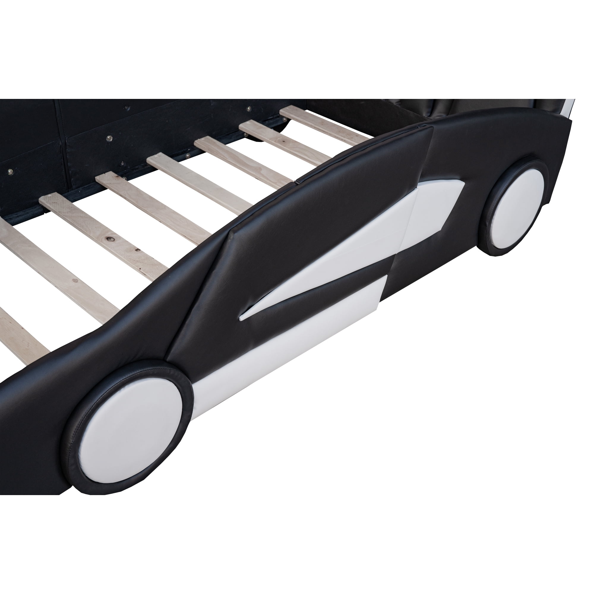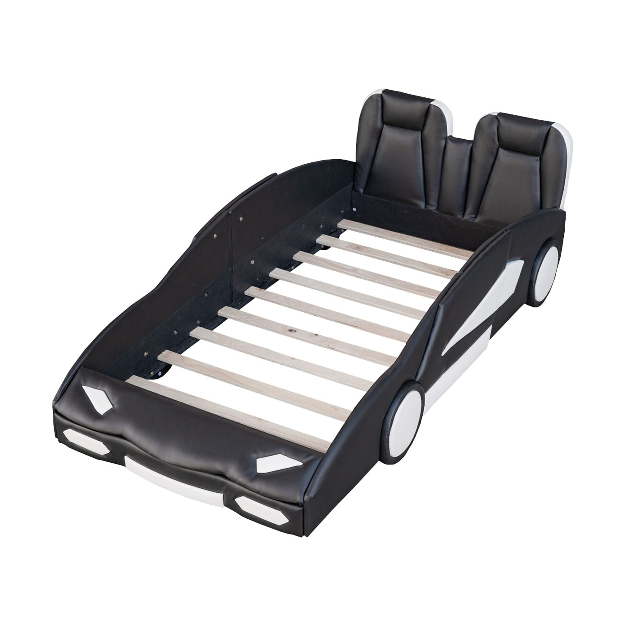 Euroco Modern Wood Race Car-Shaped Twin Platform Bed for Kids Teens Bedroom, Upholstery PU Leather Car Bed for Kids Gift, Black