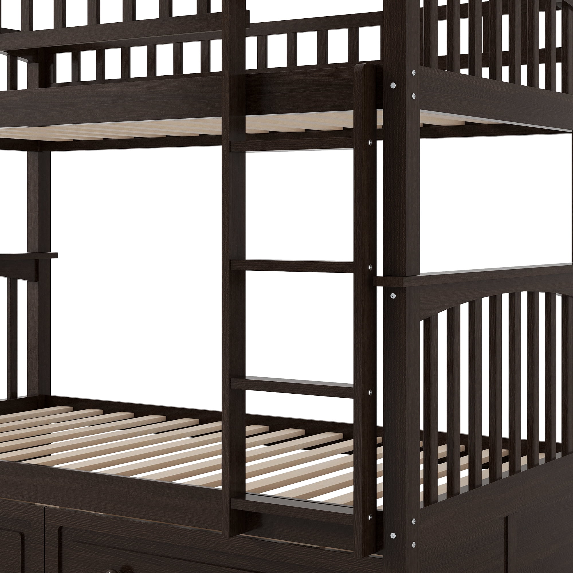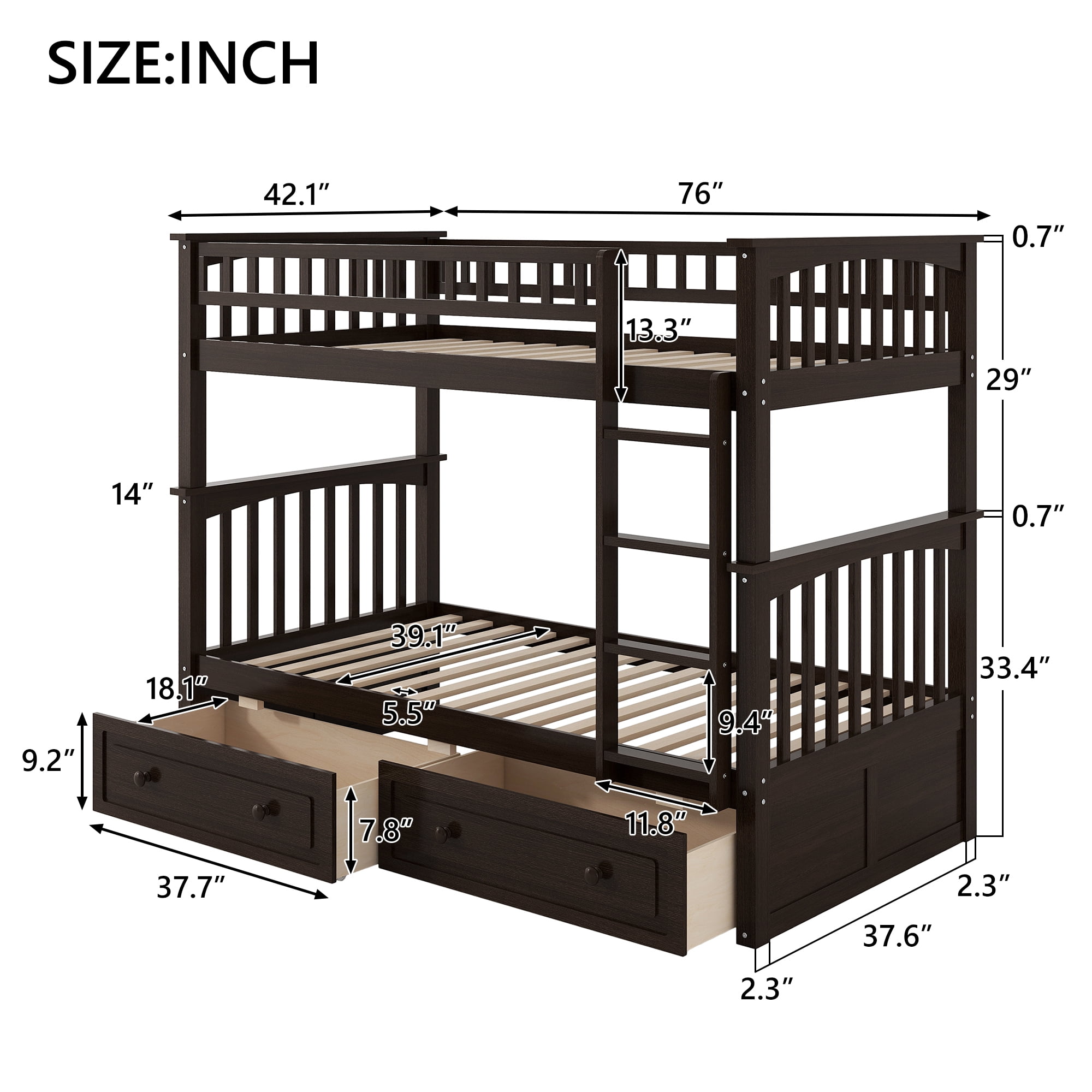 Features: [Storage Function]: The included drawers provide great storage function, perfect for you to store away your stuff. [Quality Guaranteed]: The bed structure is crafted from high-quality solid pine wood, solid pine legs, and a strong, durable frame so that the bed is sturdy and durable. [Convertible Bed]: This bed can be converted from a bunk bed into two daybeds, one with two drawers and one with great under-bed space. [Easy Assembly]: Assembly is easy since the instruction is clear and the hardware is available. Specifications: Finish option: Gray/ White/ Espresso Size option: Twin over Twin Dimensions of bed:76”L*42.1”W*63.8”H Total height:63.8” Spring box:No Need