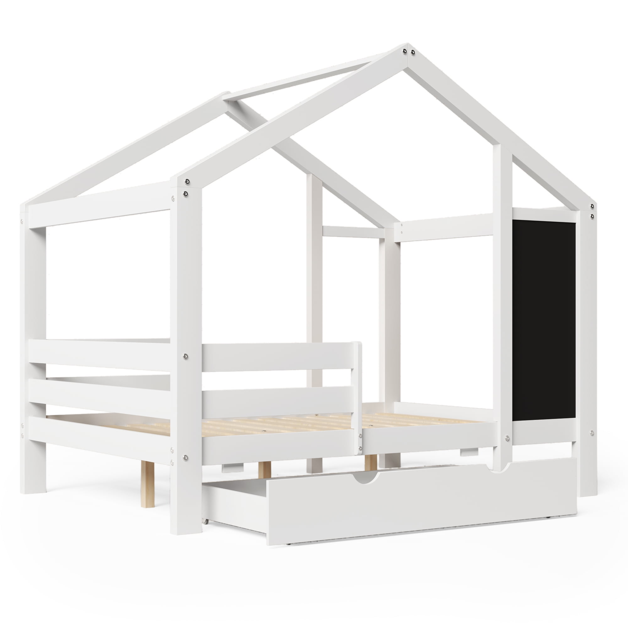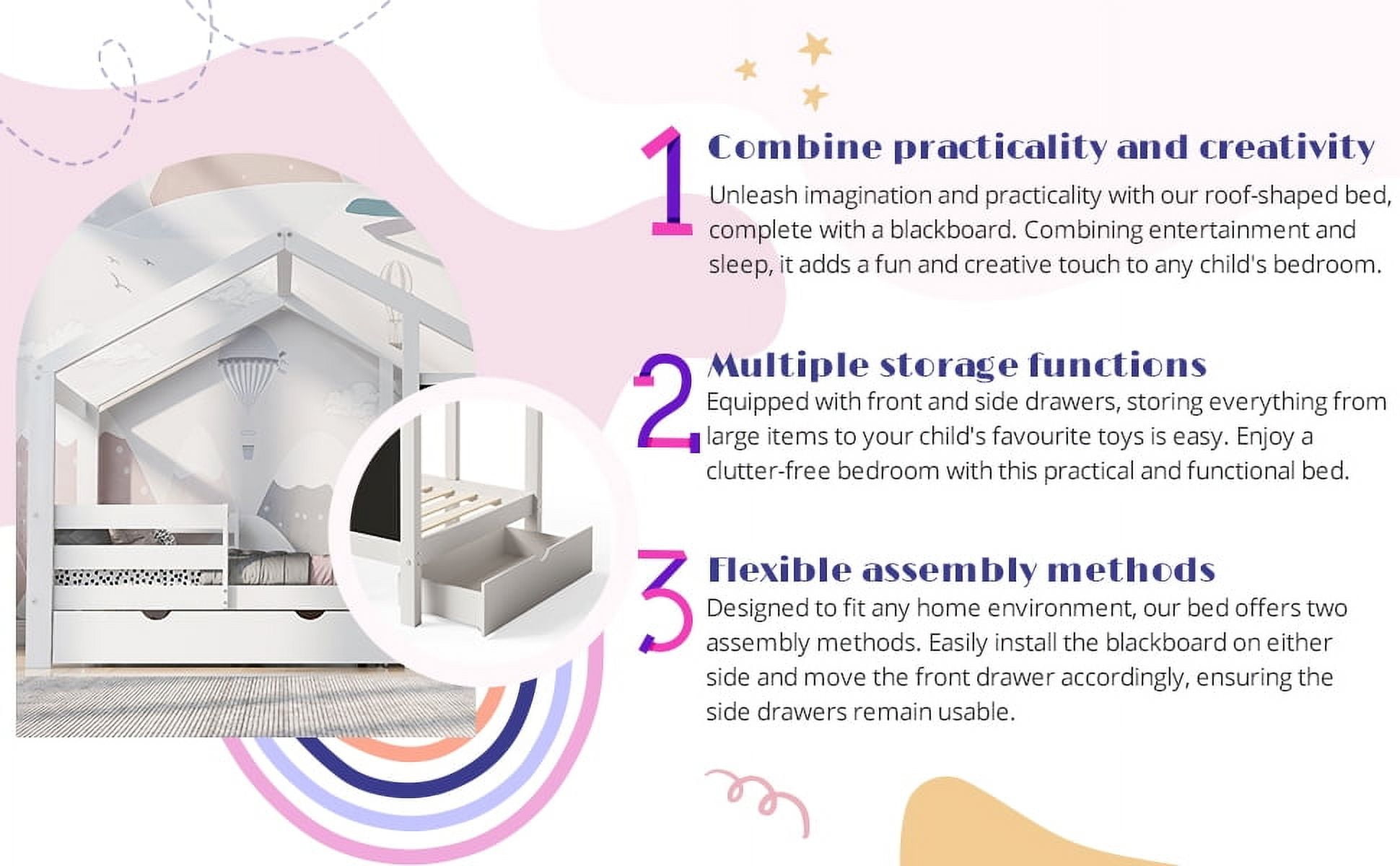 White Kids House Bed with Trundle and Blackboard gives your child a safe and fun centerpiece for their room with this versatile trundle bed. The roof, inspired by playhouse designs, offers a fun and eye-catching coziness that will enhance your child’s imagination while also providing a safe place for play. Full-length guardrails ensure safety while the twin-sized trundle gives extra space for sleepovers. Let your kids imagination run wild with our attached blackboard. Perfect for girls and boys to make up their own theme or simply keep it beautifully simplistic. Can be decorated with ribbons or lanterns on the eaves. The bed has pre-drilled holes which are standard features of our beds makes this easy to assemble.
