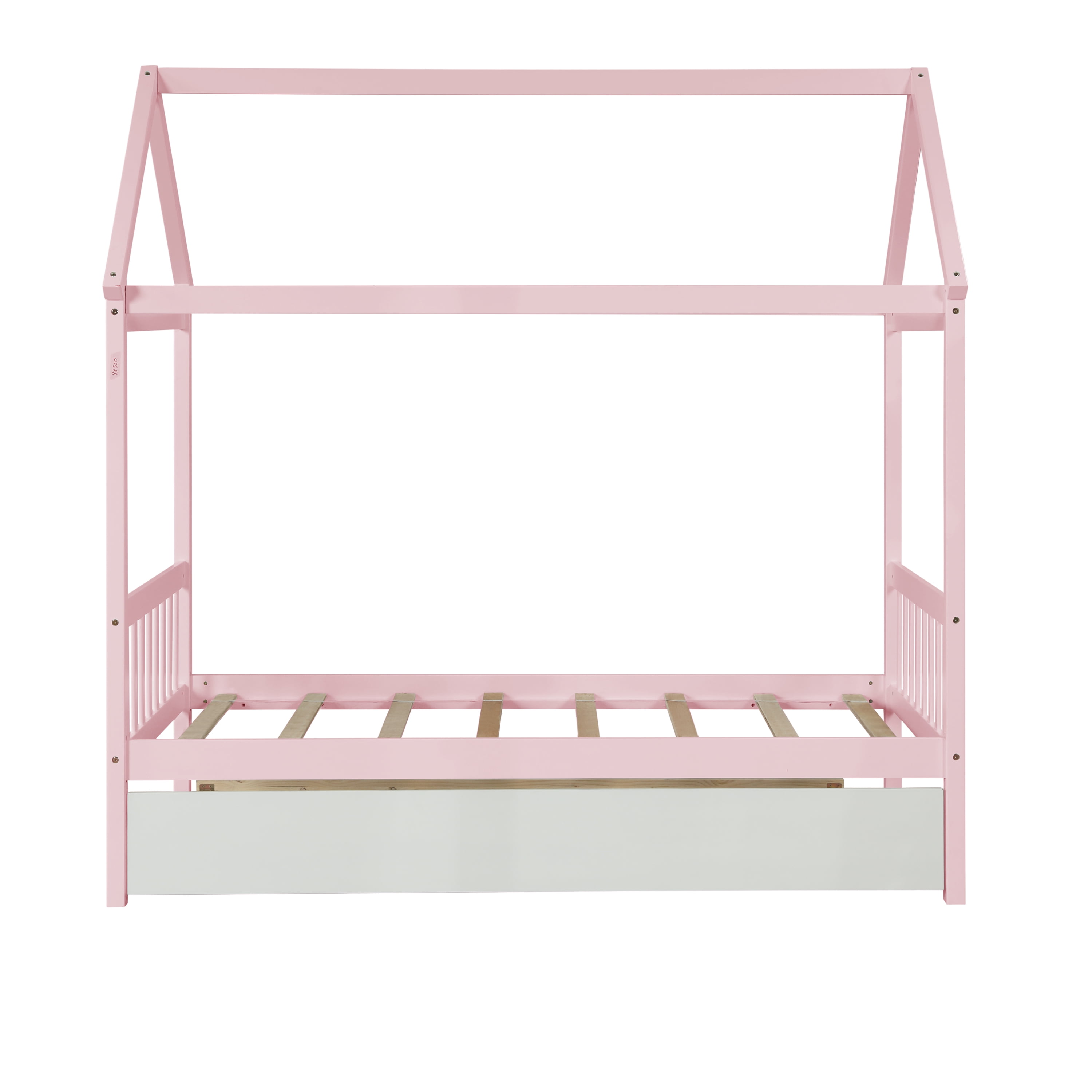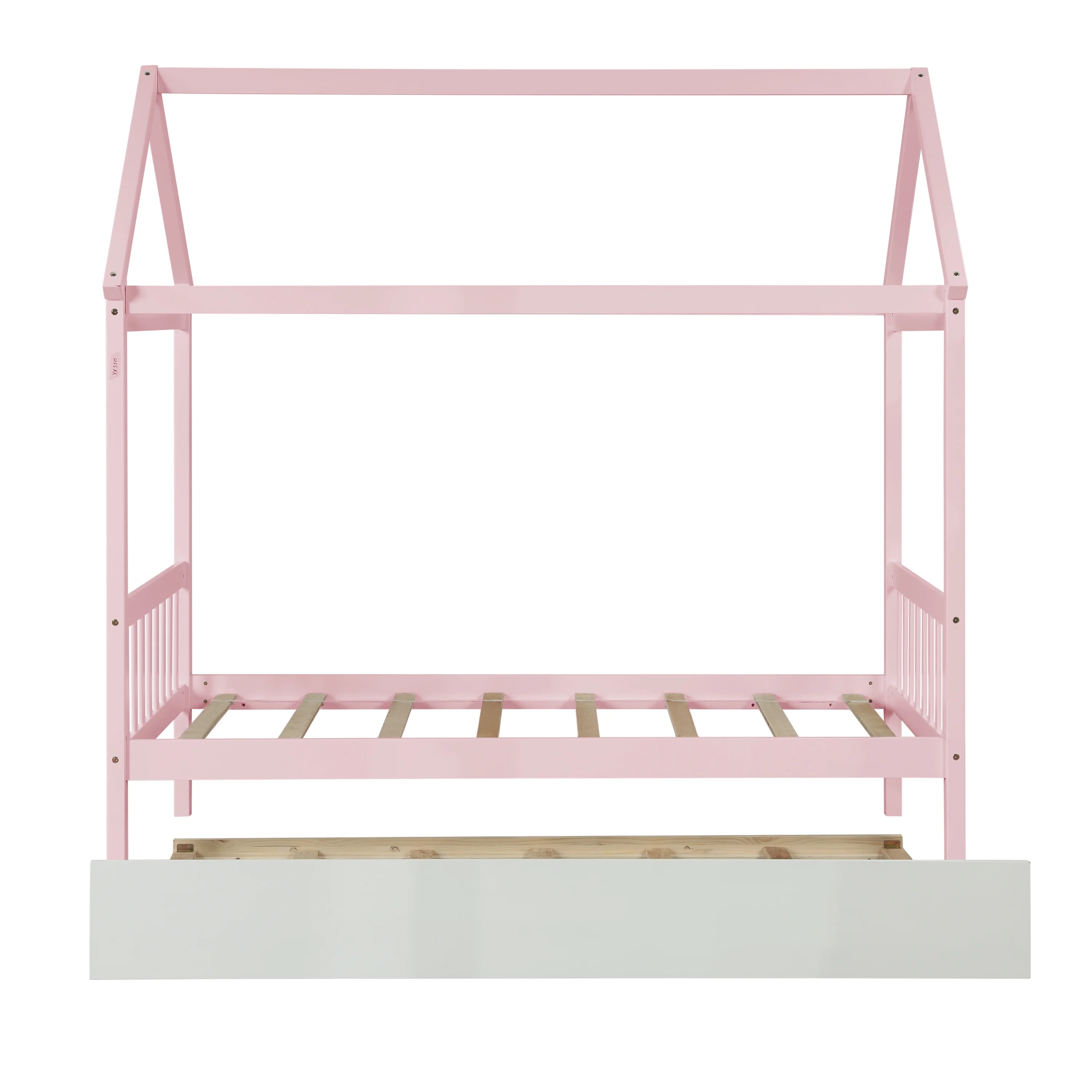 EUROCO Pine Wood House Bed with Trundle for Kids Bedroom, Pink