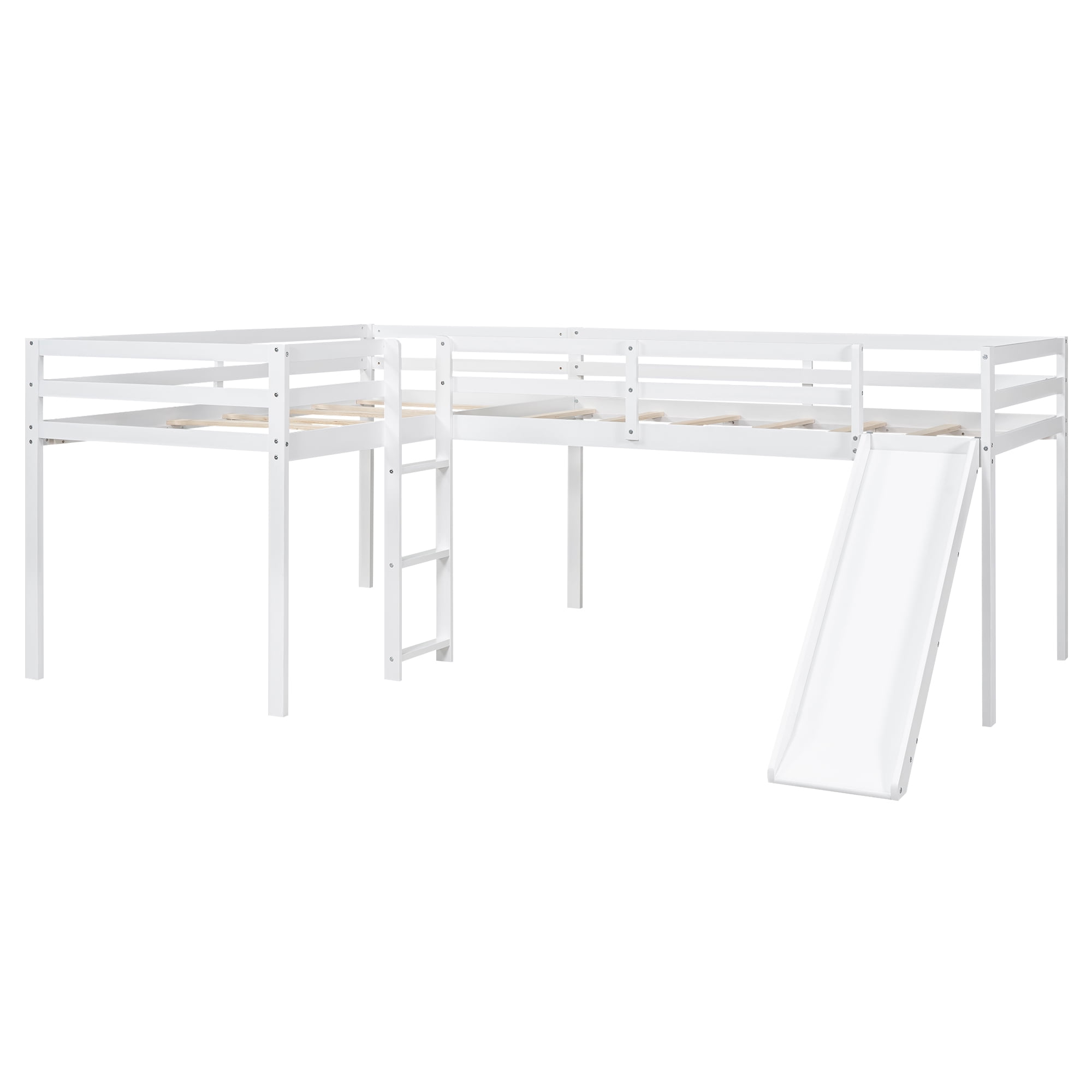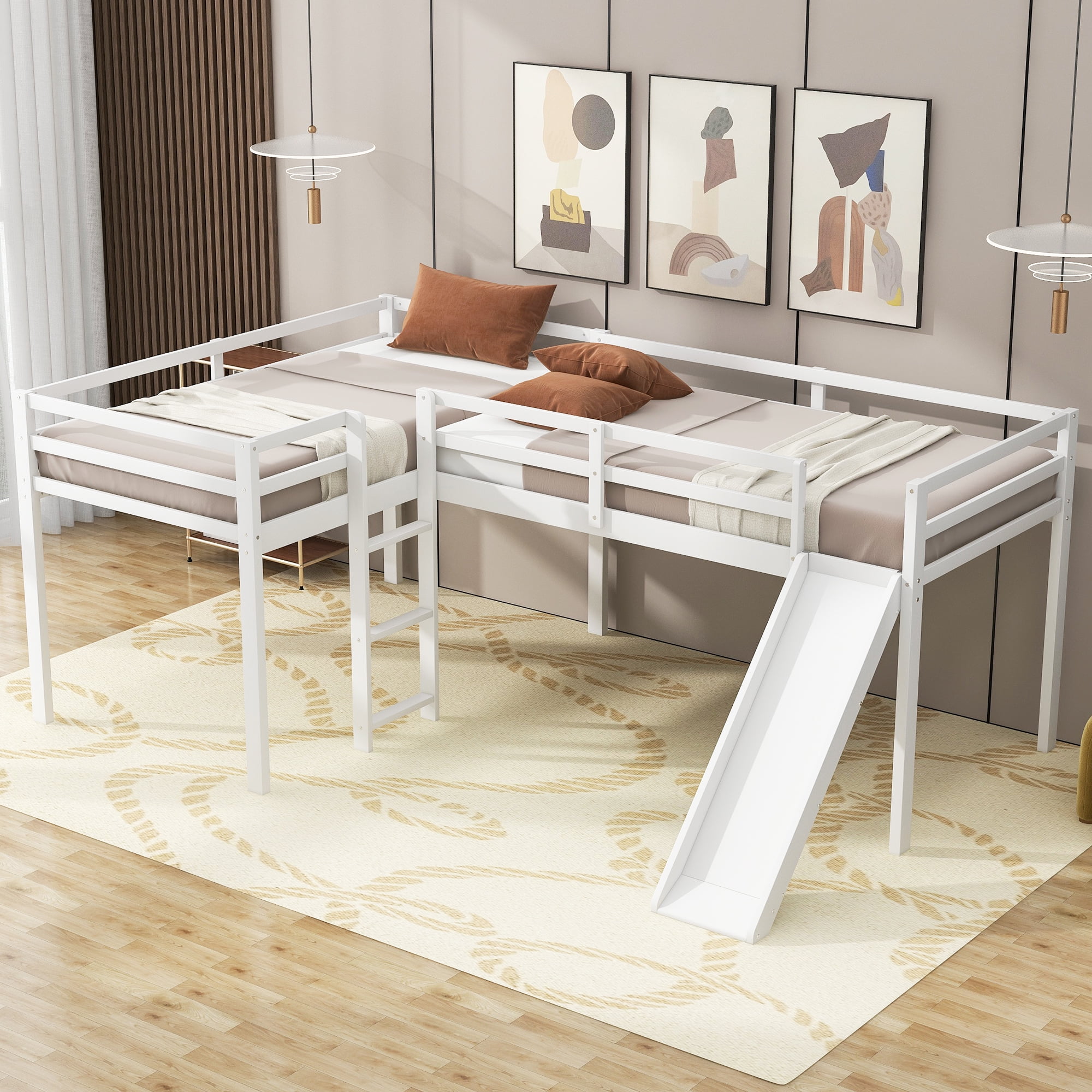 This wooden L-shaped loft bed with clean- lined silhouette is a classic bed frame that works well with a variety of decorating styles and makes it easy for you to enhance and improve your space. Every inch of this modern loft bed is designed with your comfort in mind. Featuring strong, solid pine wood frame and supporting slats for each bed, this 2 in 1 loft bed is built to last, ensuring it will accompany your family for many years to come. For added extra fun, a ladder is included, perfect for children to enjoy their bedtime. With humanized design and multiple function, this bed will allow you to increase your comfort level.