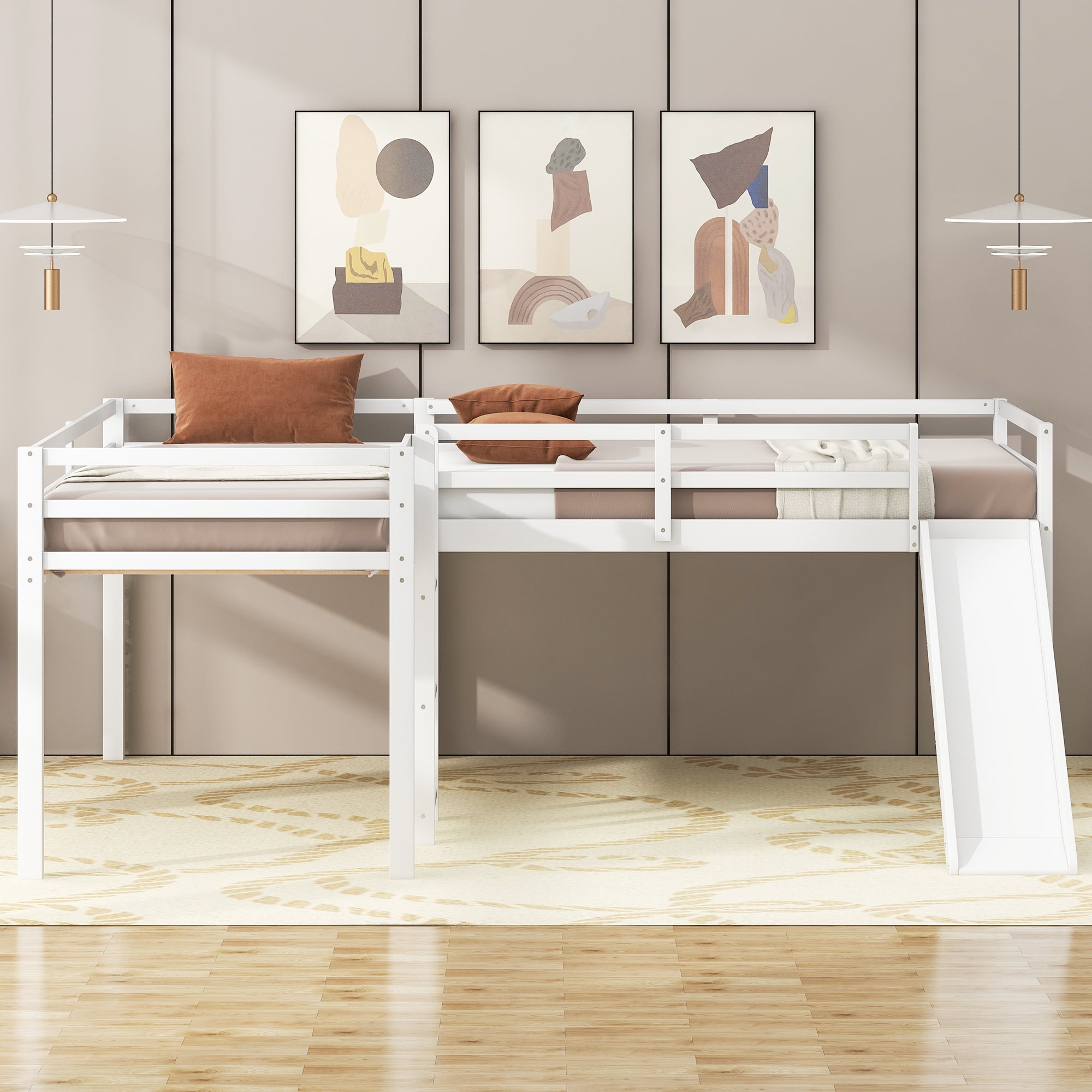 Features : [Space-Saving]: This bed features a L-shaped design which makes the bed perfect for putting in corner and maximize your room space. [Extra Fun]: A ladder and a slide are available for your kids to have fun during their bedtime and spacious under bed space can be decorated as their own mini playground. [Safety Guaranteed]: With heightened guardrail and sturdy bed frame, this bed put kid’s safety in first place. [Easy Assembly]: Assembly is easy since the instruction is clear and the hardware is available. Specifications: Finish option: Gray/White Overall Product Dimension: 118.2”L*77.8”W*46.1”H Bed Inner Size: 39.2” x 75.4” Total height: 46.1″ Overall Product Weight: 114lb Spring box: No Need Assembly Required:Yes