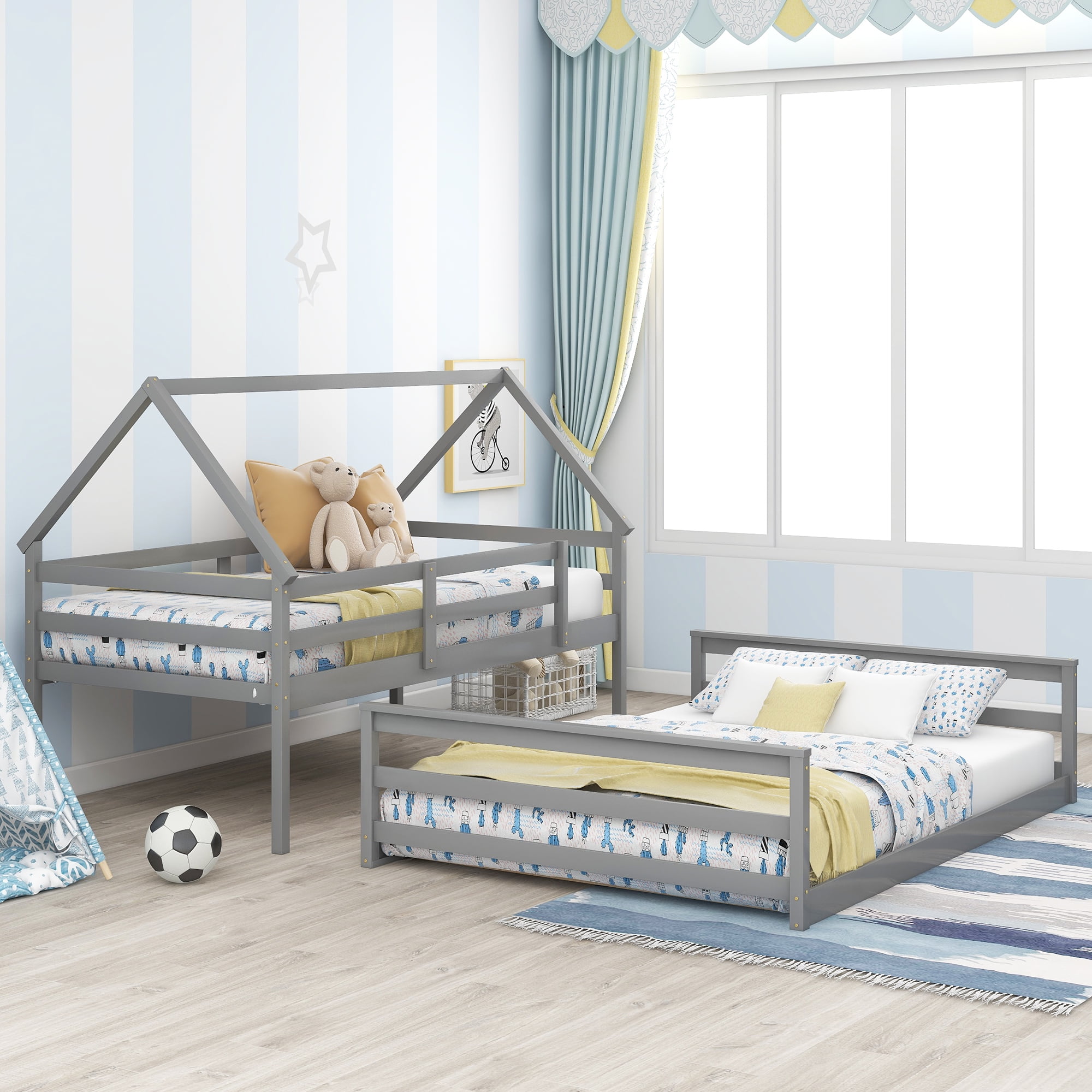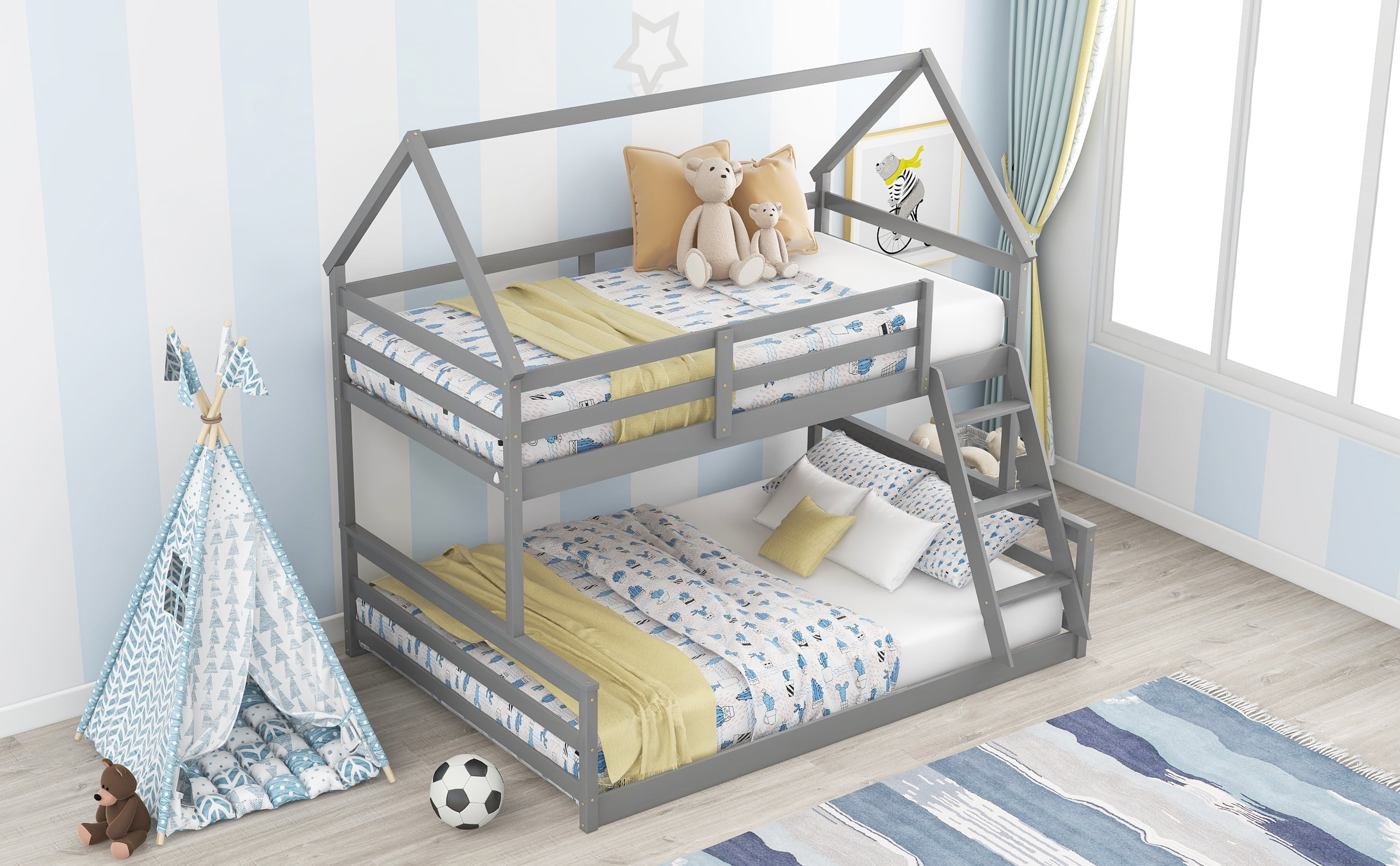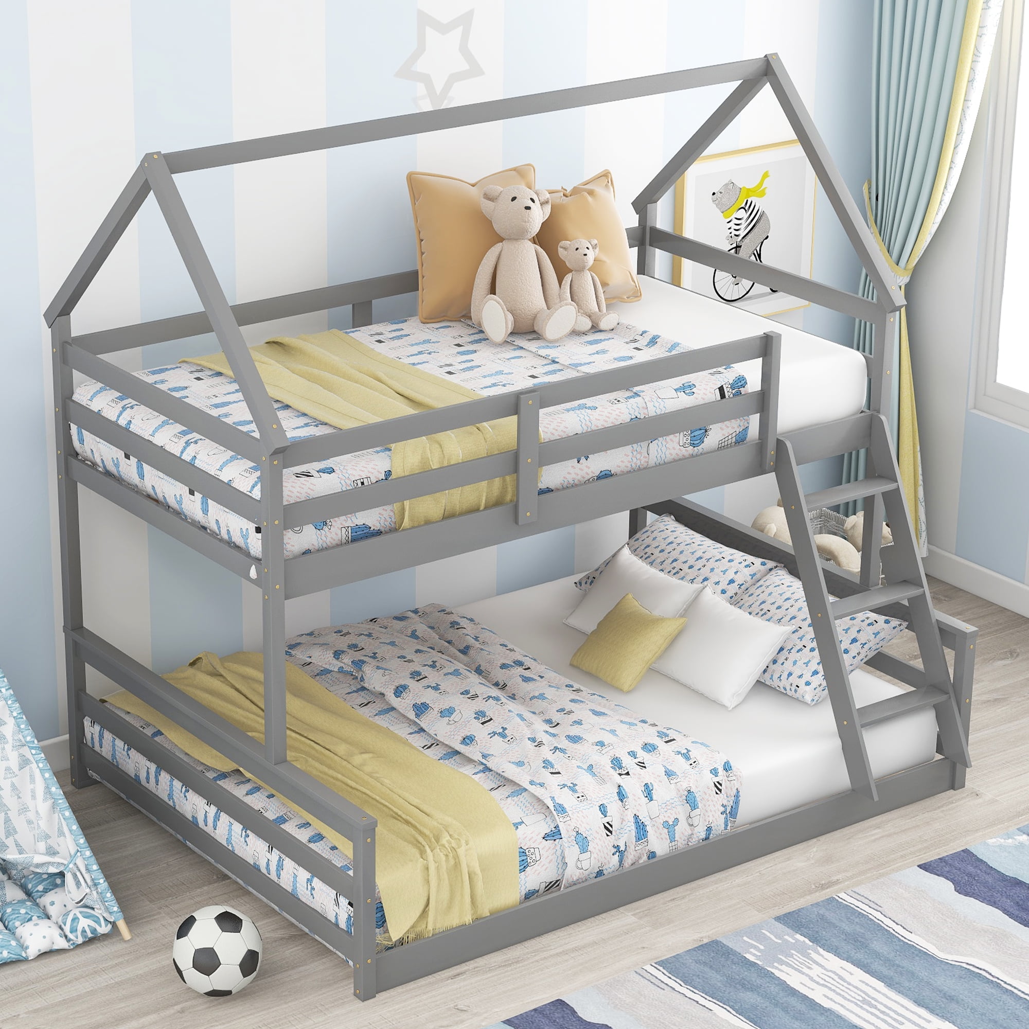 EUROCO Pine Wood Twin over Full Bunk Bed, House-Shaped for Kids Teens Bedroom, Gray