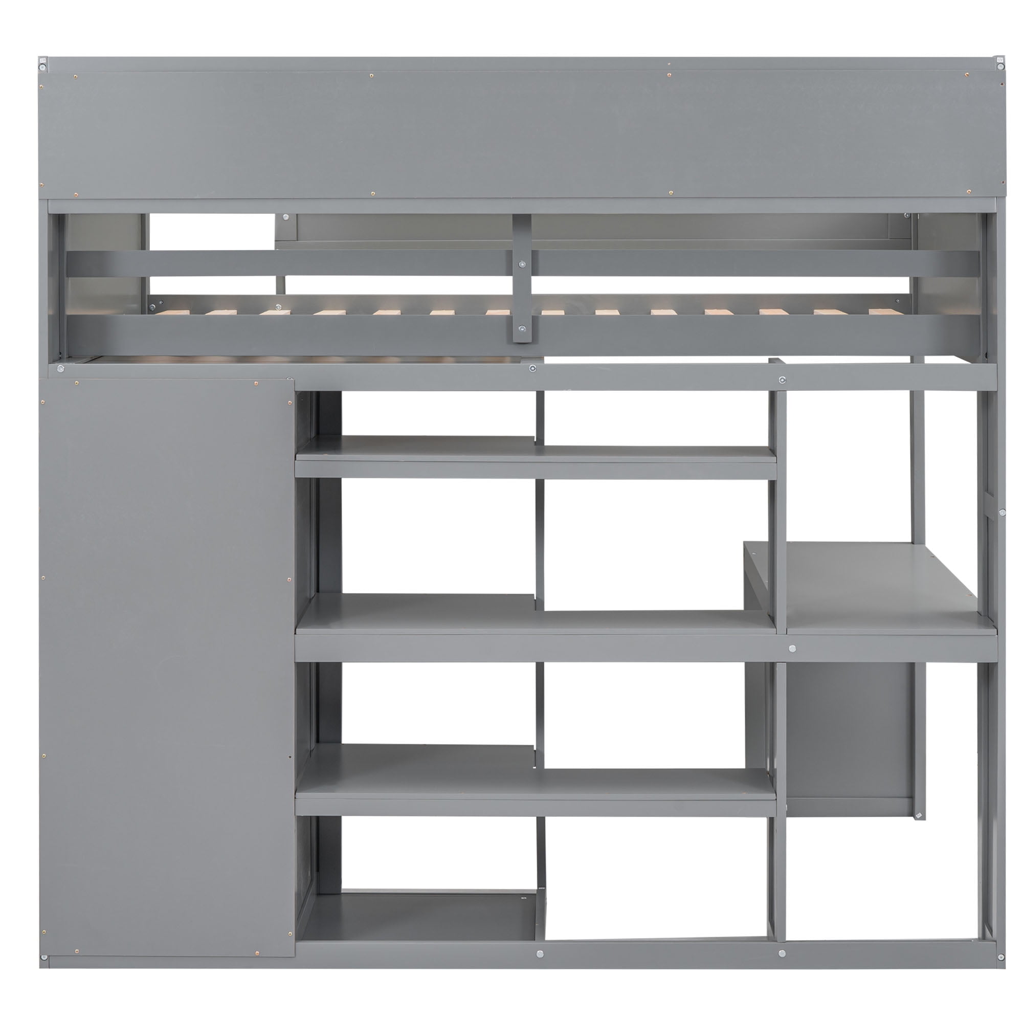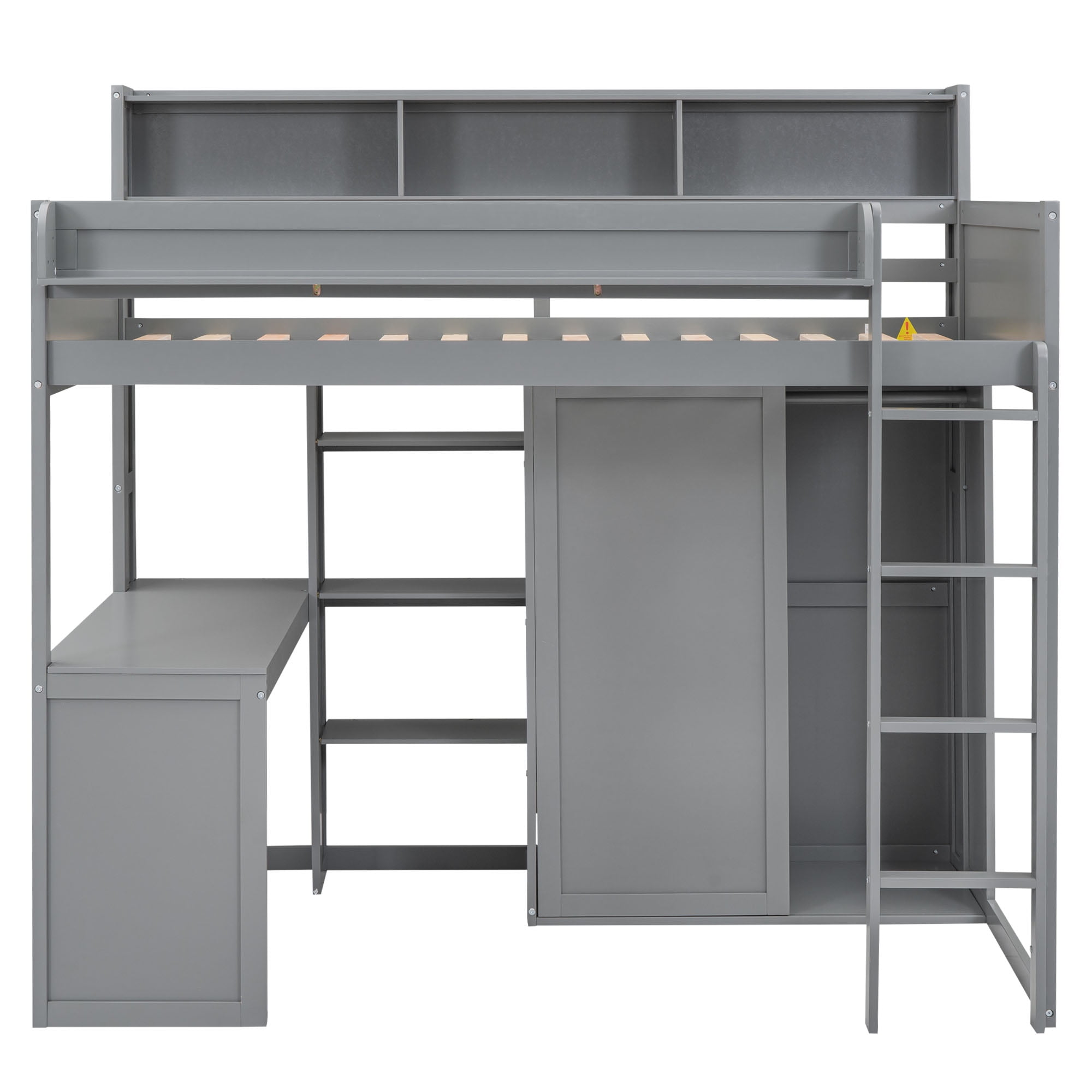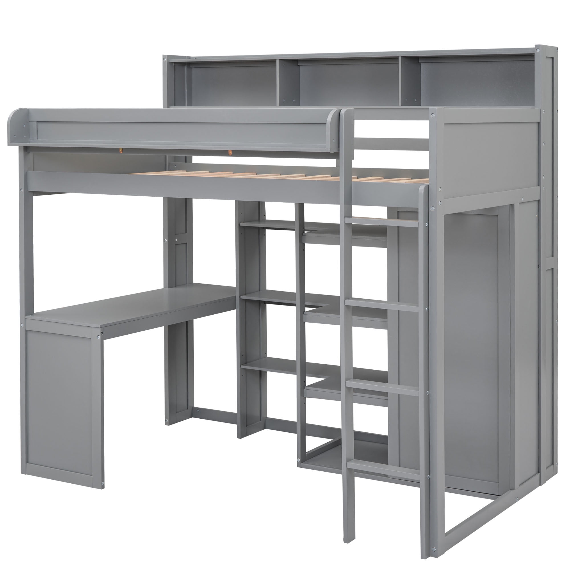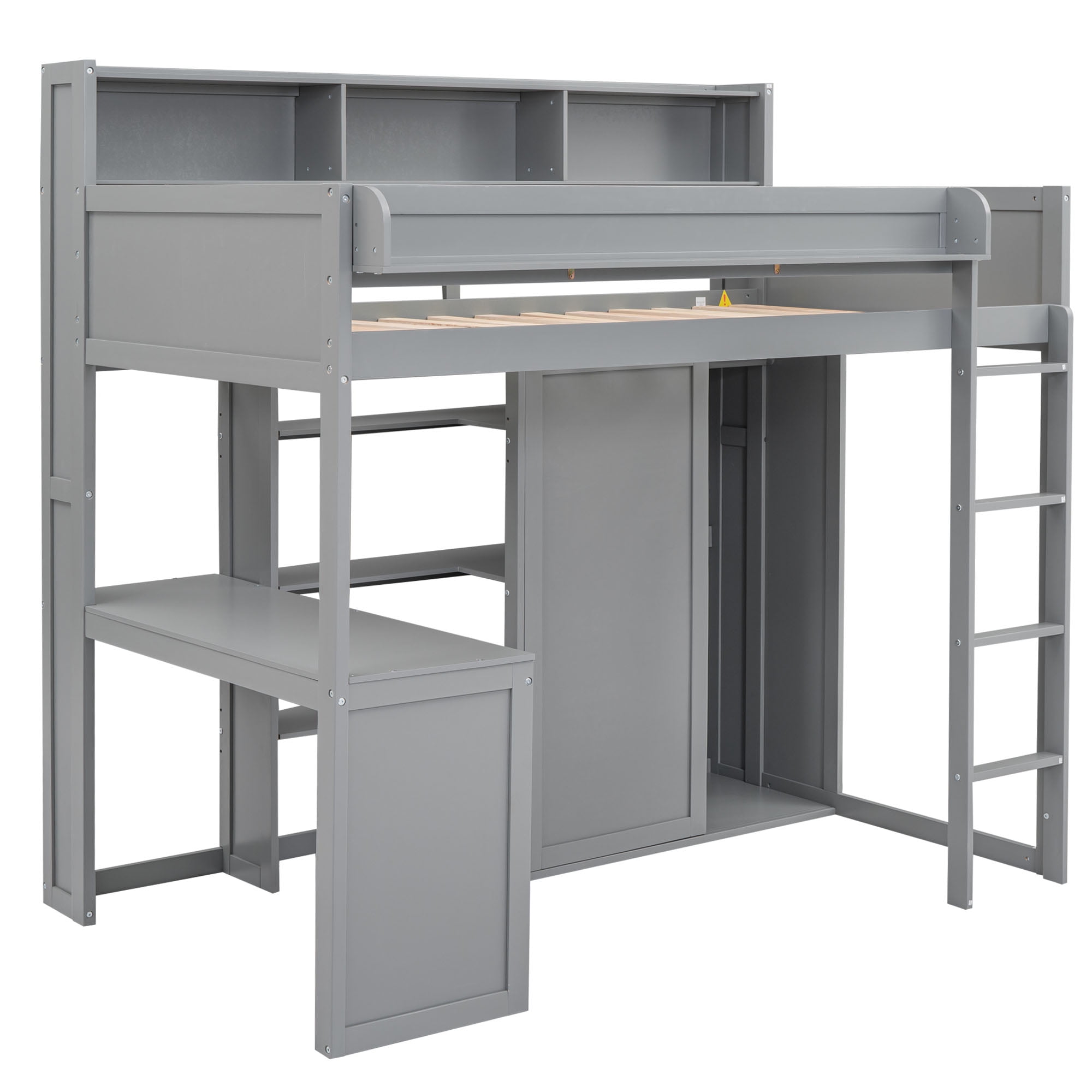 Euroco Pine Wood Twin Size Loft Bed with Desk, Wardrobe with Clothes Hanger and Display Shelves for Kids Teens Bedroom, Gray