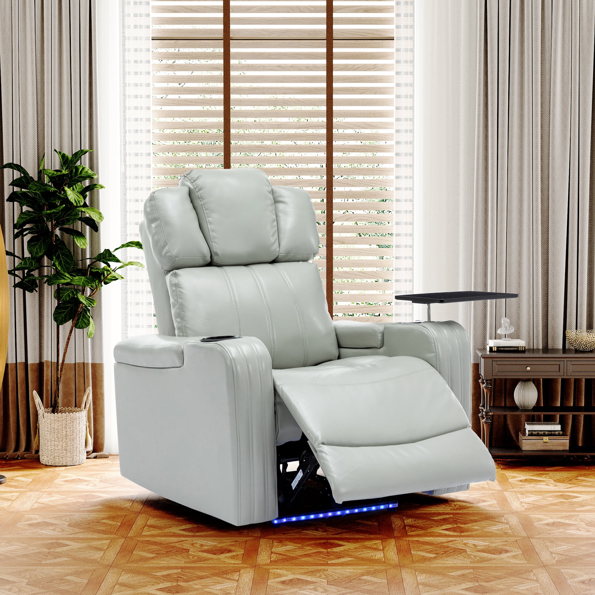 EUROCO PU Leather Home Theater Recliner,Power Recliner Adjustable Recliner with Bluetooth Speaker ,USB Ports, Tray Table, Arm Storage, footrest, Cup Holder and LED Lights,Grey