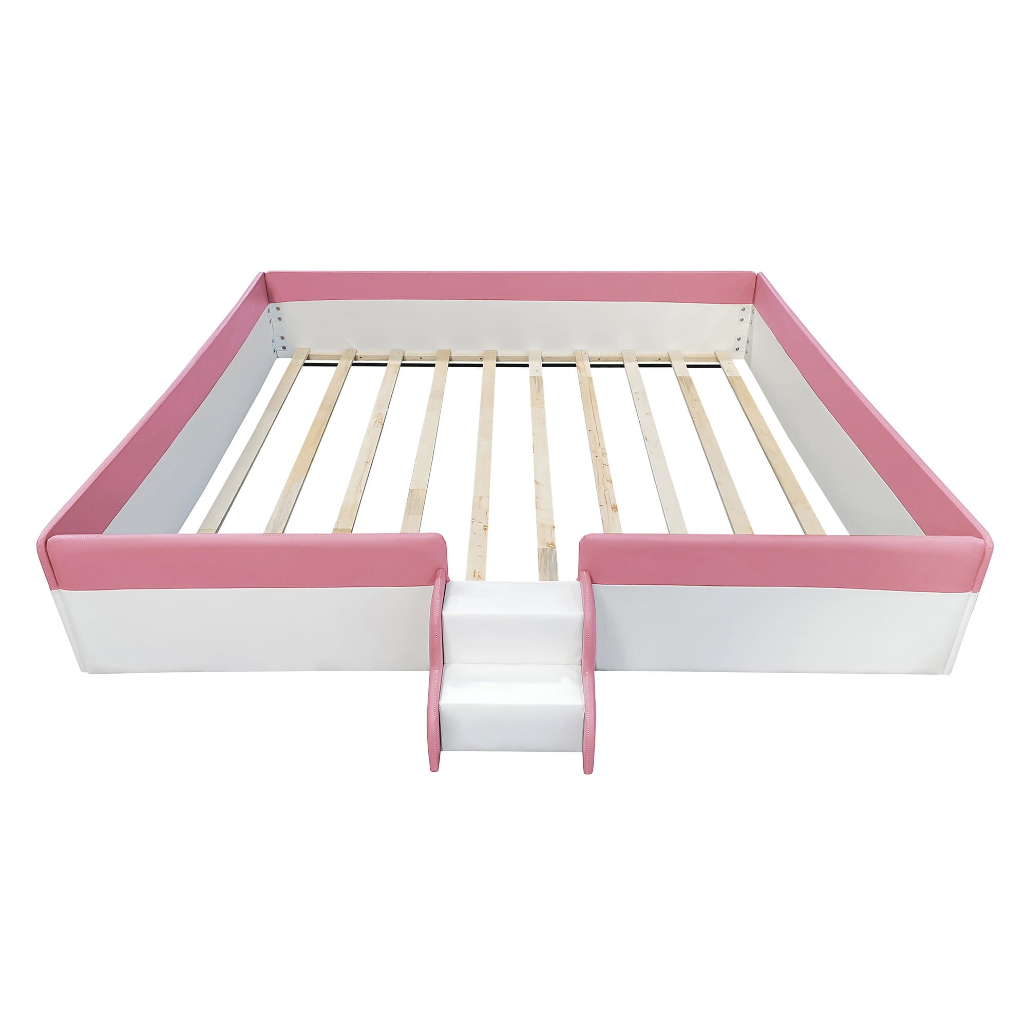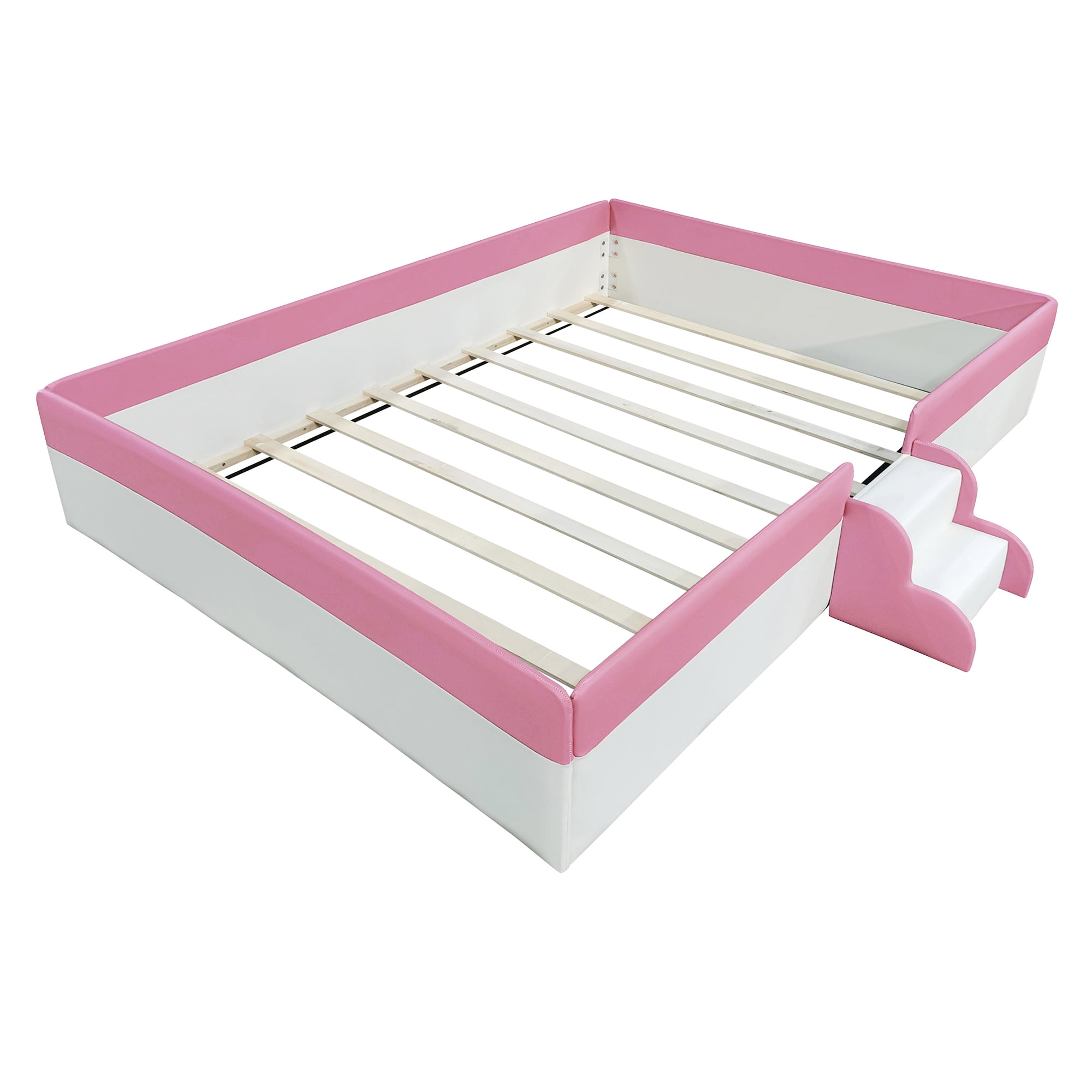 Euroco King Size Upholstered Platform Bed, Floor Bed with Fence and Stairs for Kids Teens Adults, White&Pink