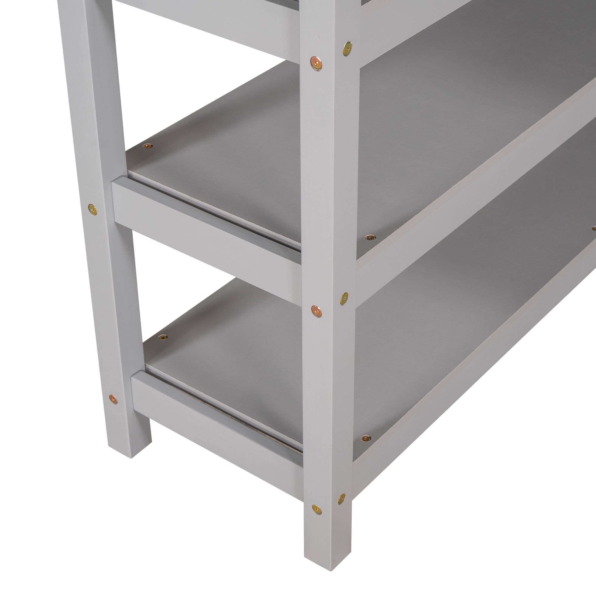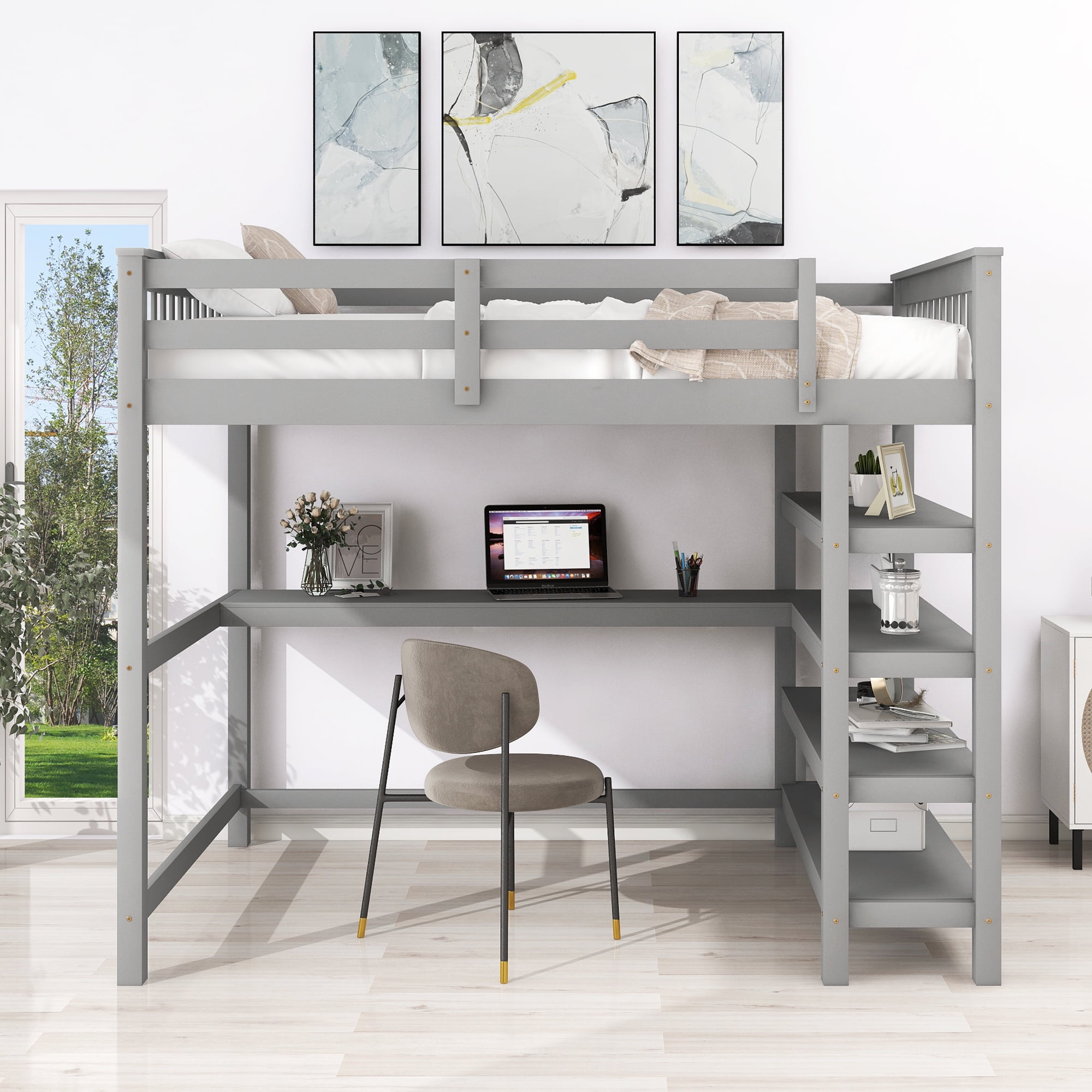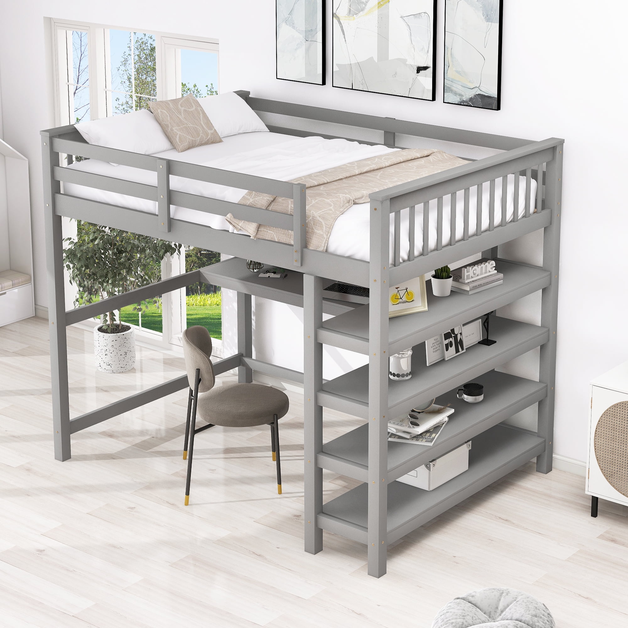 Euroco Solid Wood Full Size Loft Bed with Desk and 4-Tier Storage Shelves for Kids Teens Adults Bedrrom, Gray