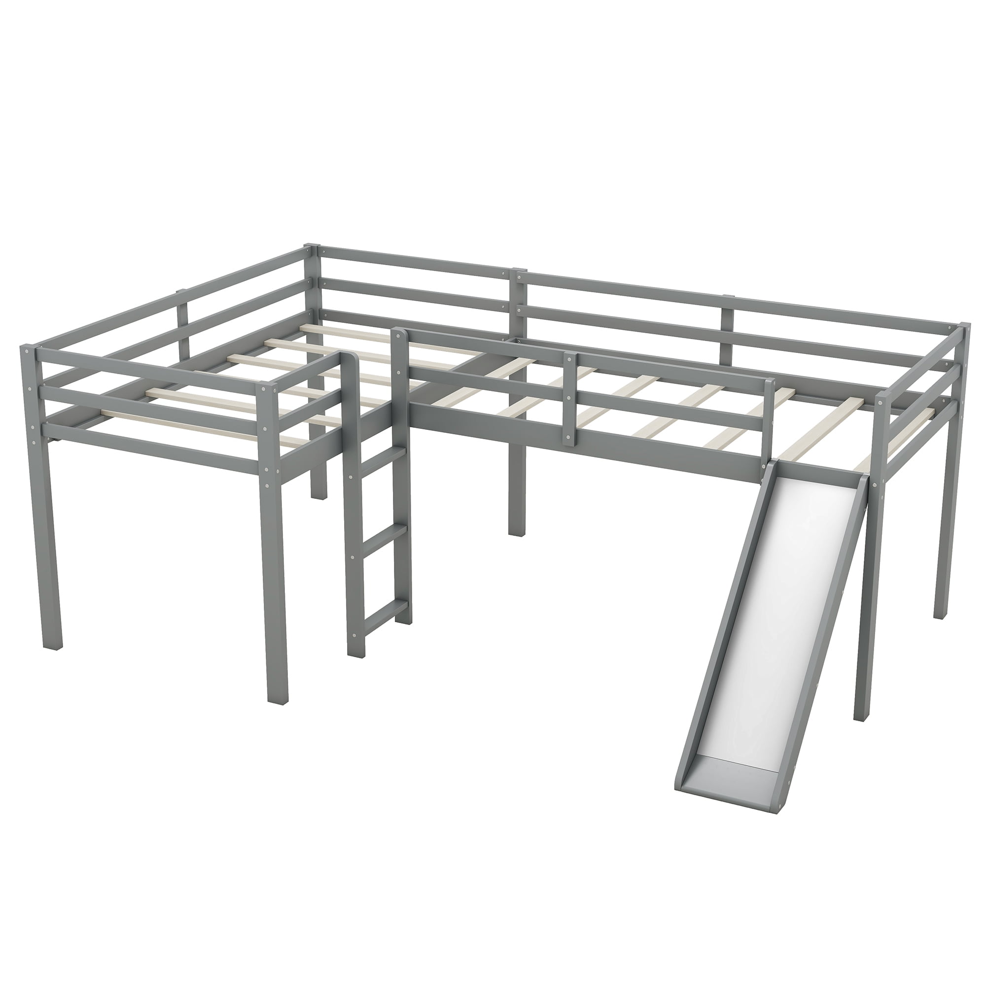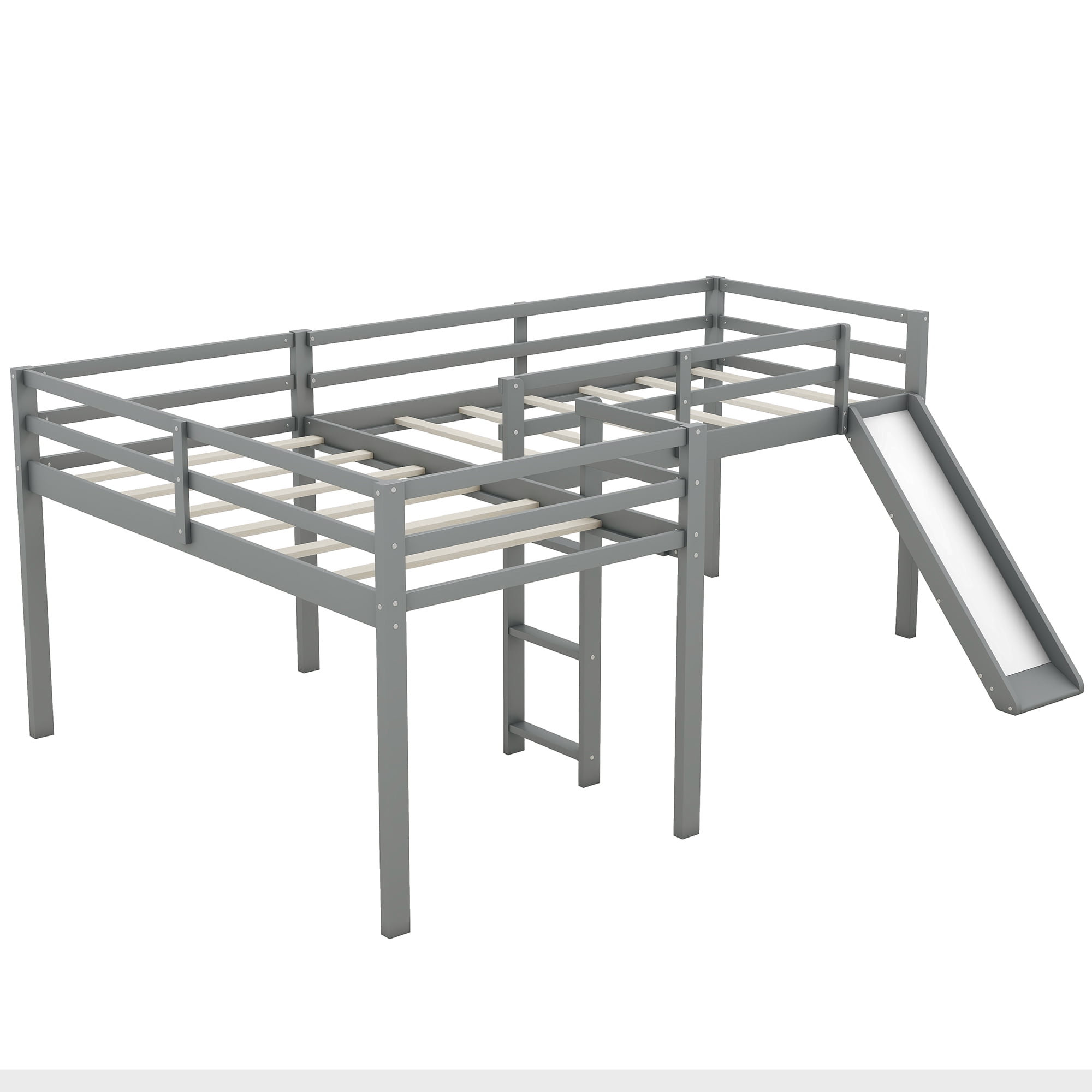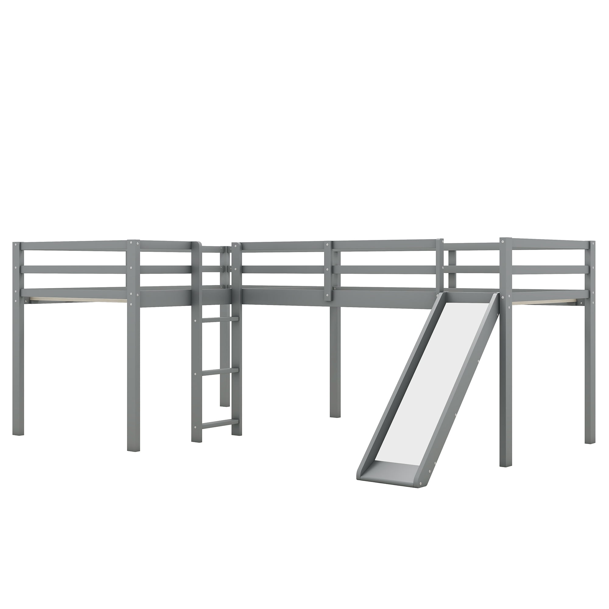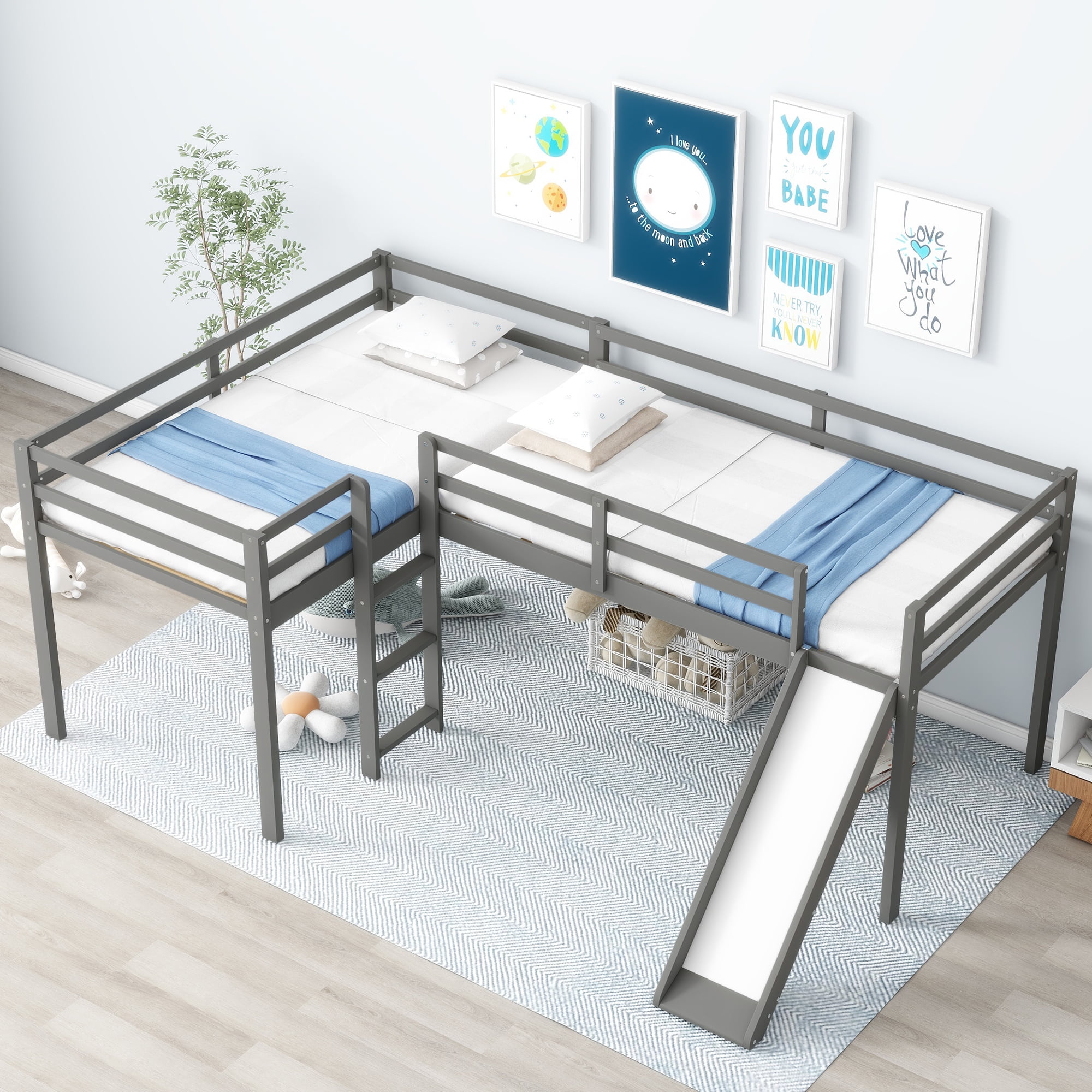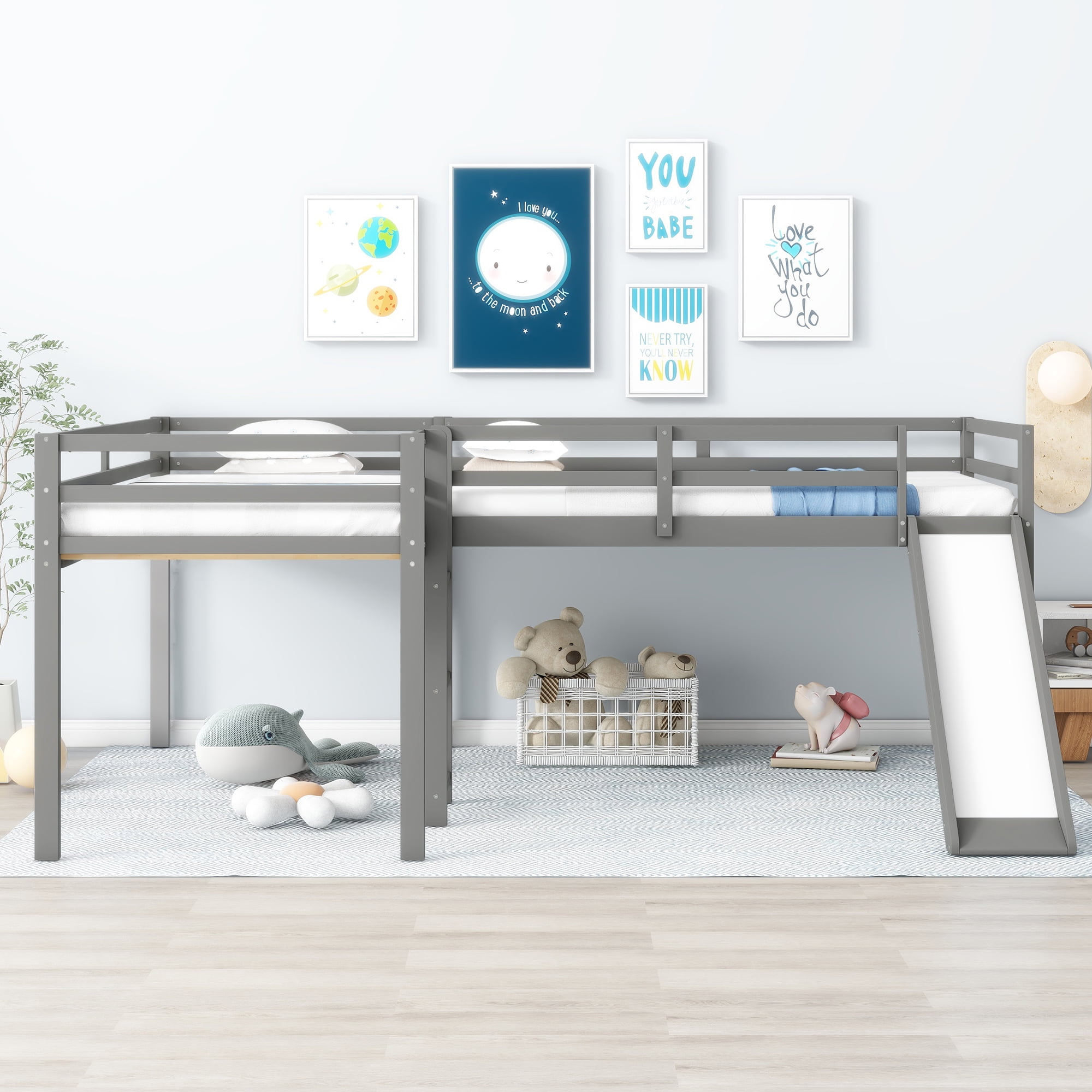 [Space-Saving]: This l-shaped low loft bed is equipped with two storage shelves under the bed and you can put books, toys and other accessories on them. Pull out of the shelves, and you can also use the room under the loft for extra storage. [Two Moveable Shelves]: The two tier shelves are the perfect space to store all sorts of toys and daily necessities. The shelves are moveable with wheels so that it will be easy for you to place them as you wish. [Safety for Children]: The bed is equipped with high and full length guardrails around the two bed to keep child safe. Slide and two ladders will give kids a easy and safe access to the upper bed. [Solid Construction]: This low loft bed is made from solid pine wood and MDF, which will stand the test of time to serve your family for many years. The two built-in ladders will also be used for fixing structure of this loft bed. [Easy to Assemble]: All the parts and tools needed for the assembly will be in the packages. It will be useful for you to assembly this simply bed. You just need to follow the instructions to assemble your own bed. Size: Twin Overall Product Dimension: 118.1″L*78.3″W*43.3″H Bed Inner Size: 75.1″x 39.3″ Overall Product Weight: 189lb Bed Weight Capacity: 220lb Mattress Included: No Total Height: 43.3″ Assembly Required: Yes Recommend Upper/Lower Bed Mattress Thickness: 6”