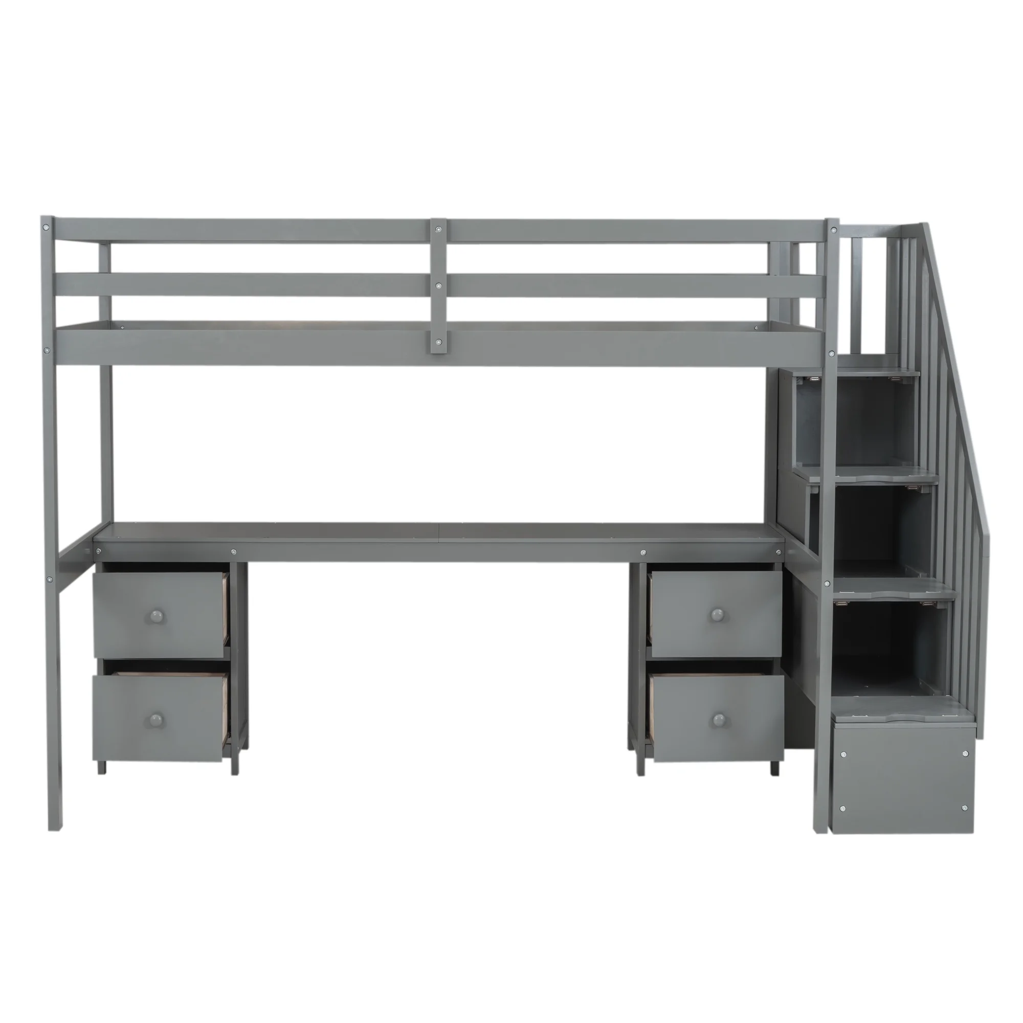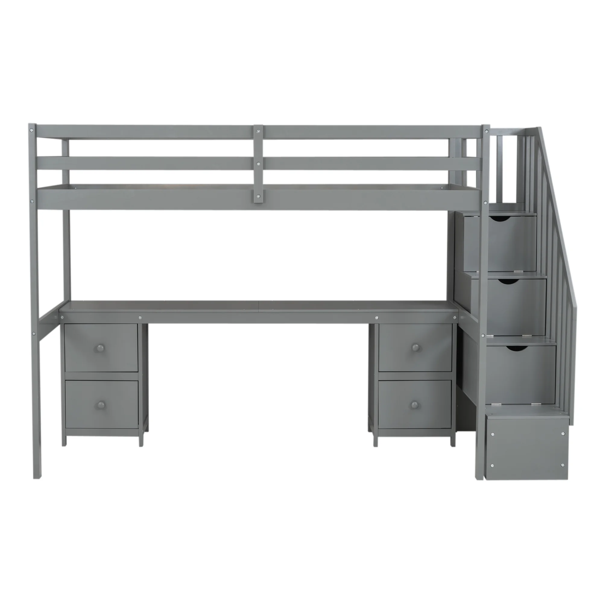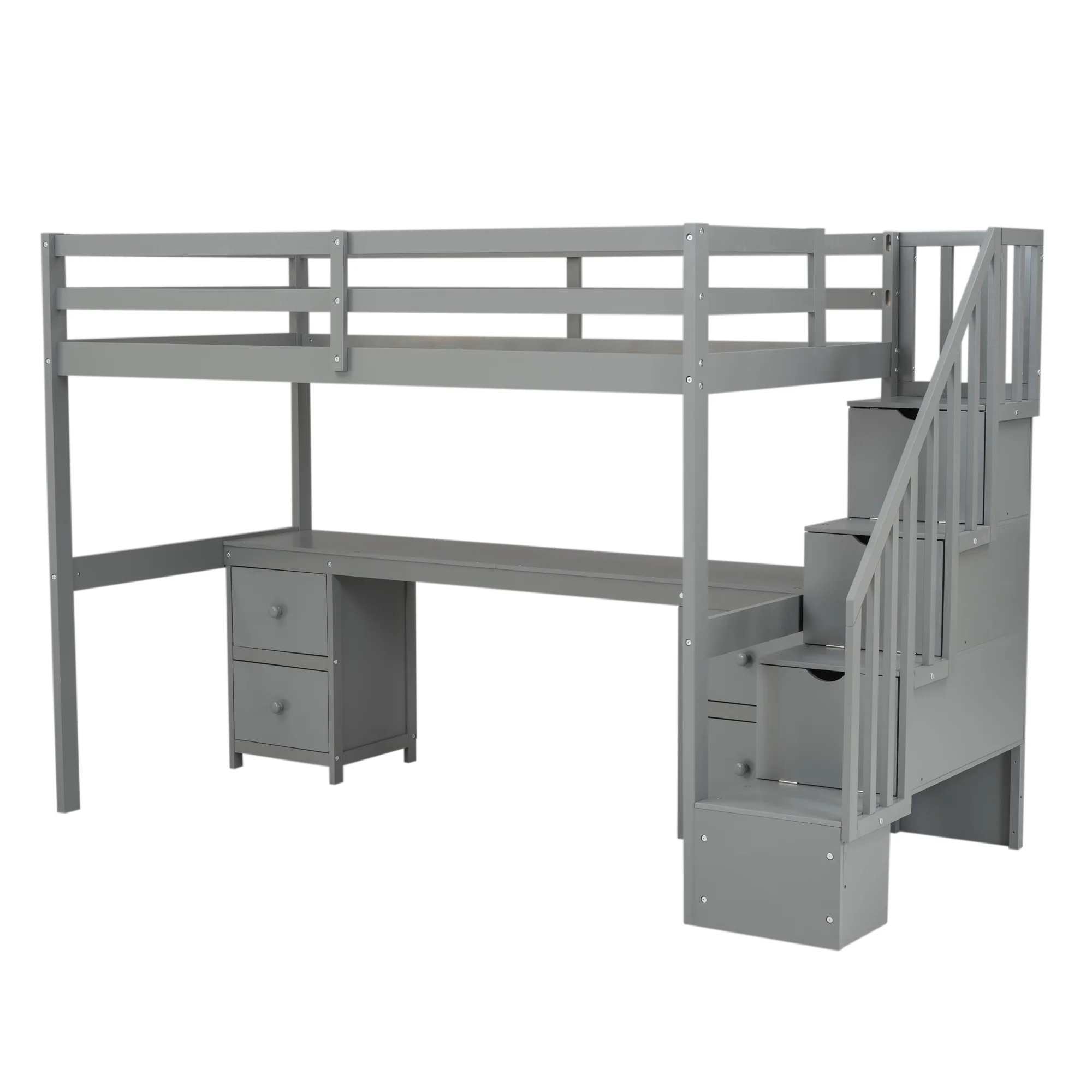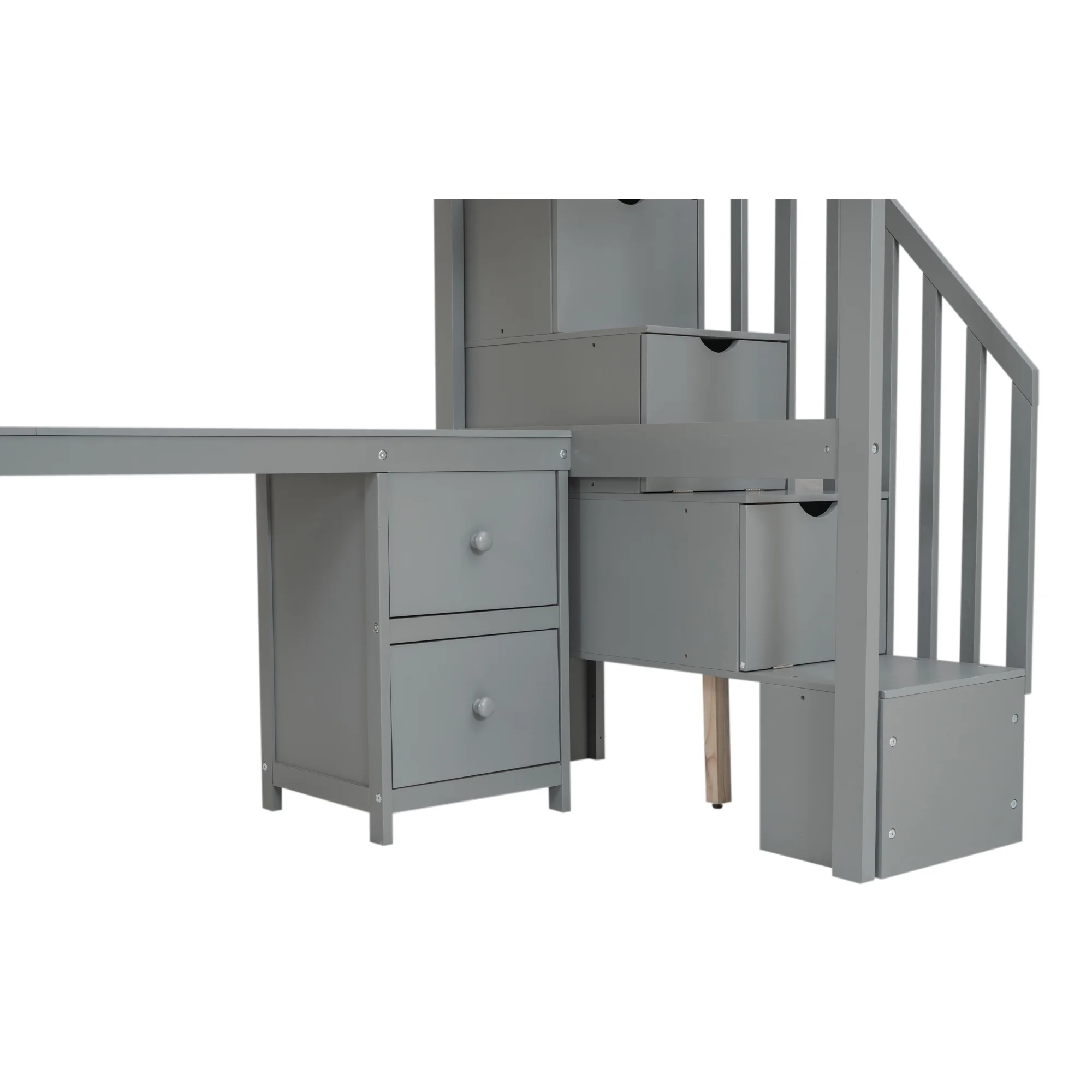 EUROCO Twin Loft Bed with Desk and 4 Drawers, Moveable Staircase for Kids Teens Adults, Gray