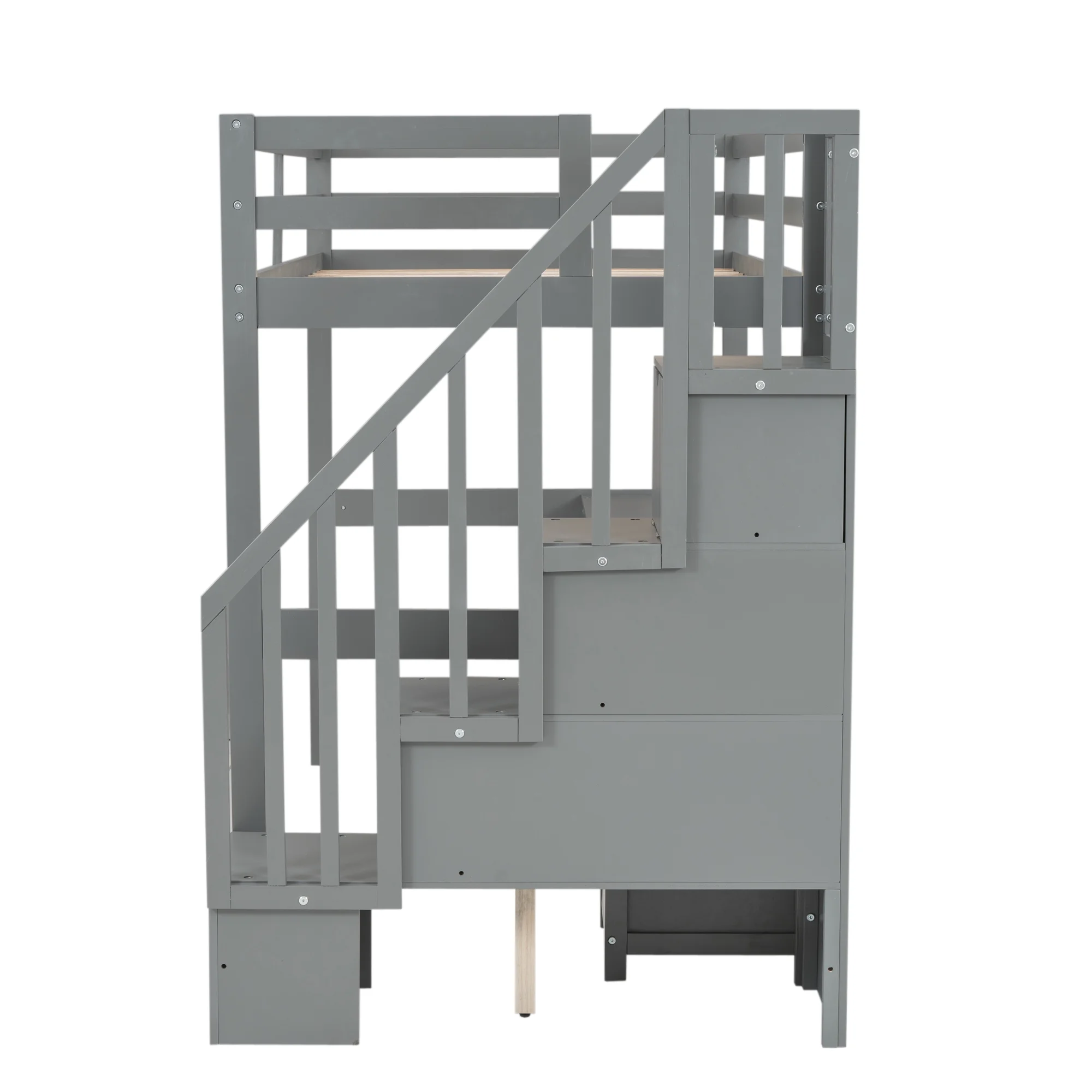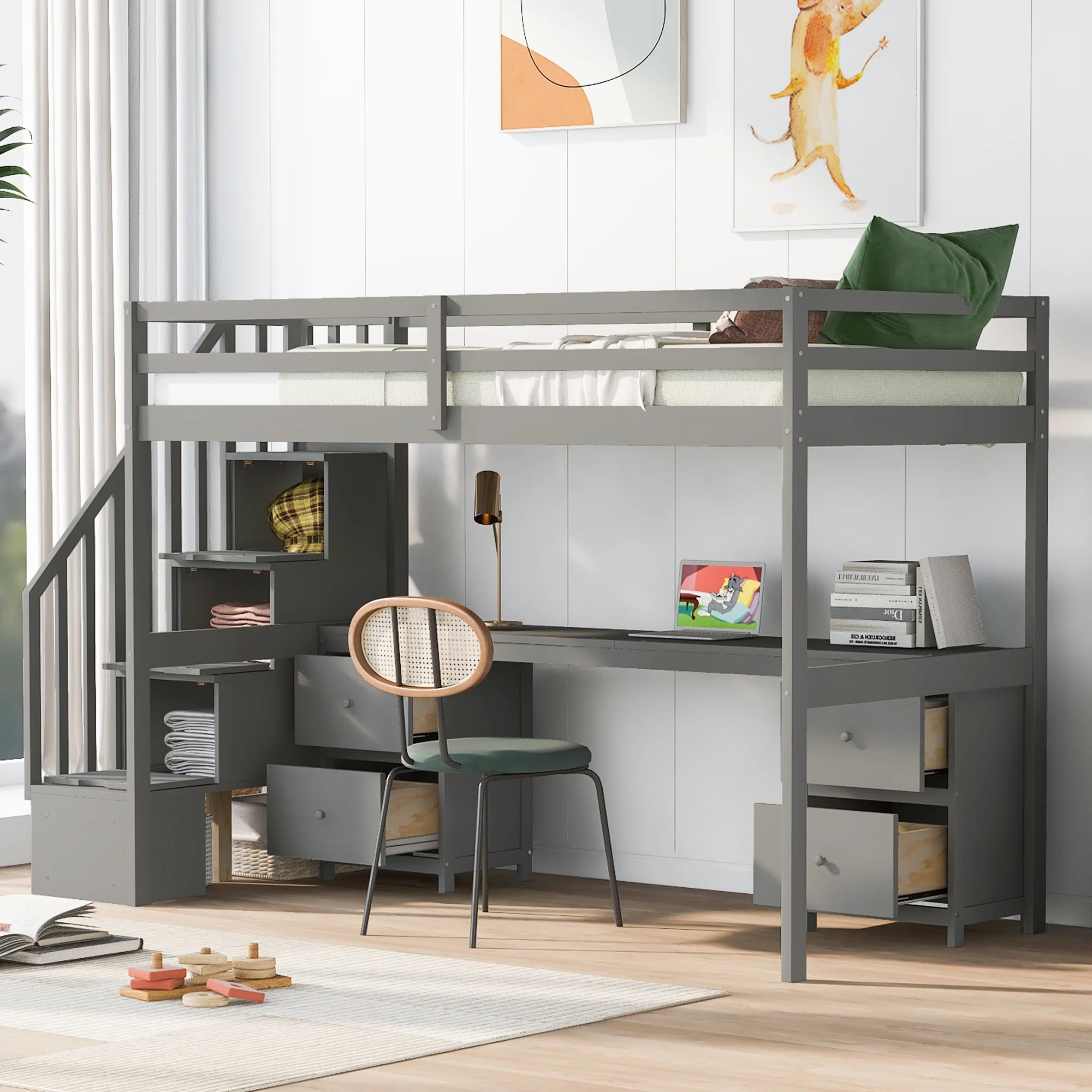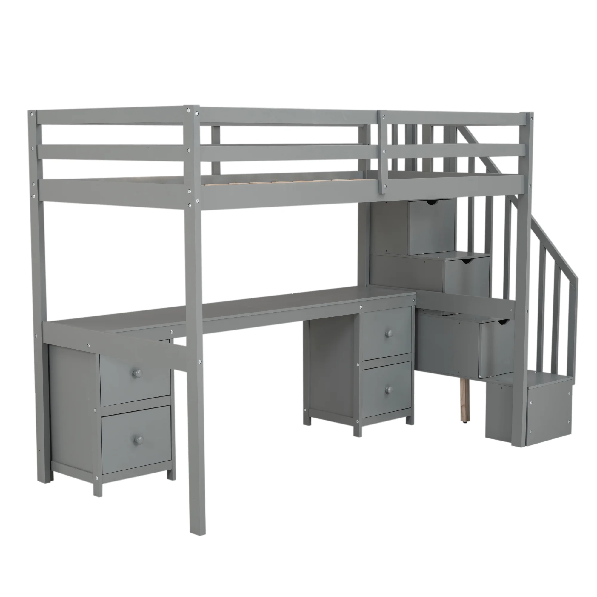 EUROCO Twin Loft Bed with Desk and 4 Drawers, Moveable Staircase for Kids Teens Adults, Gray