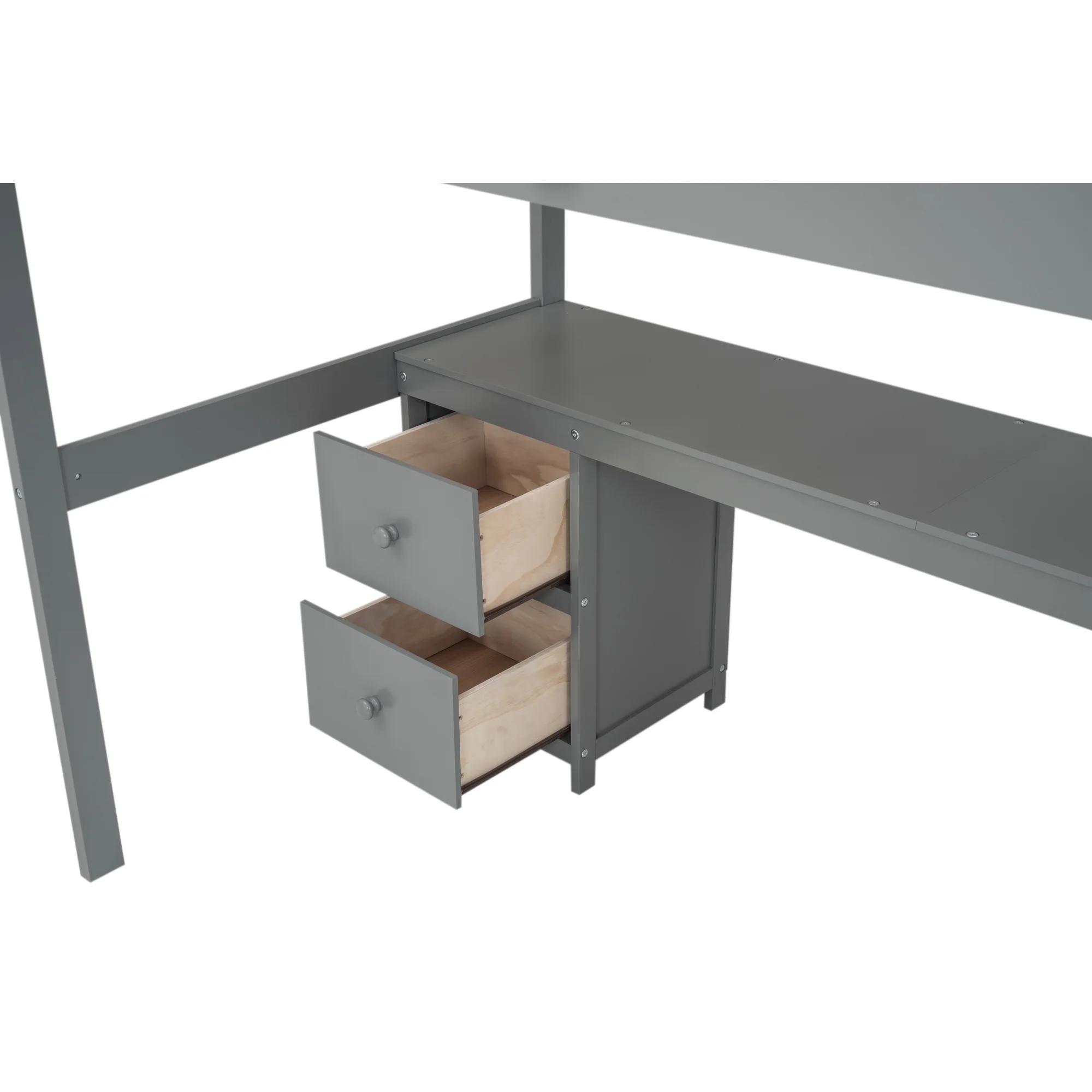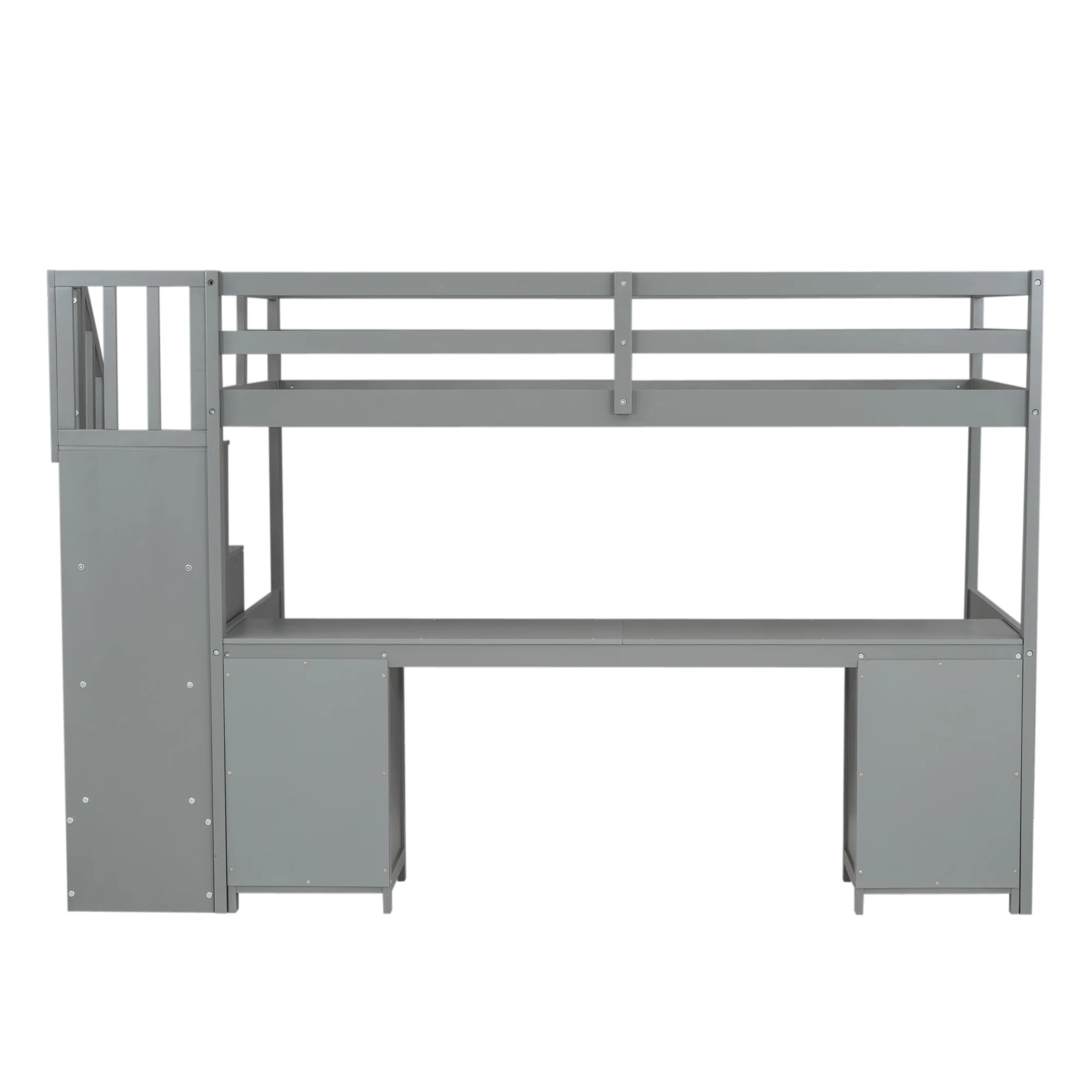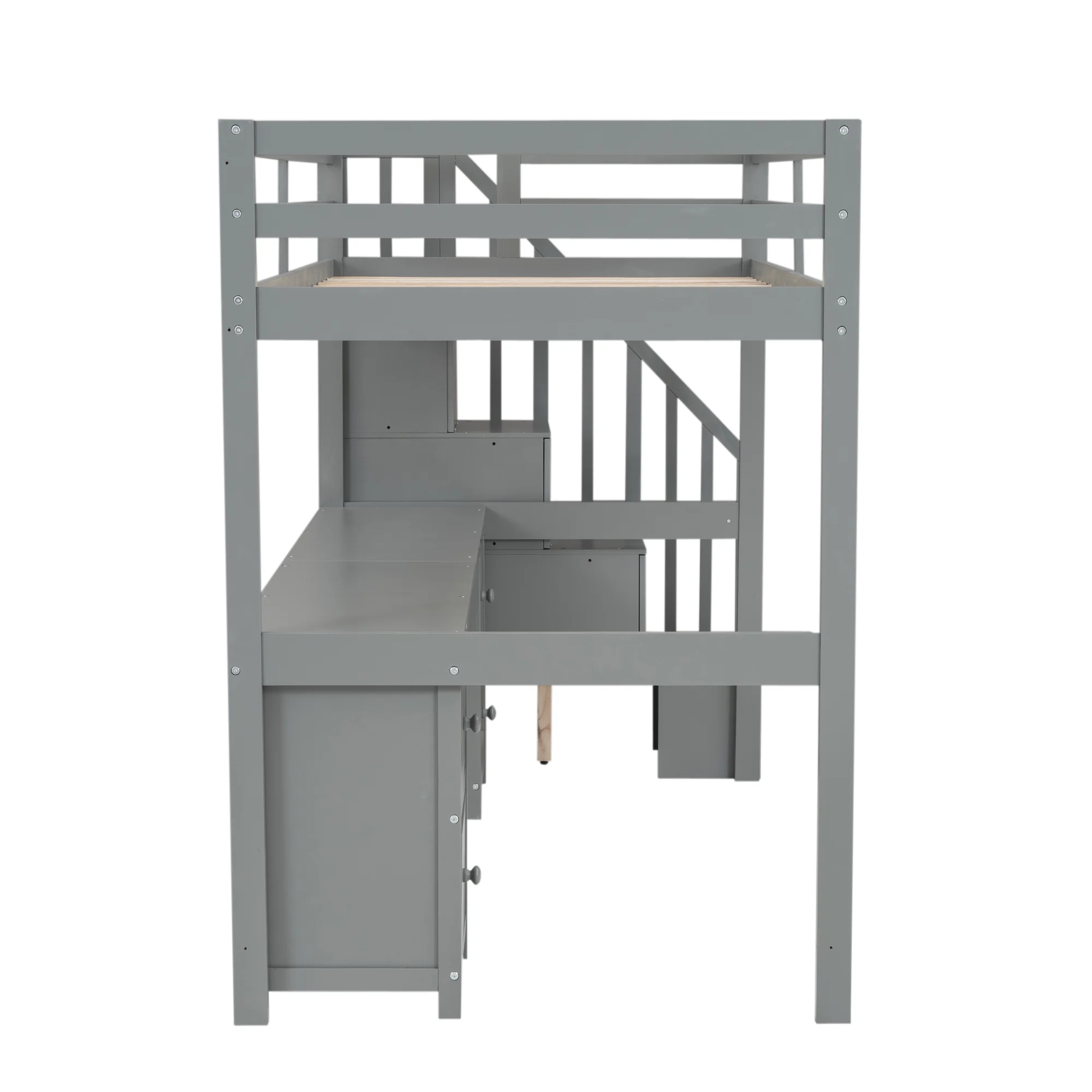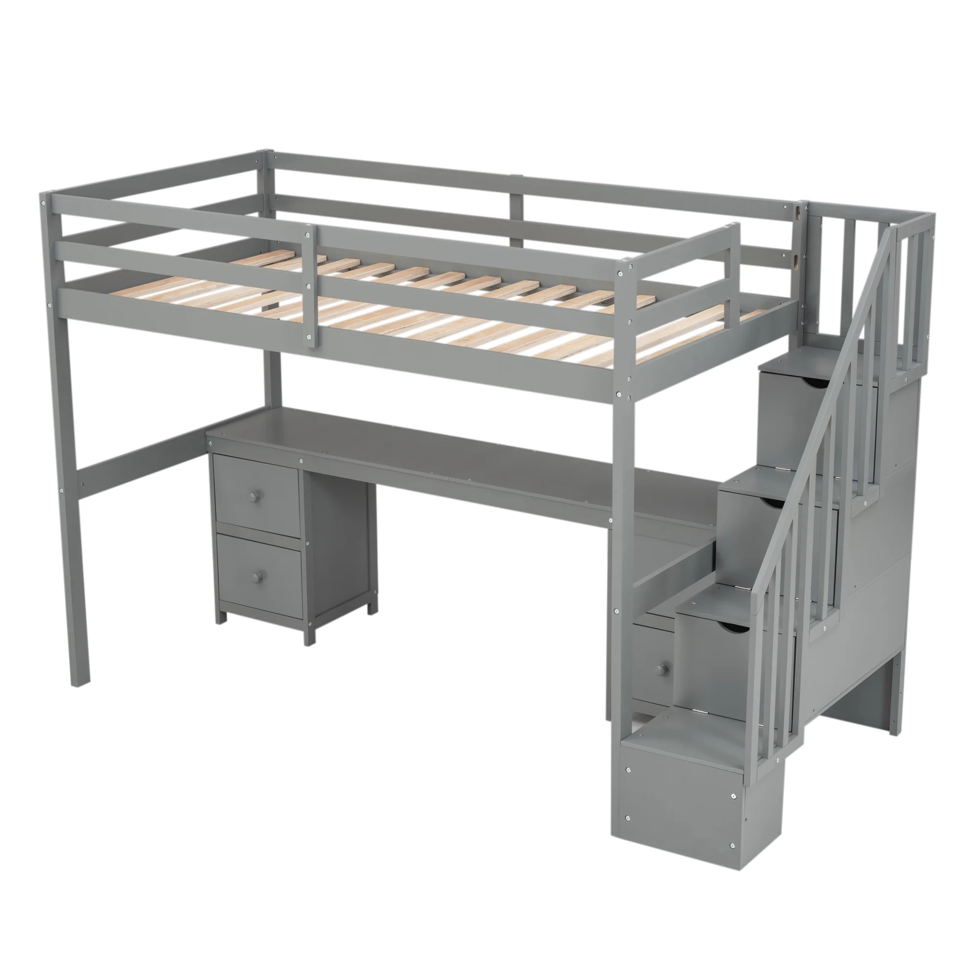 EUROCO Twin Loft Bed with Desk and 4 Drawers, Moveable Staircase for Kids Teens Adults, Gray
