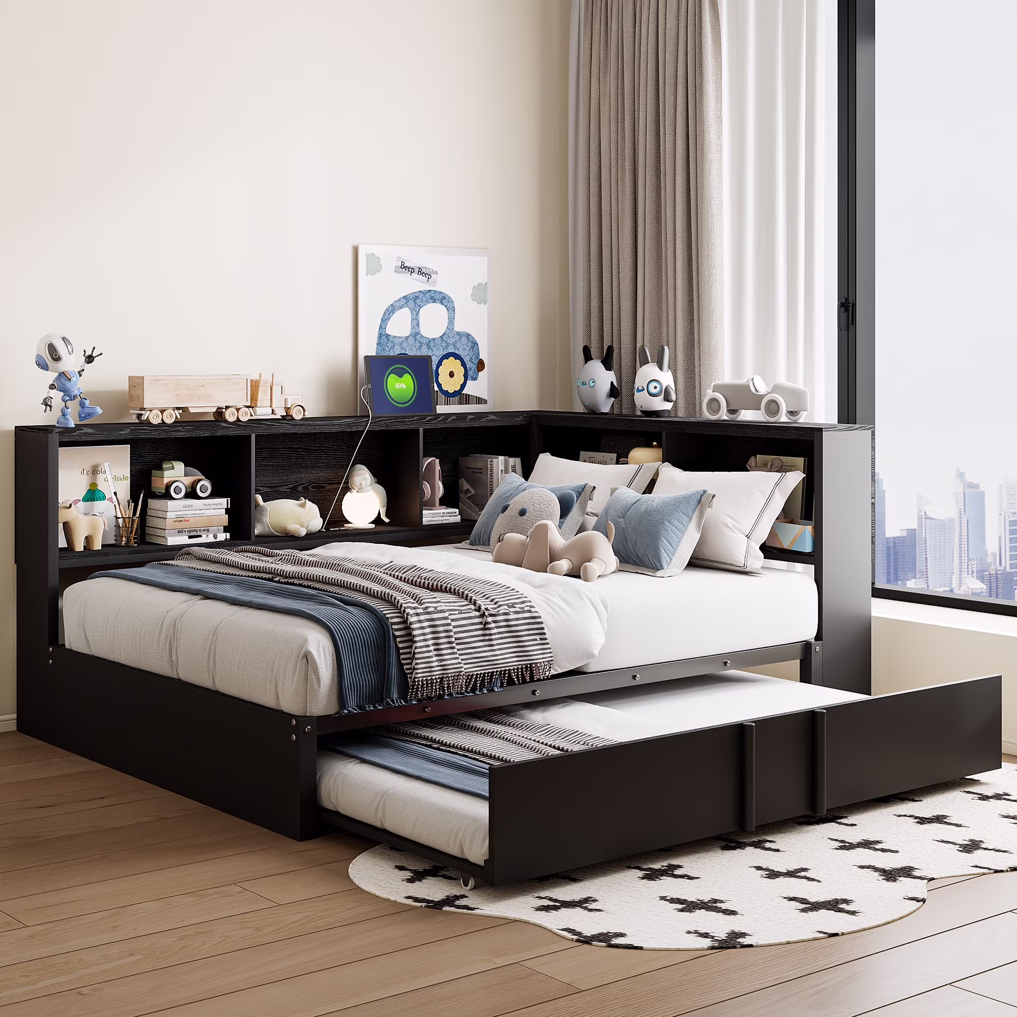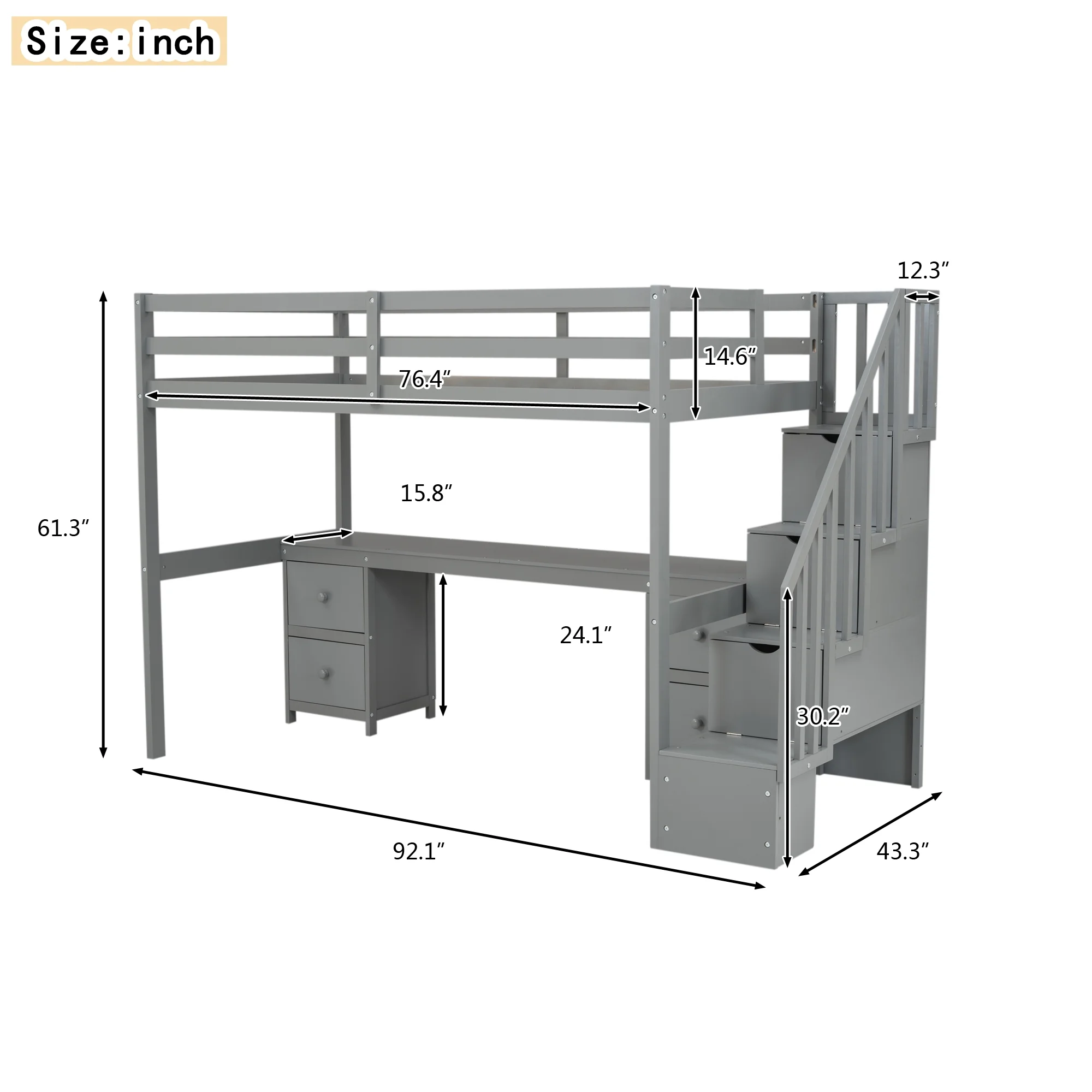 Features: [Twin Loft Bed]: This loft bed is equipped with a twin size upper bed and a moveable staircase. Built in desk with drawers can turn your living room into a working station. [Amply Storage]: Four drawers and storage staircase is good for you to store books, toys and other accessories. [Solid Construction]: Constructed from solid pine wood, this loft bed will stand the test of time and last for years. High-quality MDF and the design of the bed will be stable, without any wobbling when sleeping on it. [Easy to Assemble]: All the parts and tools needed will be packed in the package. The instruction and the accessories are also included in the package. Just follow the instruction, and then you will get your own bed. Specification: Size: Twin Overall Product Dimension: 92.1”L x43.3”W x 61.3”H Twin Size: 75” x 39” Overall Product Weight: 210.5lb Upper Bed Weight Capacity: 400lb Mattress Included: No Total Height: 61.3″ Assembly Required: Yes Recommend Bed Mattress Thickness: 6”