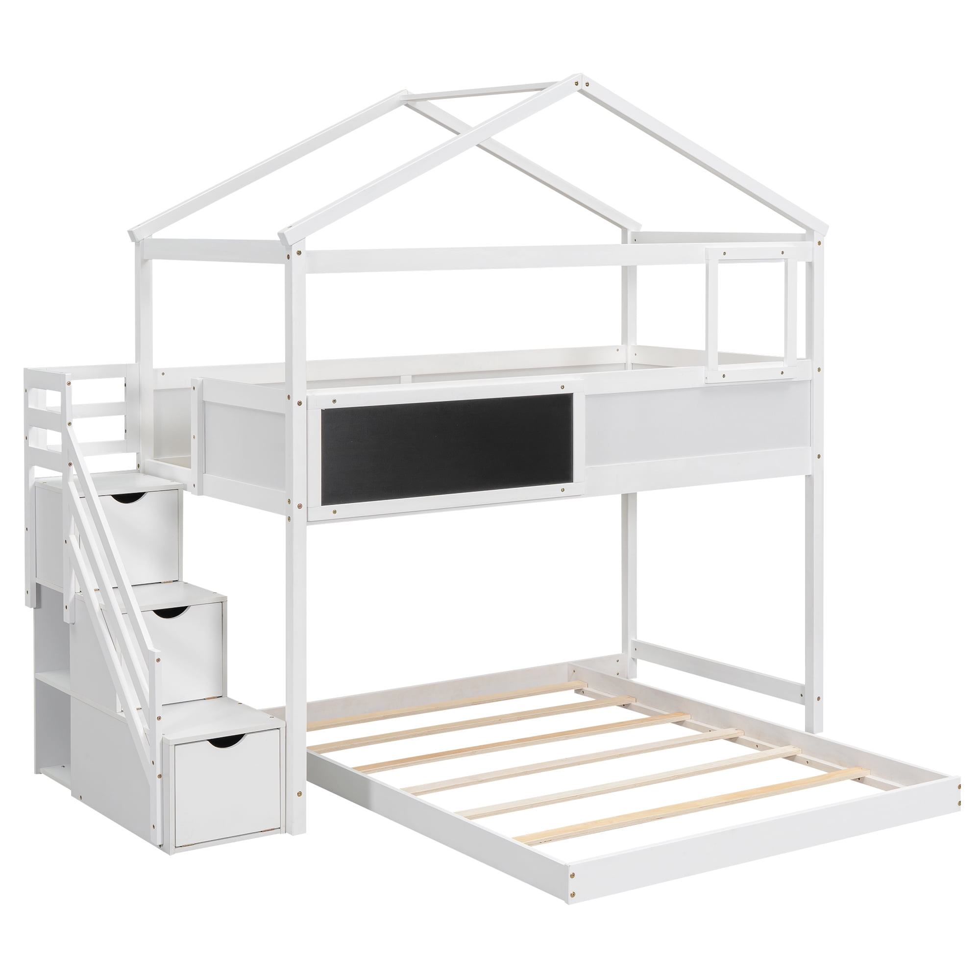 Euroco Twin over Full House Bunk Bed with Storage Staircase and Writting Blackboard for Kids Teens Bedroom, Moverable Lower Bed, White
