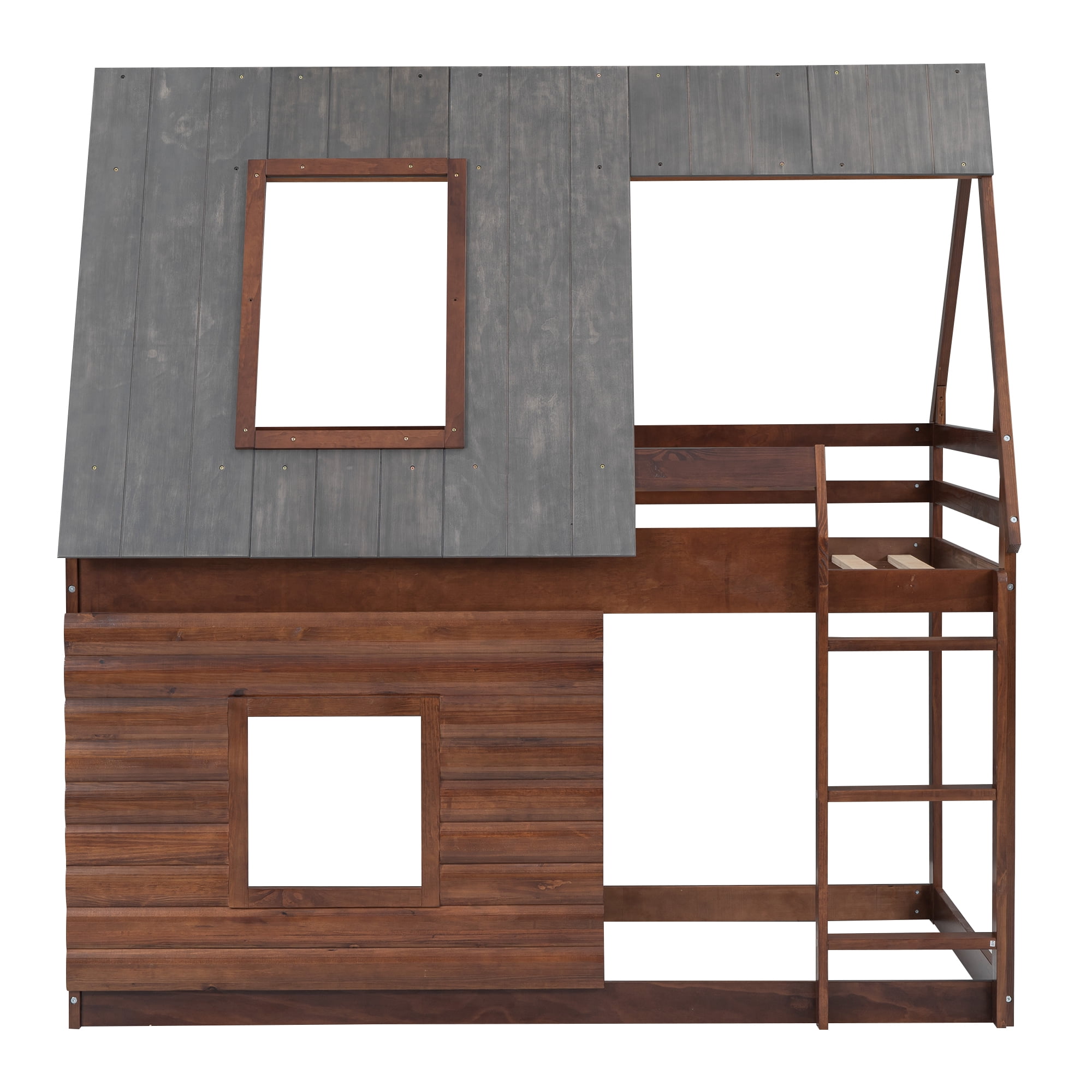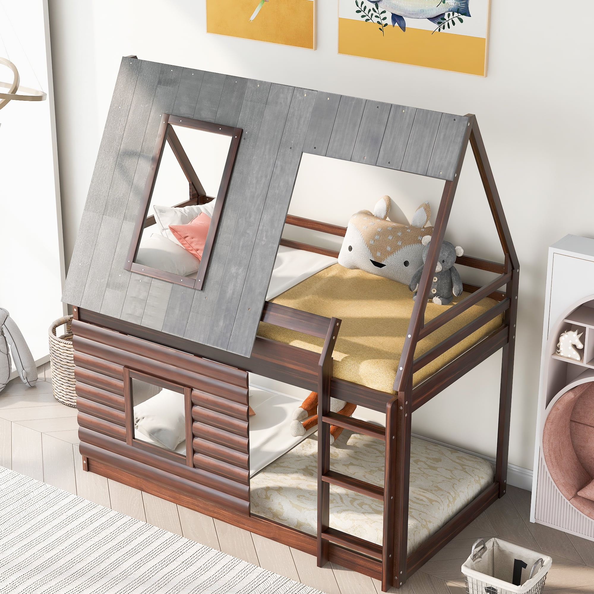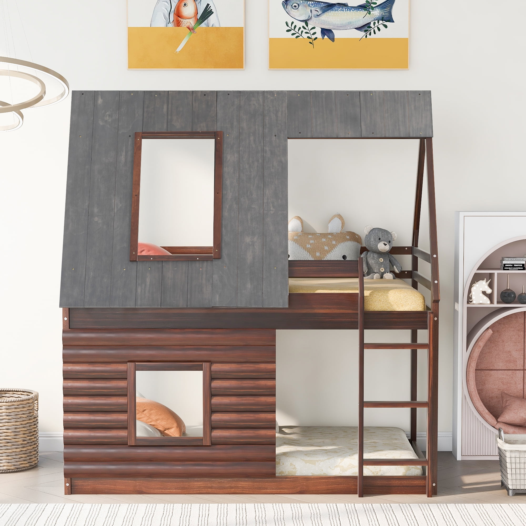 EUROCO Twin over Twin House Bunk Bed with Roof for Kids Teens Bedroom, Grey