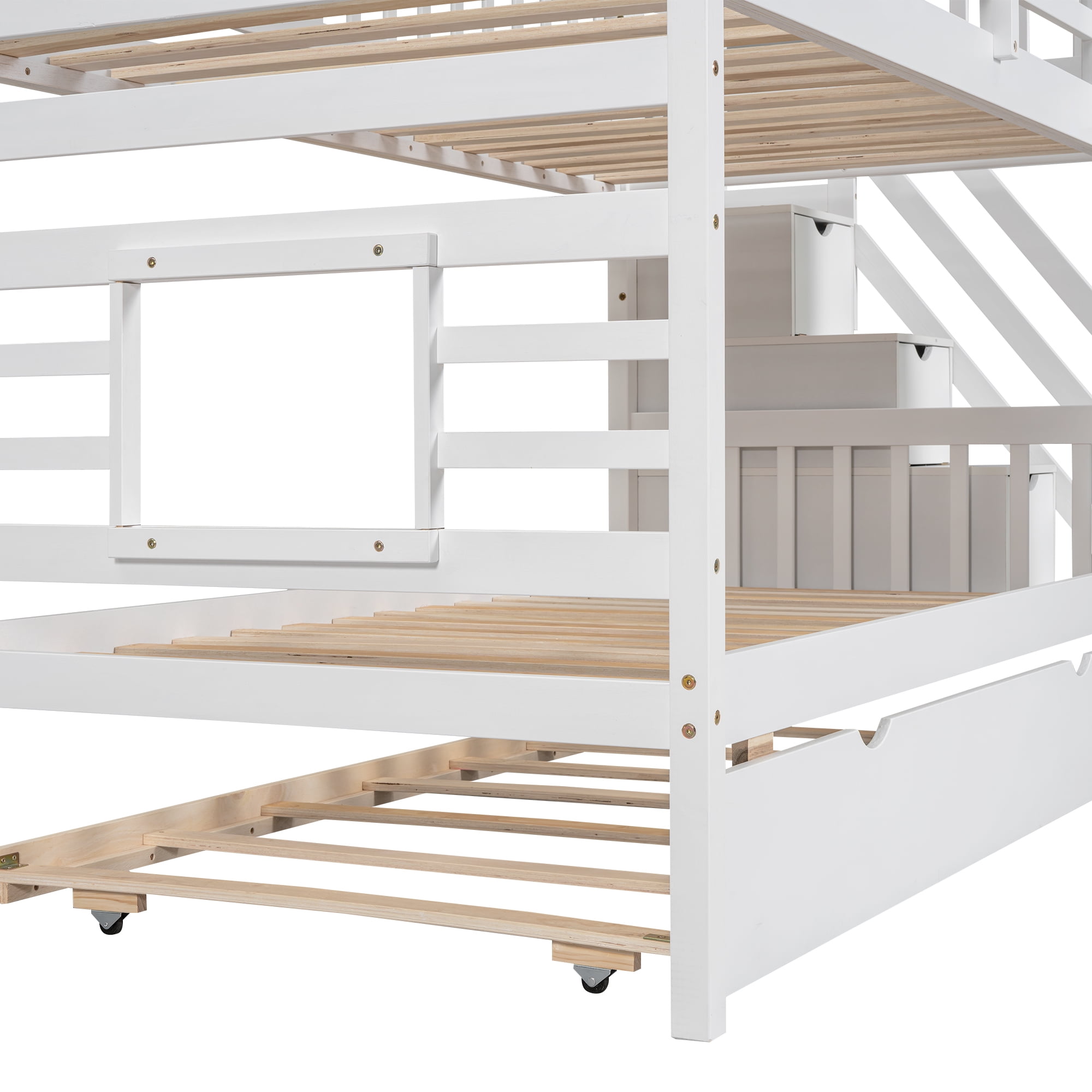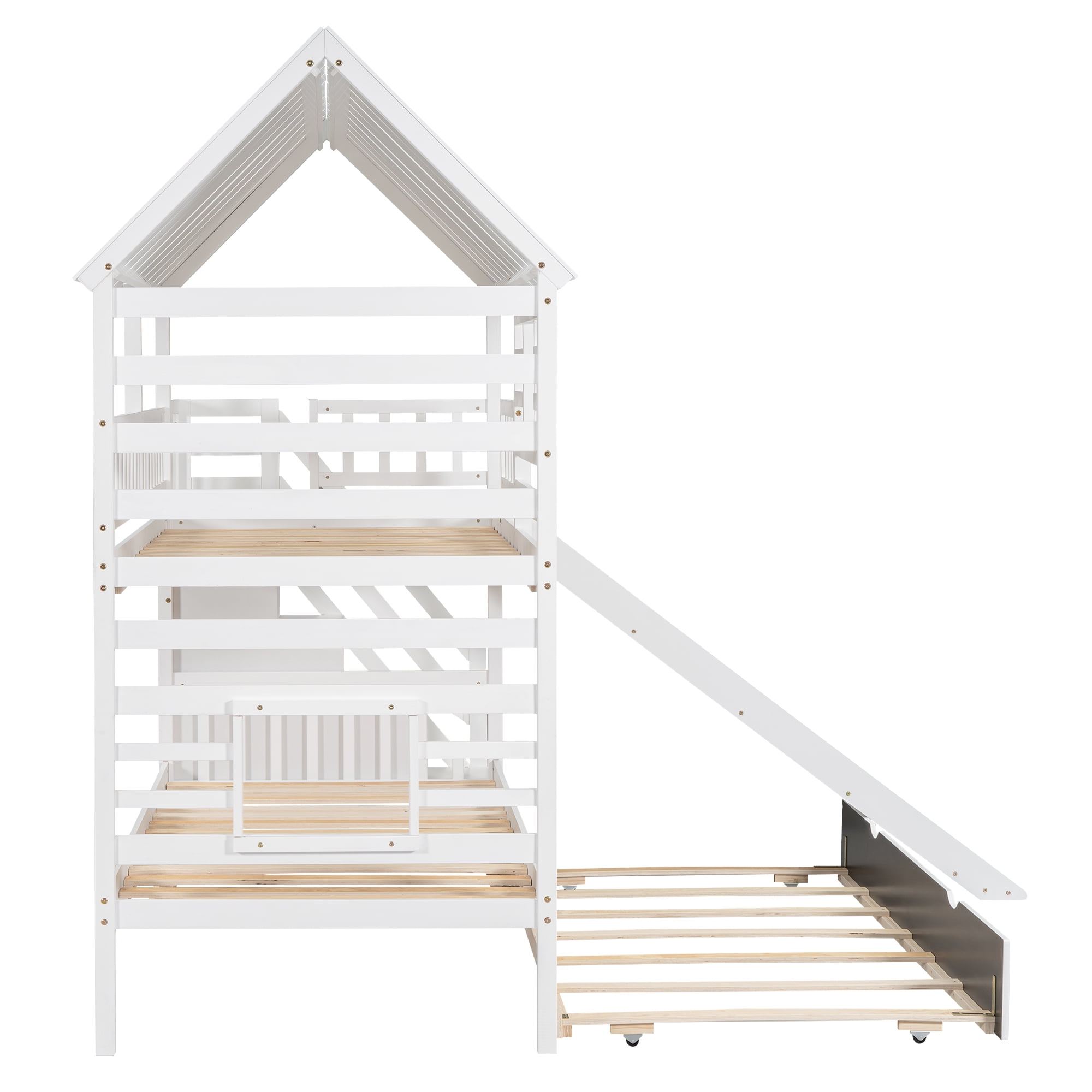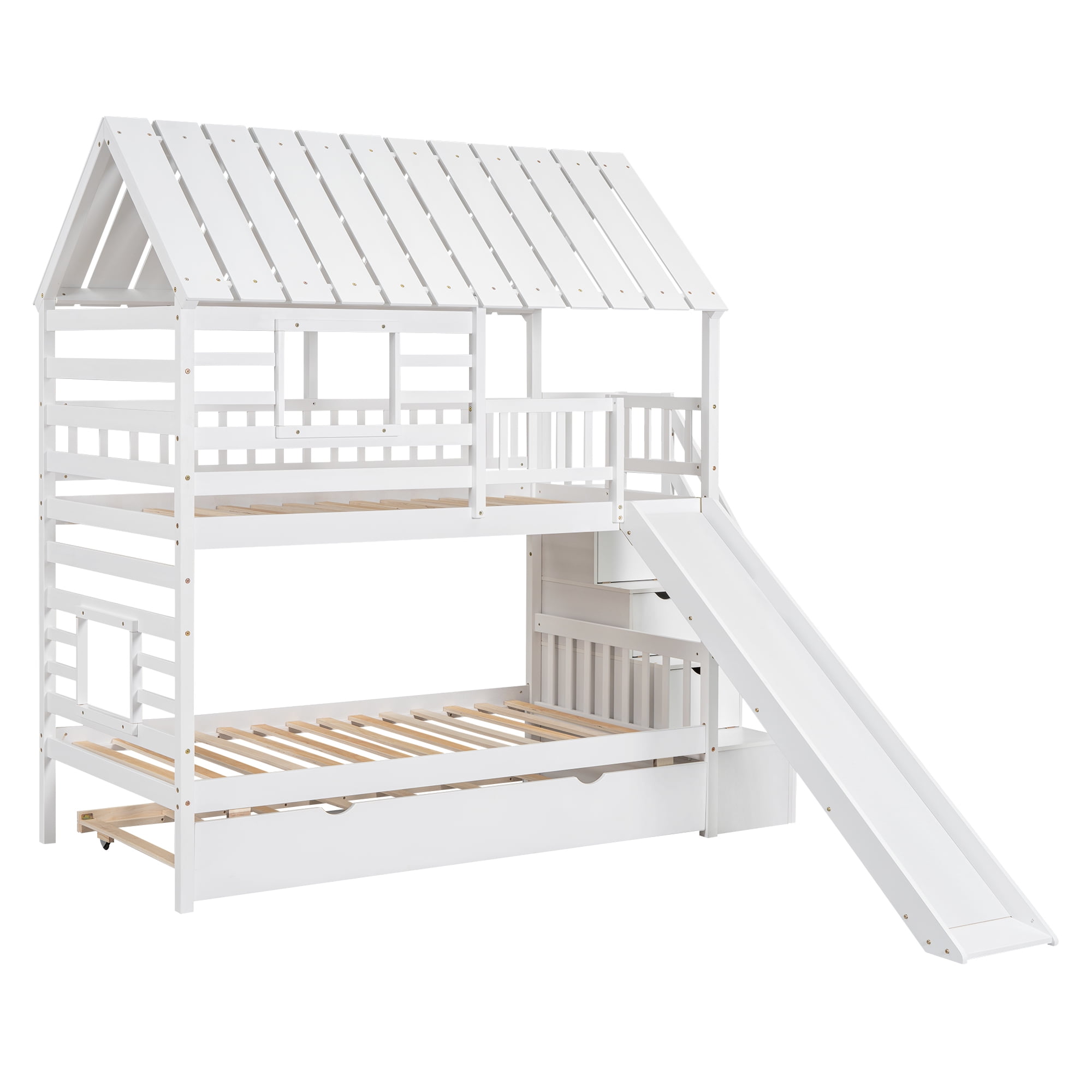 EUROCO Twin over Twin House Bunk Bed with Trundle and Staircase for Kids Teens Bedroom, White