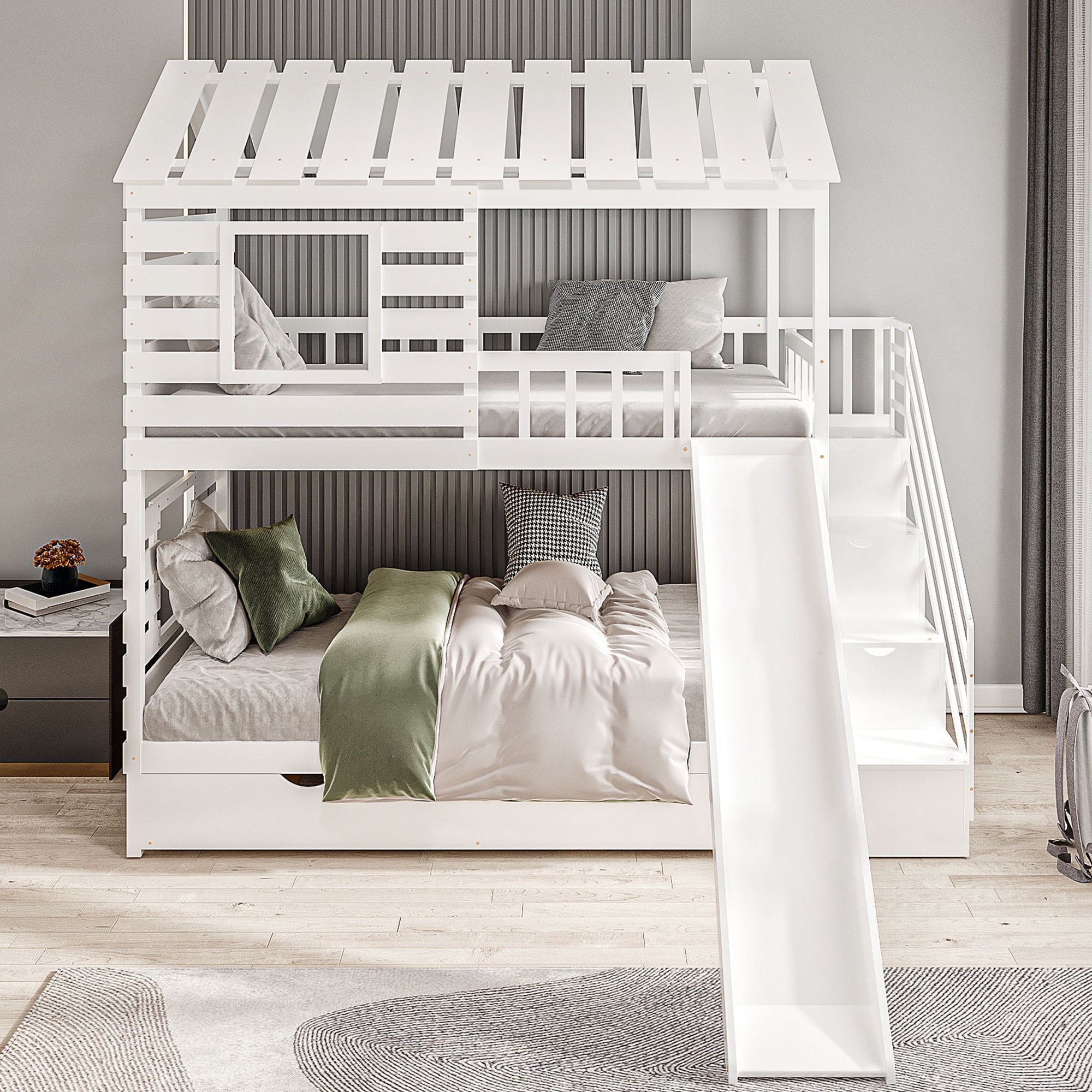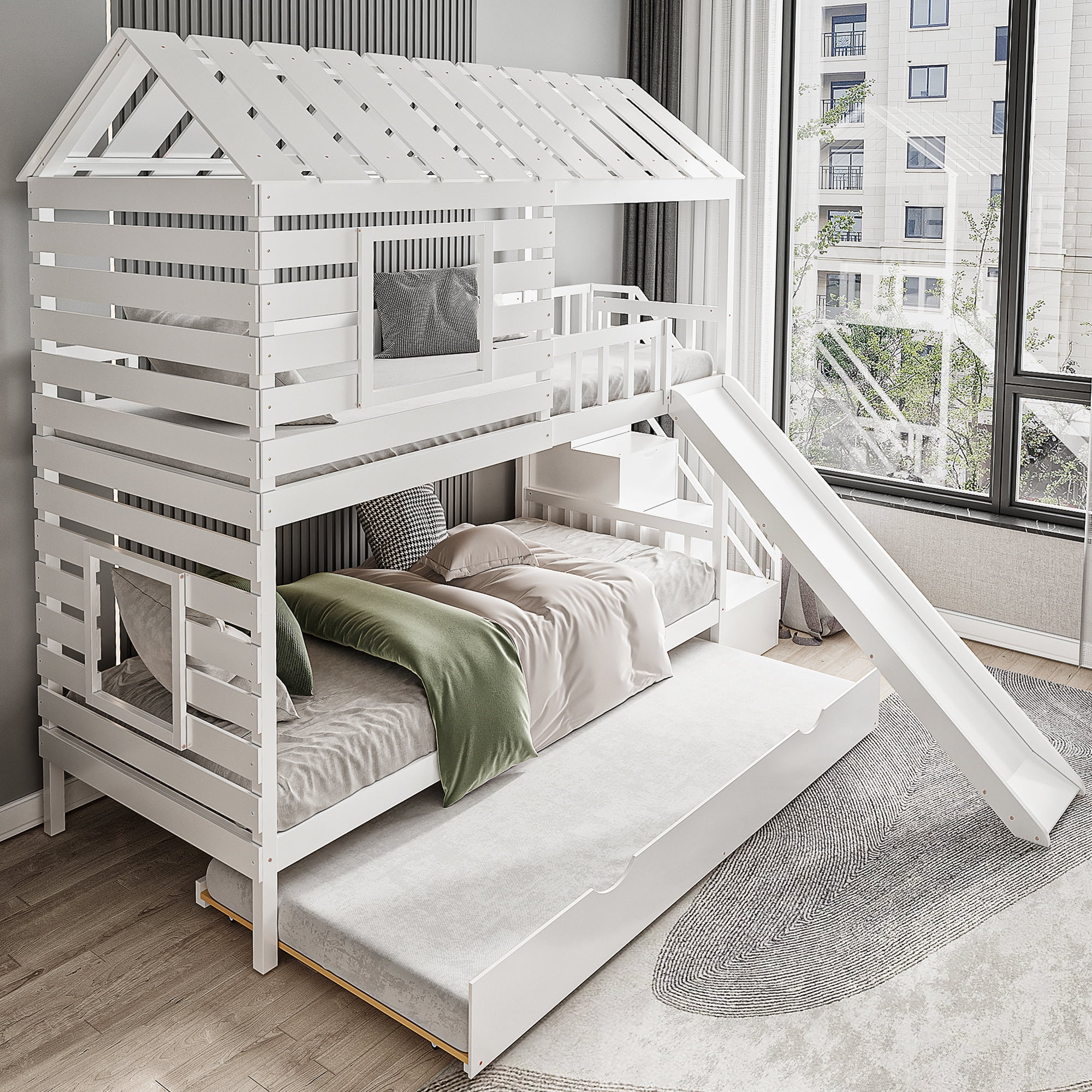 Features: [House Bunk Bed]: Our twin house bed features a classic house-shaped framework. This imaginative twin over twin bunk bed is equipped with a whimsical sky roof and two windows to simulate a playhouse for a fun bedroom environment. Perfect gift for your kids. [Perfect and Safety Design]: The twin bunk bed with staircase and ladder offers extra fun to child. The staircase provides an easy access to the top bed and your kids will have more fun with the slide. All protective guardrails will prevent little ones from accidental fall. [Storage Staircase]: The staircase attached to the bunk bed will provide you with more storage room, in which you can place kids toys, books and other accessories. The twin size trundle can also be used for extra storage. [Solid Construction]: This house bunk is crafted from high-quality solid pine wood, so the bunk bed frame can last for long time use. This twin bunk bed can keep serving your kids as they growing up. It not only looks good but is a sturdy piece of furniture. [Easy to Assemble]: All the parts and tools needed will be packed in the package. The instruction and the accessories are also included in the package. Just follow the instruction, and then you will get your own house bunk bed. Specification: Size: Twin over Twin Overall Product Dimension: 91″L*93.6″W*93.1″H Inner Size: 76″x 39″ Trundle Size: 74.4″x 39″ Overall Product Weight: 265.5lb Bed Weight Capacity: 250lb Mattress Included: No Total Height: 93.1″ Assembly Required: Yes Recommend Upper/Lower Bed Mattress Thickness: 6”/8”-10”