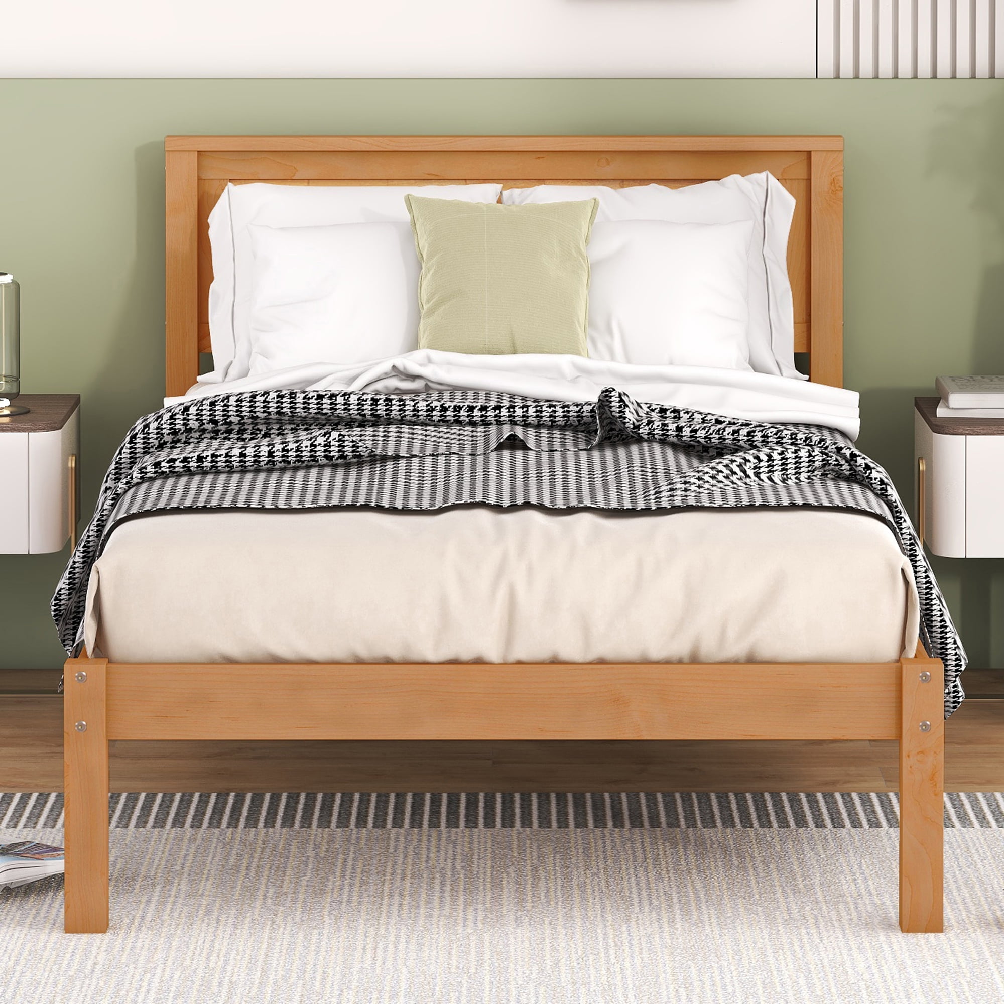 Features: [Timeless Design]: Designed in a modern and concise style, works well with any style of home decor. This wooden bed will match really well with the rest of your furniture or decors. And equipped with anti-rust and strong accessories, the parts of our bed are tightly connected with each other. It won’t make a noise when you turn over on the bed. [Additional Storage Space]: The height from bed slats to floor is 11.8″, which is enough to be a large space. Under our wooden bed, there is plenty of room for you to store some things like storage boxes, suitcases and luggage and it is easy to take them out. Your room will be clean and neat after you put them under your bed. [100% Wooden Durable Frame]: This wooden bed is crafted with pine wood which is sturdy enough to easily support the weight of one adult. The strong legs and wide boards not only improve the weight capacity of the bed greatly but also ensure stable. Therefore, the bed will provide a long time of service for you. [Simply Bed Frame with Headboard]: Slatted headboard adds a modern, airy feel to any bedroom. Simple silhouette with clean lines pairing well with any decor or furniture in your home and merging perfectly with your room whether for adults, girls or boys. Perfect for any bedroom or guest room. [Easy to Assemble]: It is even not difficult to install our wooden bed by yourself in a short time according to the instructions step by step. You also can assemble the bed with your family together. Hardware and basic assembly tool included. Specification: Size: Twin/Full/Queen Twin Bed Size: 76” x 39.3” Full Bed Size: 76”x 54.5” Queen Bed Size: 80.9” x 61.2” Overall Twin/Full/Queen Product Weight: 37.5lb/49.5lb/57.5lb Twin/Full/Queen Bed Weight Capacity: 300lb/350lb/400lb Mattress Included: No Total Height: 36.1″ Assembly Required: Yes Recommend Bed Mattress Thickness: 8-10” high headboard wood frame