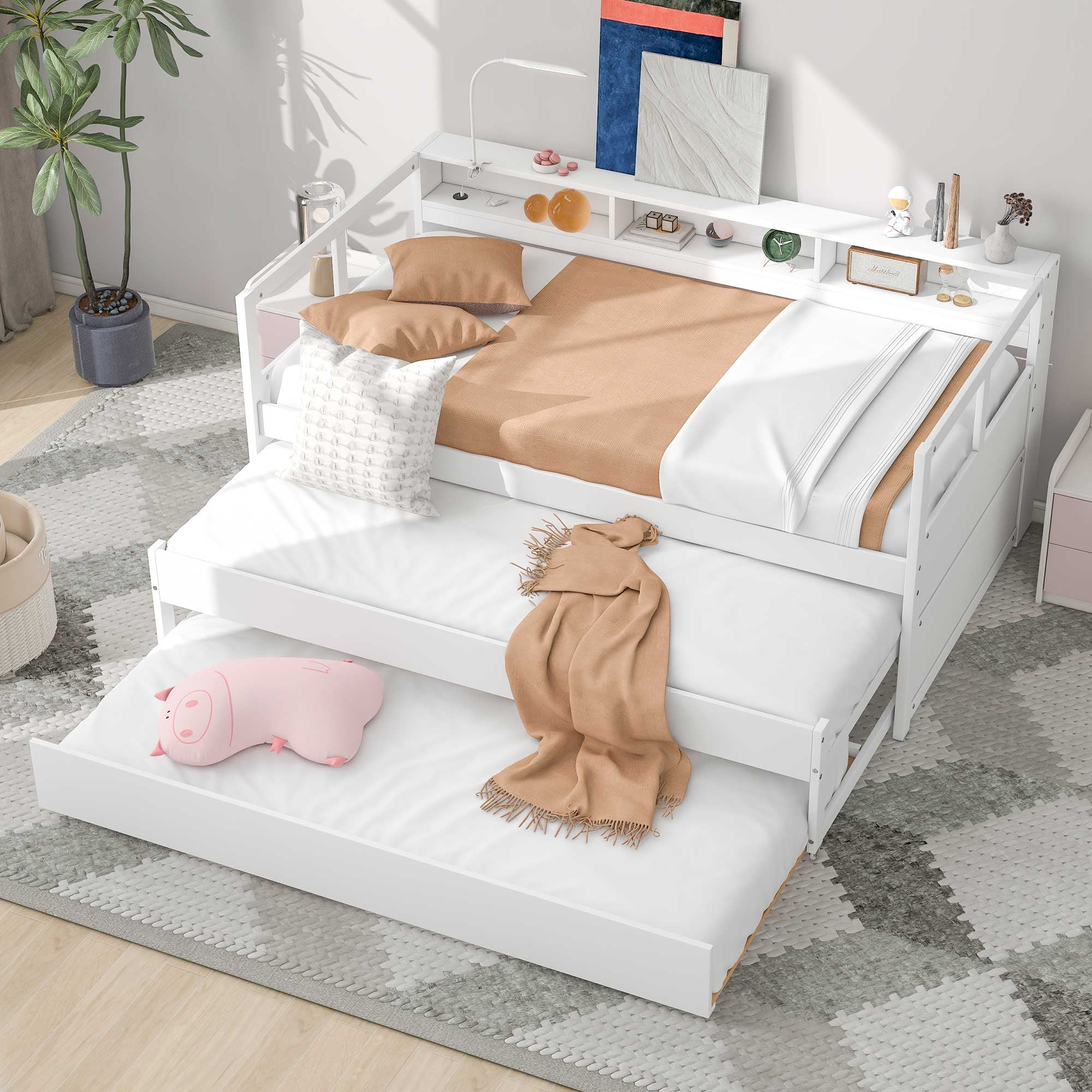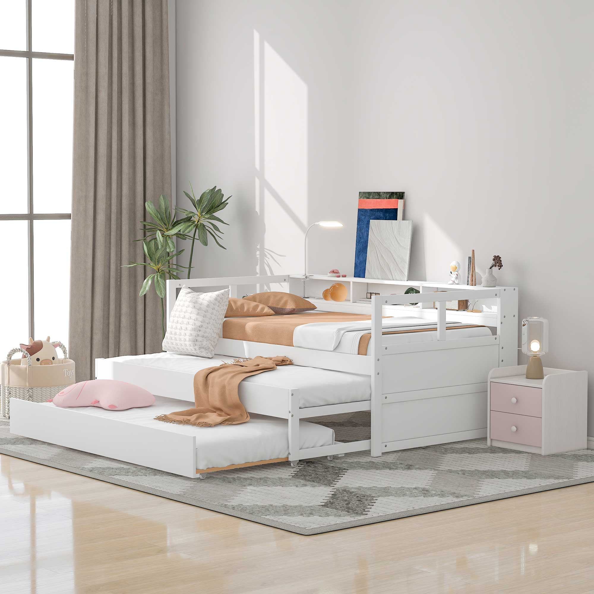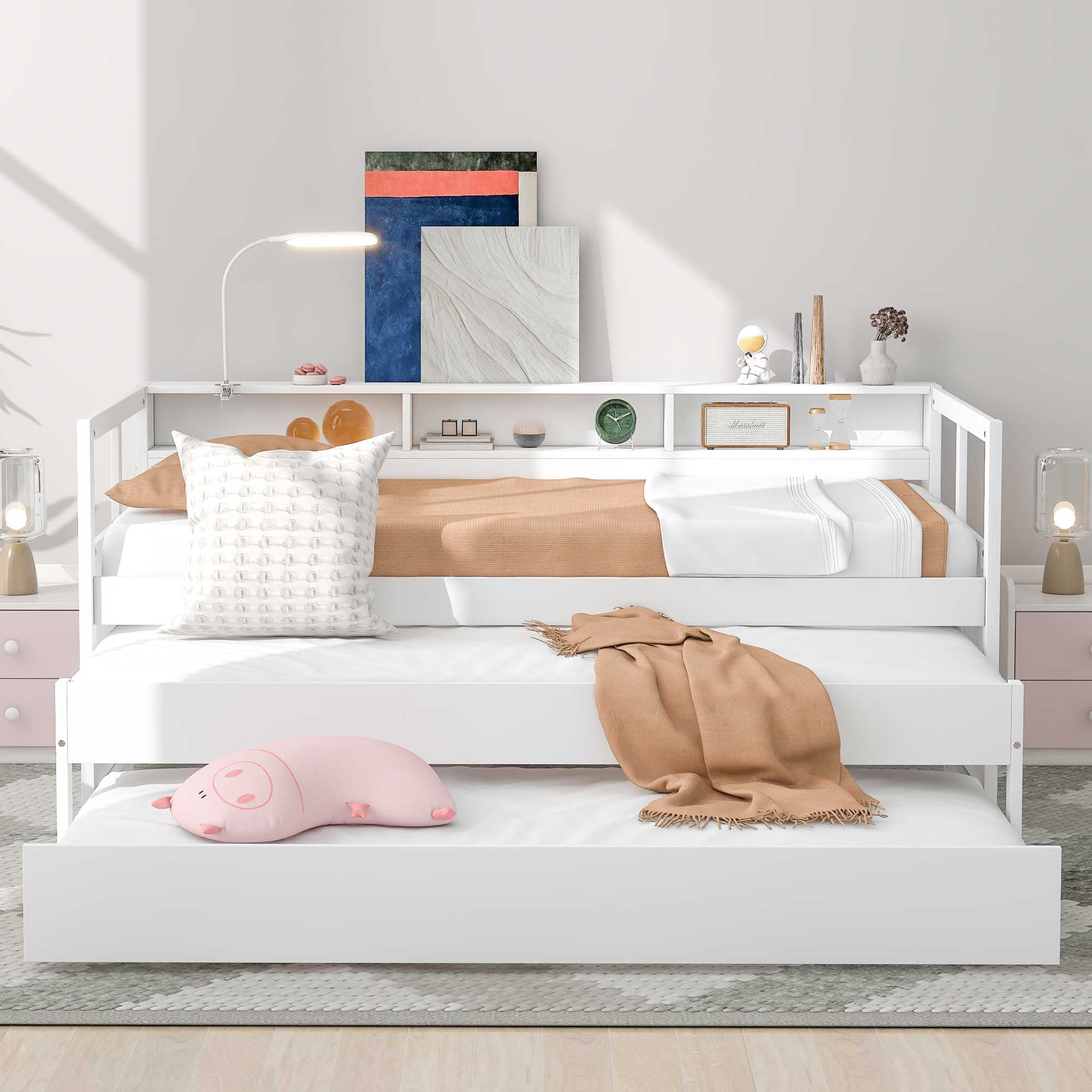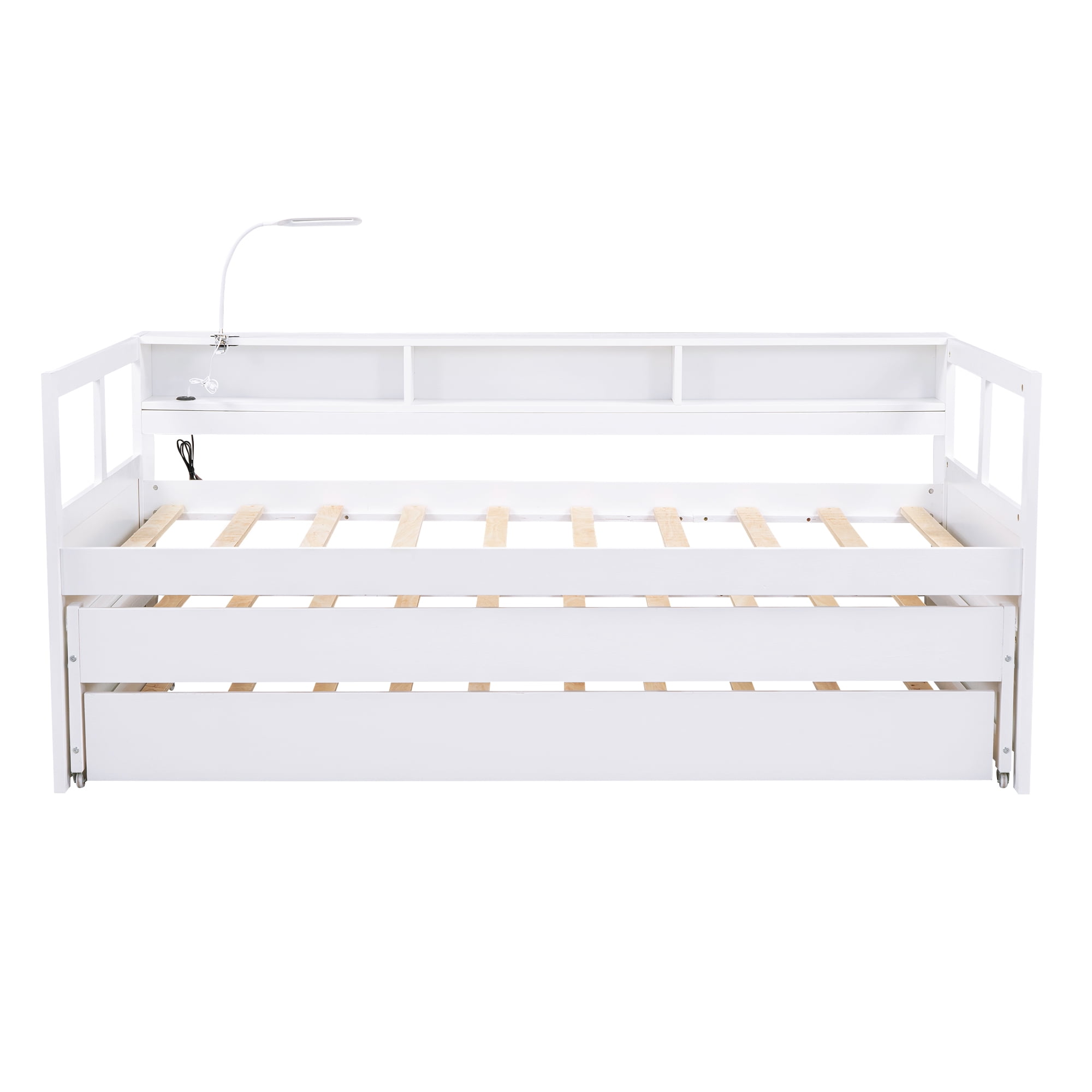 EUROCO Twin Platform Bed with Storage Shelf, Convertible Daybed with Night Light and USB Charging, 3 Beds in One, White