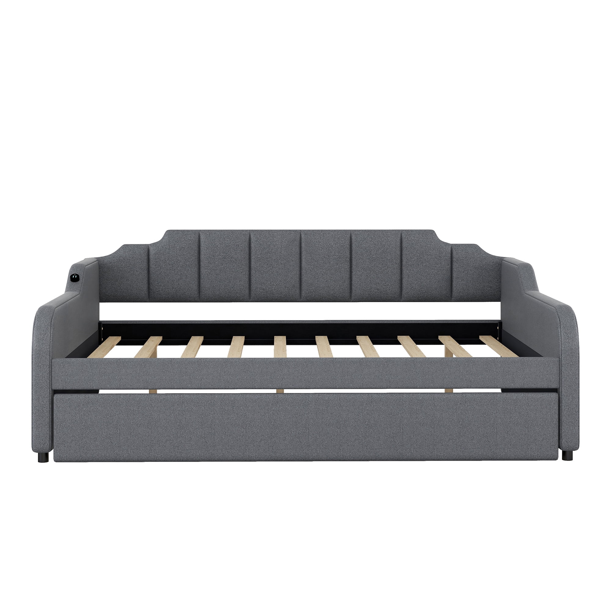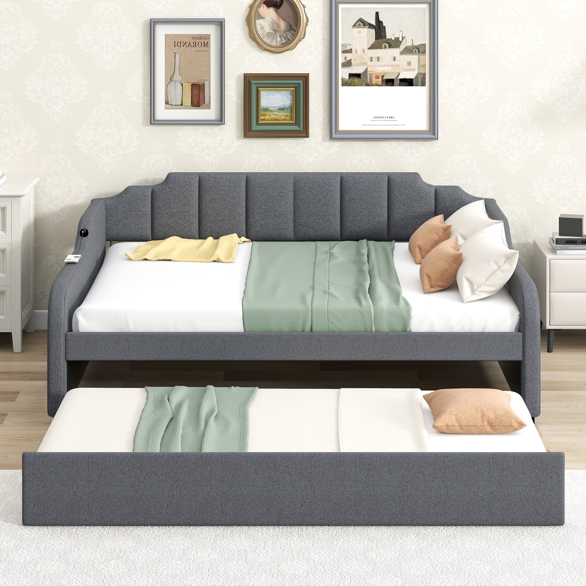 Features: [Modern and Unique ]: Contemporary design with clean lines and upholstered in rich linen. Perfect to pair with any decor. The daybed is a beautiful and chic accent piece to place against the wall, which can be used as a room divider or a trendy bed for kids and adults! [Space-Saving and Functional]: Whether you want to sit down, lounge around, or need extra sleeping or storage space, our daybeds have got you covered in any situation. The trundle under the bed is equipped with wheels so that you pull it out very easily. [Sturdy Construction]: Made of high-quality pine wood, the frame of this daybed is not easy to be affected by humidity change and lead to crack. The strong legs and wide boards can not only improve the weight capacity but also increase its stability. [Safe and Comfortable]: This twin-size daybed with trundle is upholstered so that your kid can sleep or lean comfortably, and never get injured. The padded back and sides of the bed will add more comfort, no matter you’re sitting down or sleeping. [Easy to Assemble]: The twin-size daybed only needs a little assembly and all the necessary tools needed for assembly will be prepared in the package. You will also get a detailed instruction guide to help you use and assemble it quickly and easily. Specification: Size: Twin Overall Product Dimension: 85.5″ L * 81.6″ W * 33.4″ H Daybed Inner Size: 39.1″ x 76″ Trundle Size: 39.1″ x 76″ Overall Product Weight: 156 lb Bed Weight Capacity: 300 lb Trundle Weight Capacity: 220 lb Mattress Included: No Total Height: 33.4″ Assembly Required: Yes