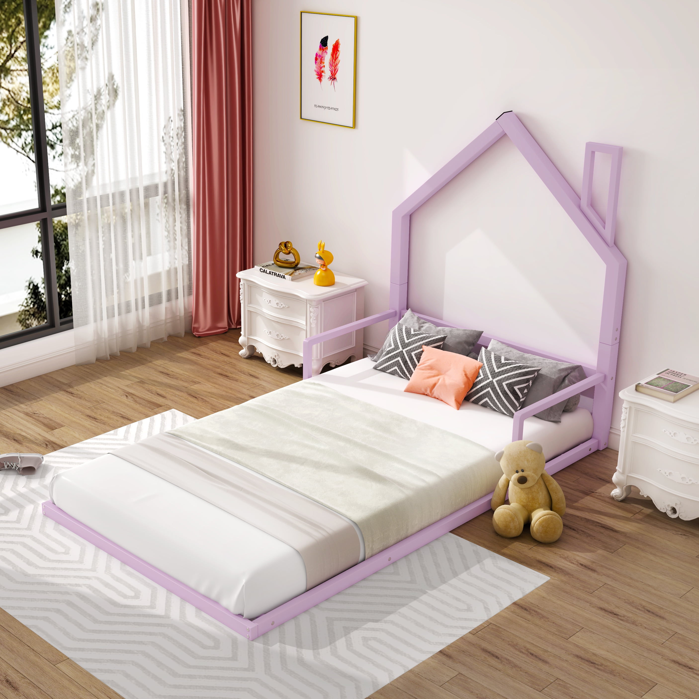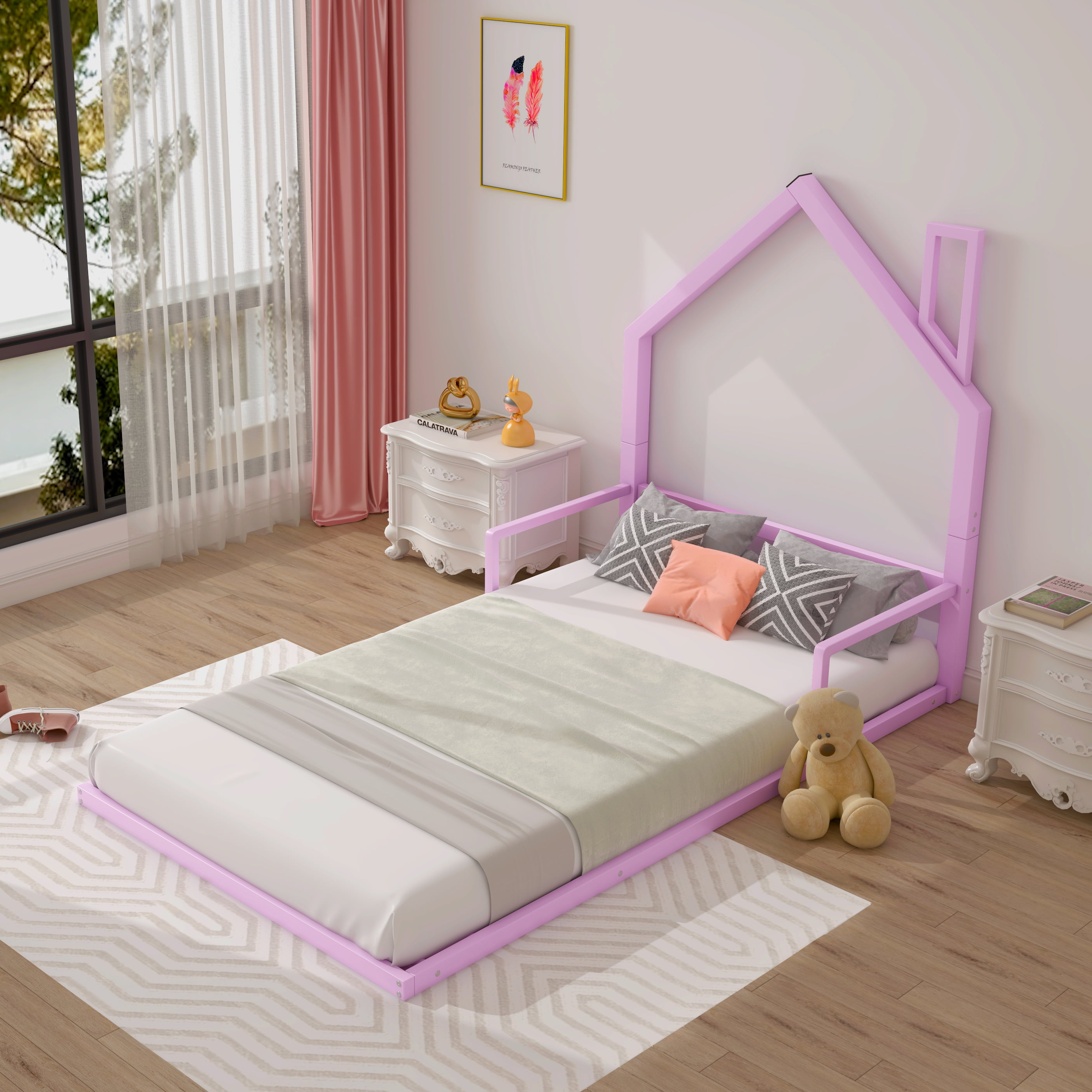 EUROCO Twin Size House Bed, Metal Floor Bed for Kids, Pink