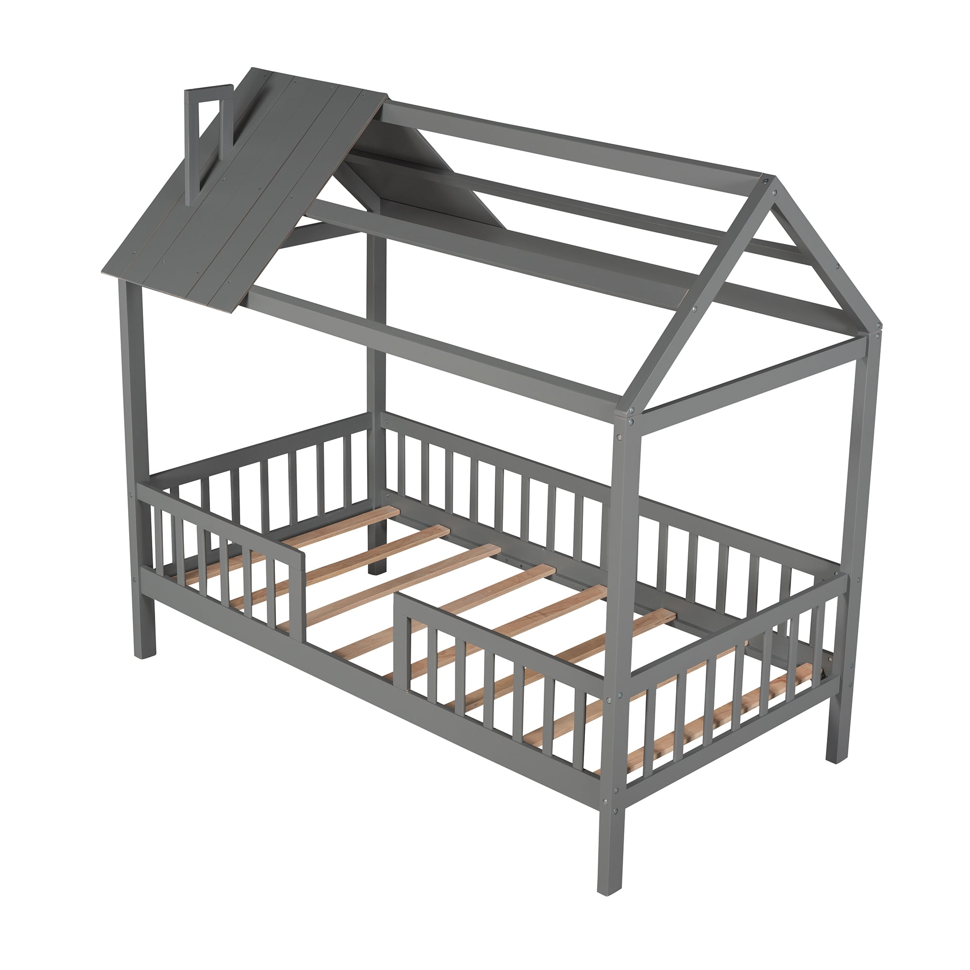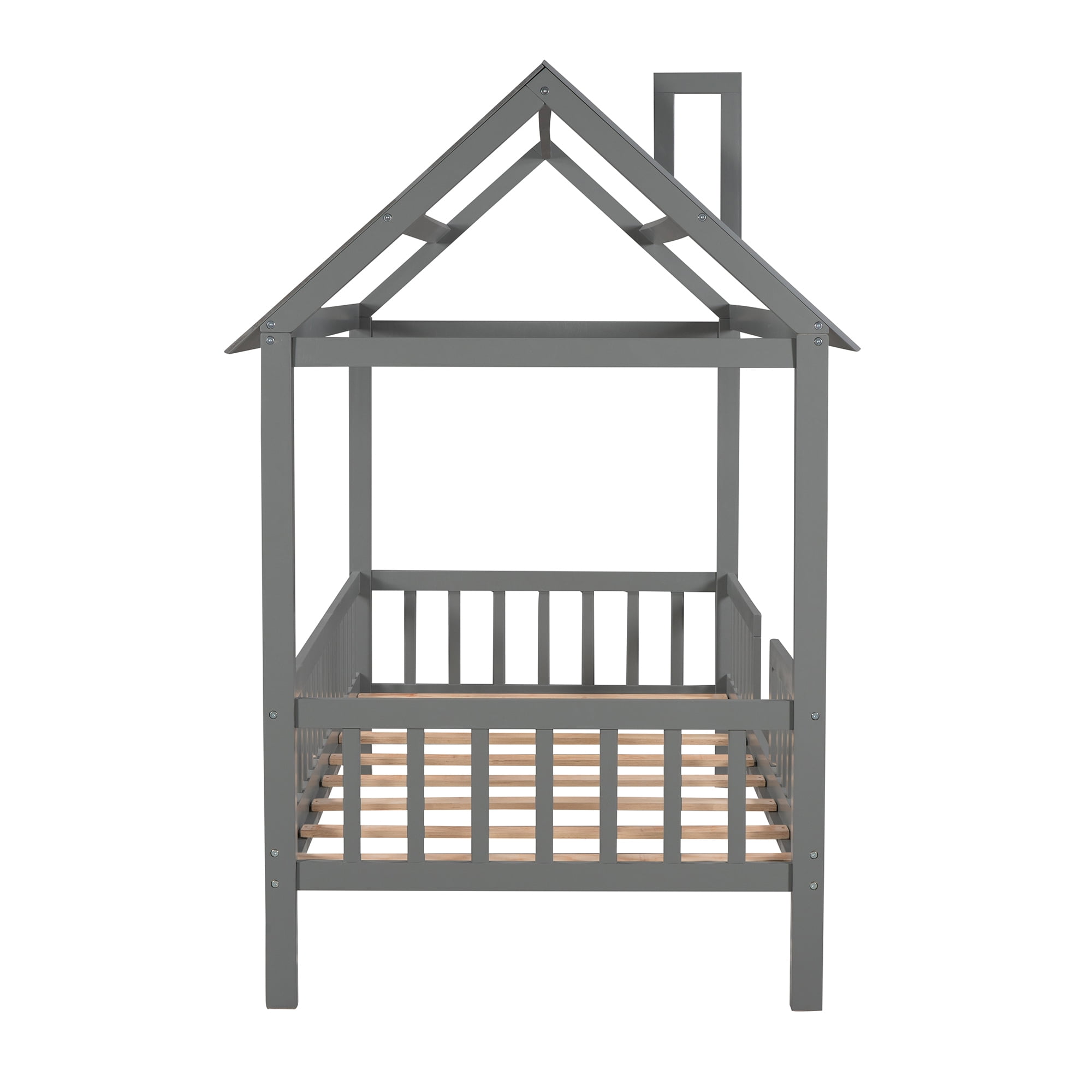 Euroco Twin Size Platform Bed, House Bed with Fence for Kids, Gray