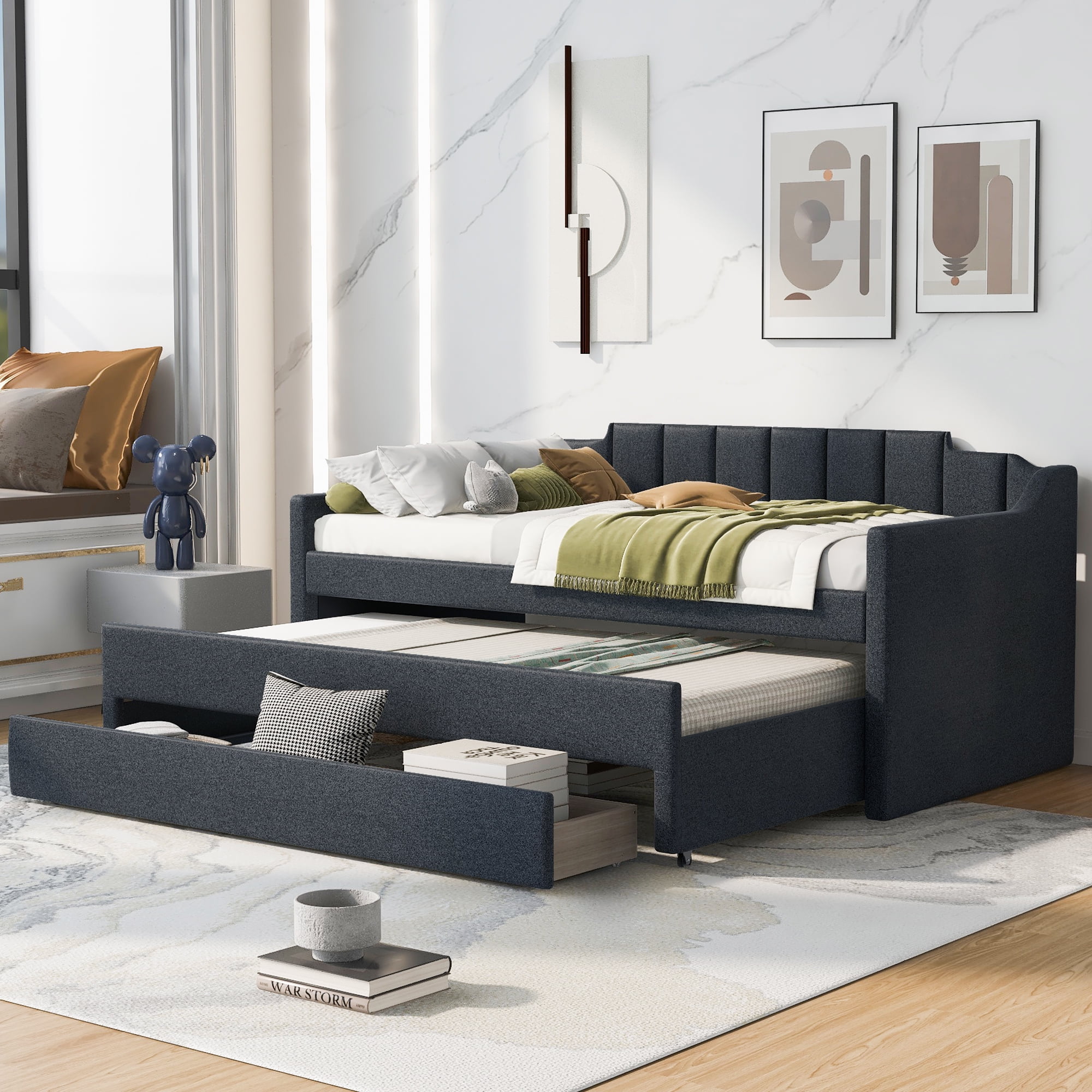 Features: [Large Storage Space]: Our twin size daybed is designed with a twin size trundle under the bed to provide extra sleeping space for guests. In addition, there are 3 large storage drawers for you to store daily necessities, books or toys. [Multifunctional Dual-use Design]: This trundle bed with storage perfectly combines the functions of a wooden bed and sofa and fully improves space utilization. Simple shape can perfectly complement the existing decoration style. Children and guests can sit on it, read books, play games, or lie down and rest. [Practical Twin Bed]: Our modern and stylish twin trundle bed can be perfectly matched with different decor styles or furniture. The non-toxic and odorless upholstery design on the surface will not harm the health of you or your family and can be used with confidence. [Stable Structure]: In order to improve the overall stability and durability of this kids twin bed with trundle and storage, we have carefully selected high-quality wood to ensure safety of kids. Wooden slat supports provide users with strong support for quality sleep. [Easy to Assemble]: Without requirements of box springs, our twin trundle bed is easy to assemble. Detailed instructions and complete accessories can help you accurately complete the entire assembly process. Specification: Size: Twin Overall Product Dimension: 81″L*40.8″W*31″H Dimension of the Daybed: 75″x 39″ Dimension of the Trundle Bed: 74.5″x 39″ Overall Product Weight: 150lb Bed Weight Capacity: 250lb Mattress Included: No Total Height: 31″ Assembly Required: Yes Recommend Bed Mattress Thickness: 6” Features: [Large Storage Space]: Our twin size daybed is designed with a twin size trundle under the bed to provide extra sleeping space for guests. In addition, there are 3 large storage drawers for you to store daily necessities, books or toys. [Multifunctional Dual-use Design]: This trundle bed with storage perfectly combines the functions of a wooden bed and sofa and fully improves space utilization. Simple shape can perfectly complement the existing decoration style. Children and guests can sit on it, read books, play games, or lie down and rest. [Practical Twin Bed]: Our modern and stylish twin trundle bed can be perfectly matched with different decor styles or furniture. The non-toxic and odorless upholstery design on the surface will not harm the health of you or your family and can be used with confidence. [Stable Structure]: In order to improve the overall stability and durability of this kids twin bed with trundle and storage, we have carefully selected high-quality wood to ensure safety of kids. Wooden slat supports provide users with strong support for quality sleep. [Easy to Assemble]: Without requirements of box springs, our twin trundle bed is easy to assemble. Detailed instructions and complete accessories can help you accurately complete the entire assembly process. Specification: Size: Twin Overall Product Dimension: 81″L*40.8″W*31″H Dimension of the Daybed: 75″x 39″ Dimension of the Trundle Bed: 74.5″x 39″ Overall Product Weight: 150lb Bed Weight Capacity: 250lb Mattress Included: No Total Height: 31″ Assembly Required: Yes Recommend Bed Mattress Thickness: 6” Daybed with trundle and drawers 2 beds in one sofa bed