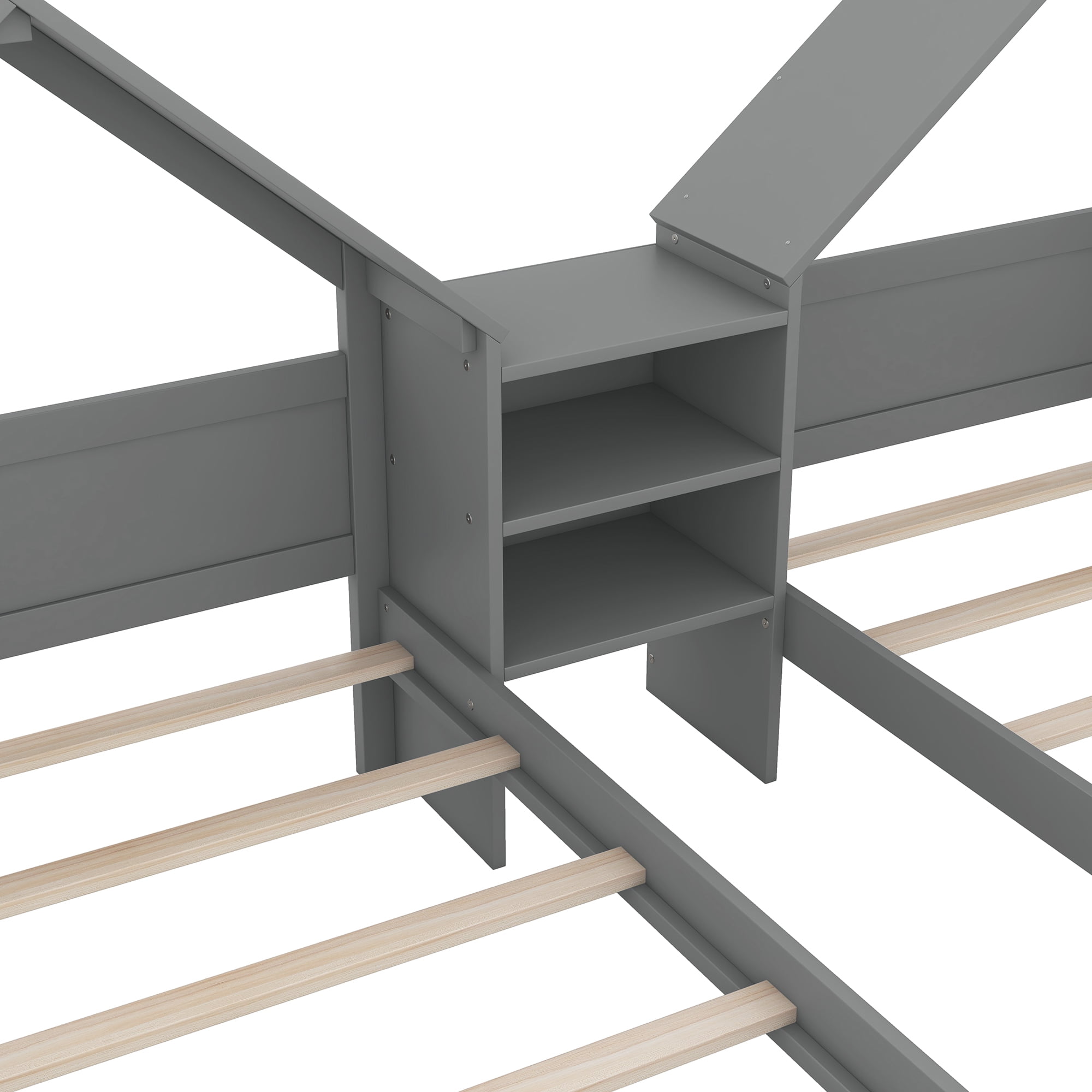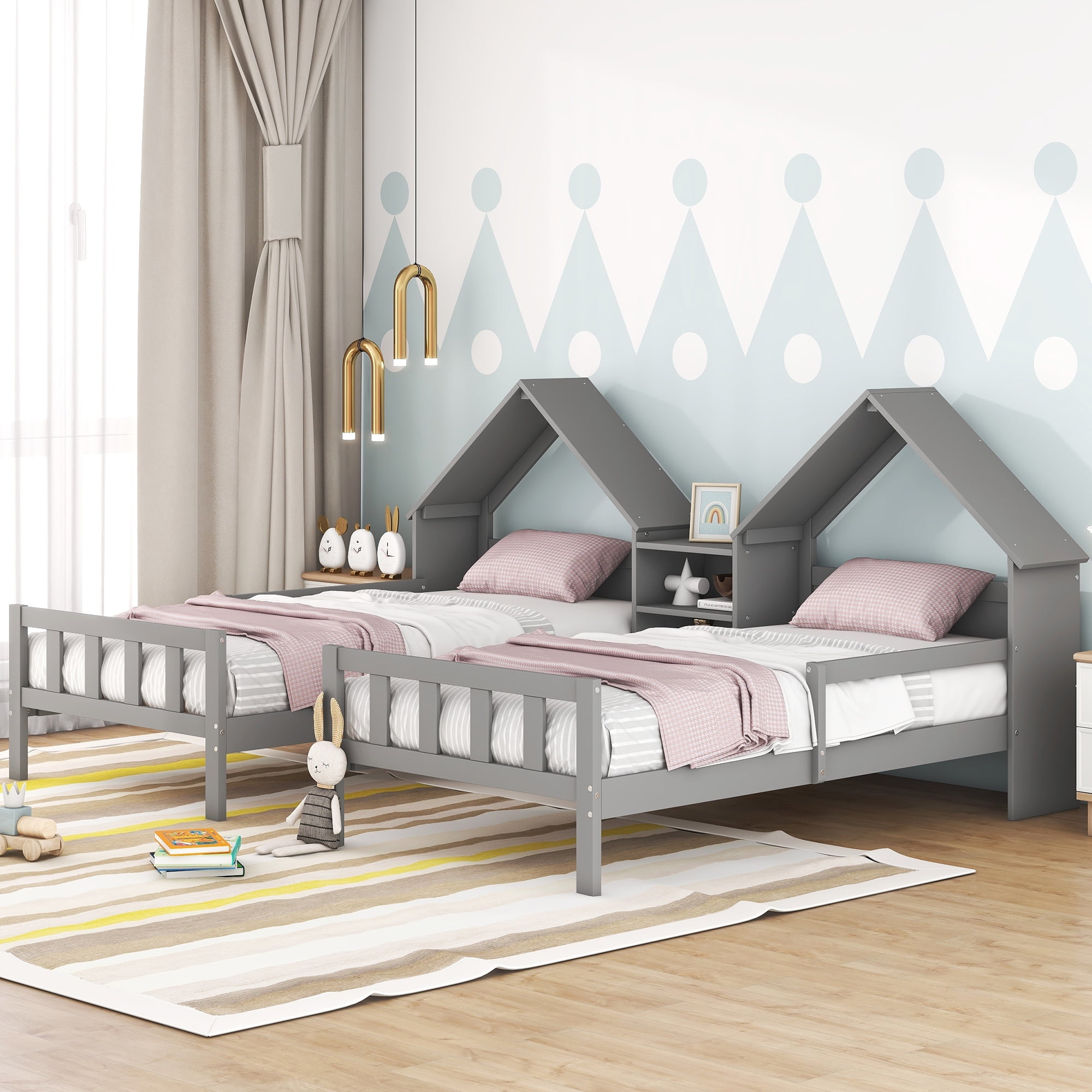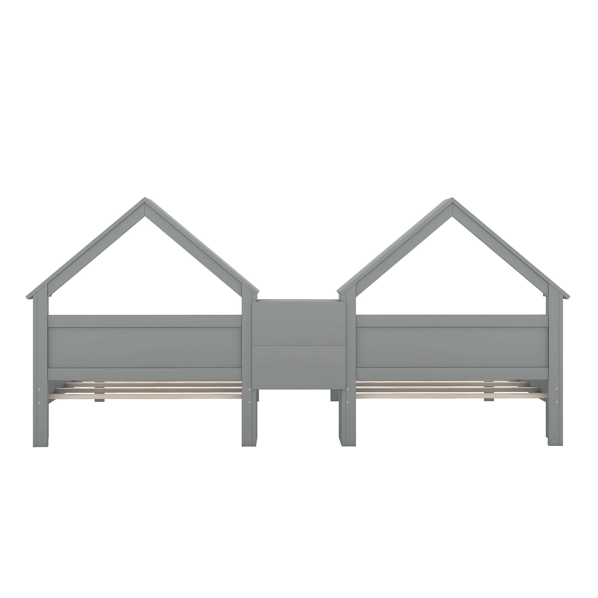 Euroco Twin Size Wood House Platform Bed, Two Beds in One with Desk and Shelf, 2 Platform Beds for More Kids Teens, Gray