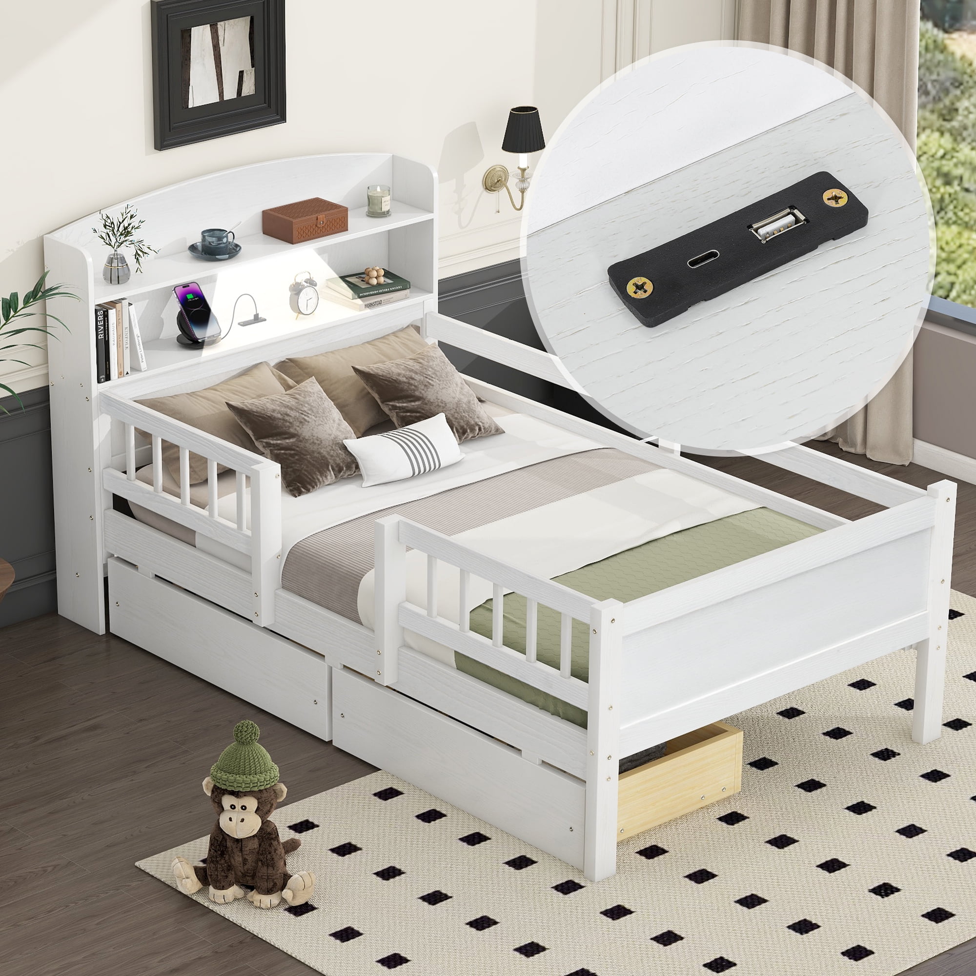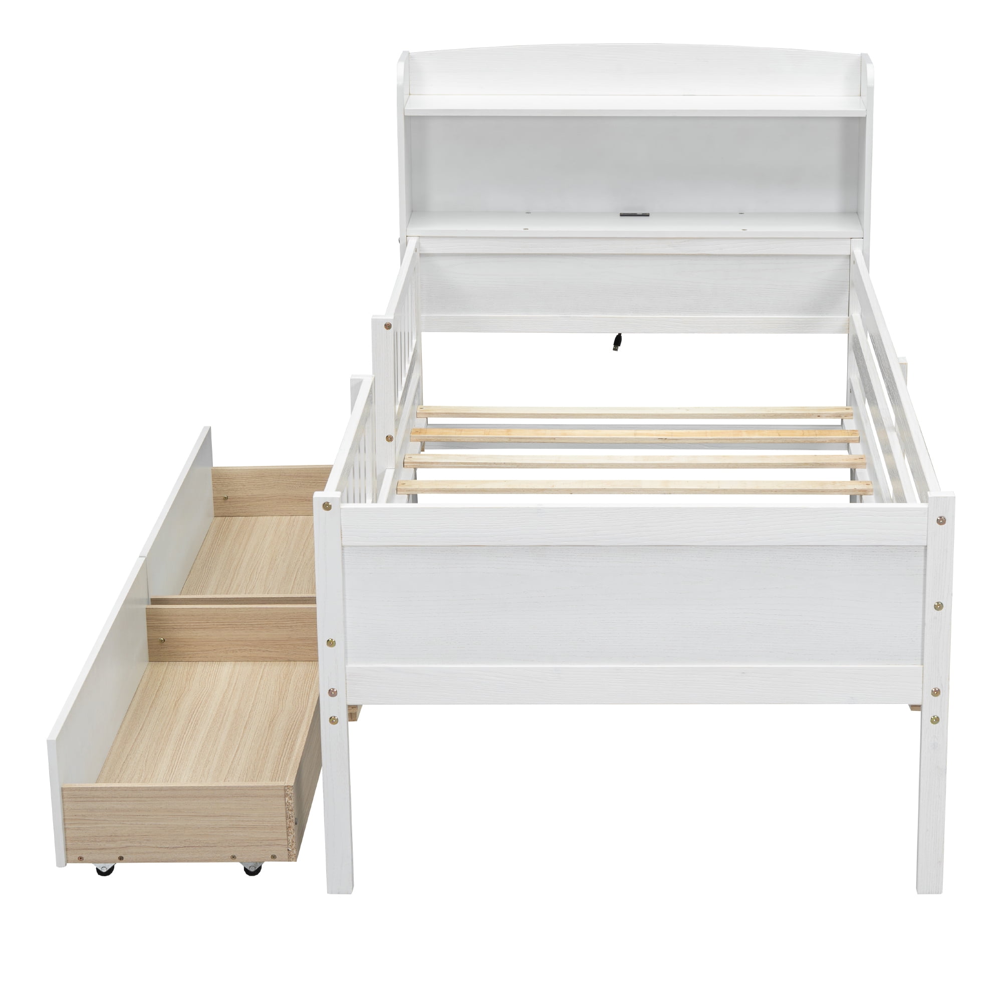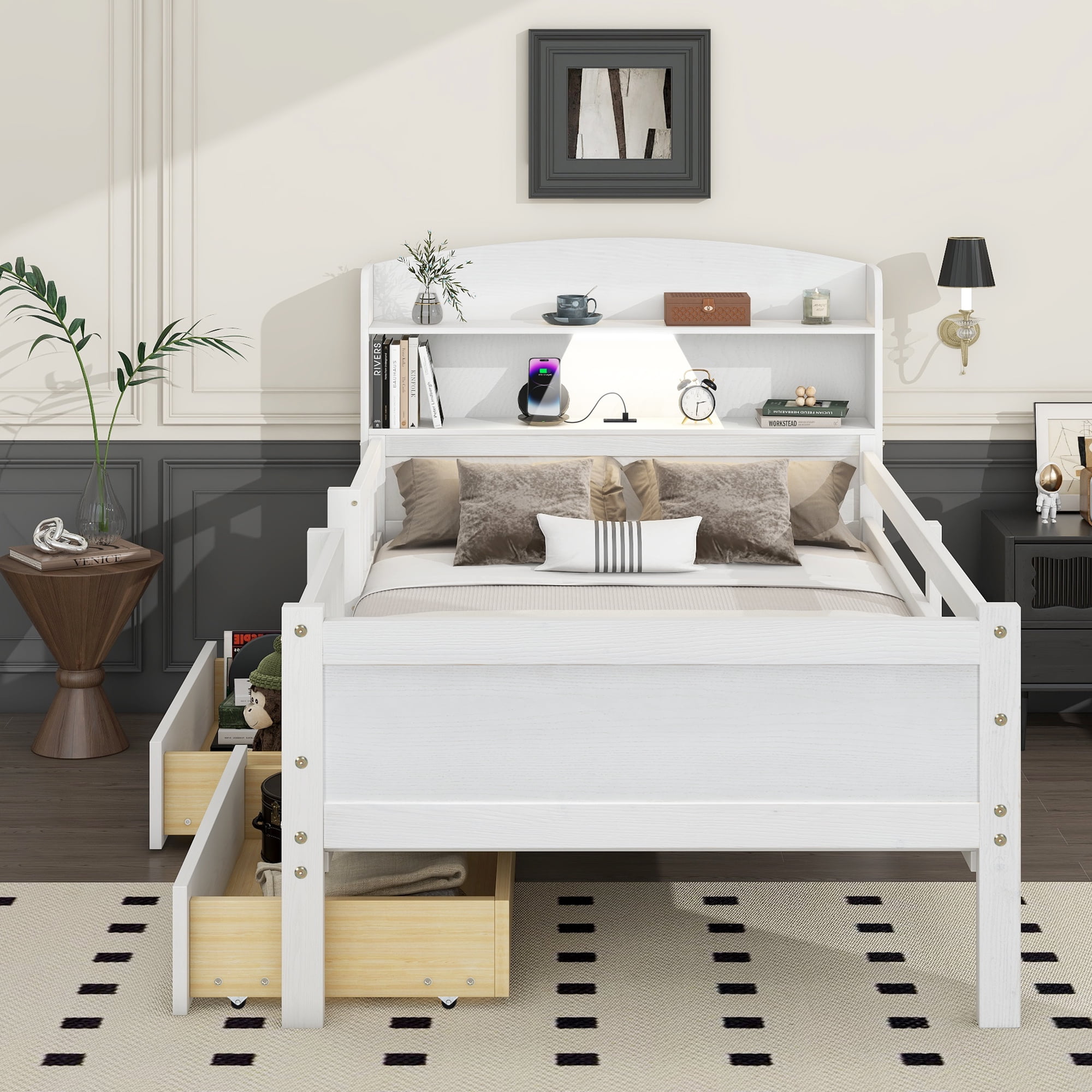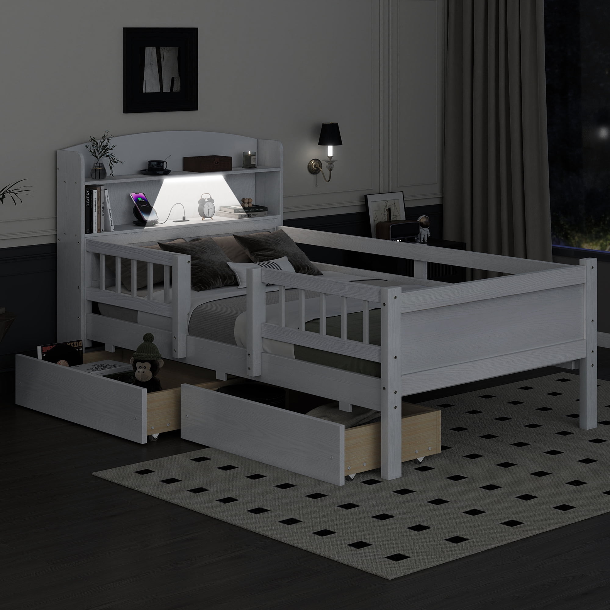 Features: [Sturdy Construction] Constructed of solid pine wood+MDF, this platform bed features a sturdy high quality solid wood construction for durability and high load capacity, ensuring longevity. [With Two Drawers] The drawers can effectively utilize the room space. The drawers can be pulled away from either side of the bed. [Headboard and Guardrails] This bed has a storage headboard with LED light. High and full length guardrails will provide a more comfortable and safe sleep. [Easy Assembly]: Assembly is easy since the instruction is clear and the hardware is available. Specifications: Finish option: White/ Gray Dimensions of bed:84.8”L x 41.7”W x 43.8”H Inner size:75.9” x 39.2” Spring box:No Need Assembly Required: Yes Overall Product Weight: 106lb Weight capability: 300lbs Suggest mattress thickness: 6-8”