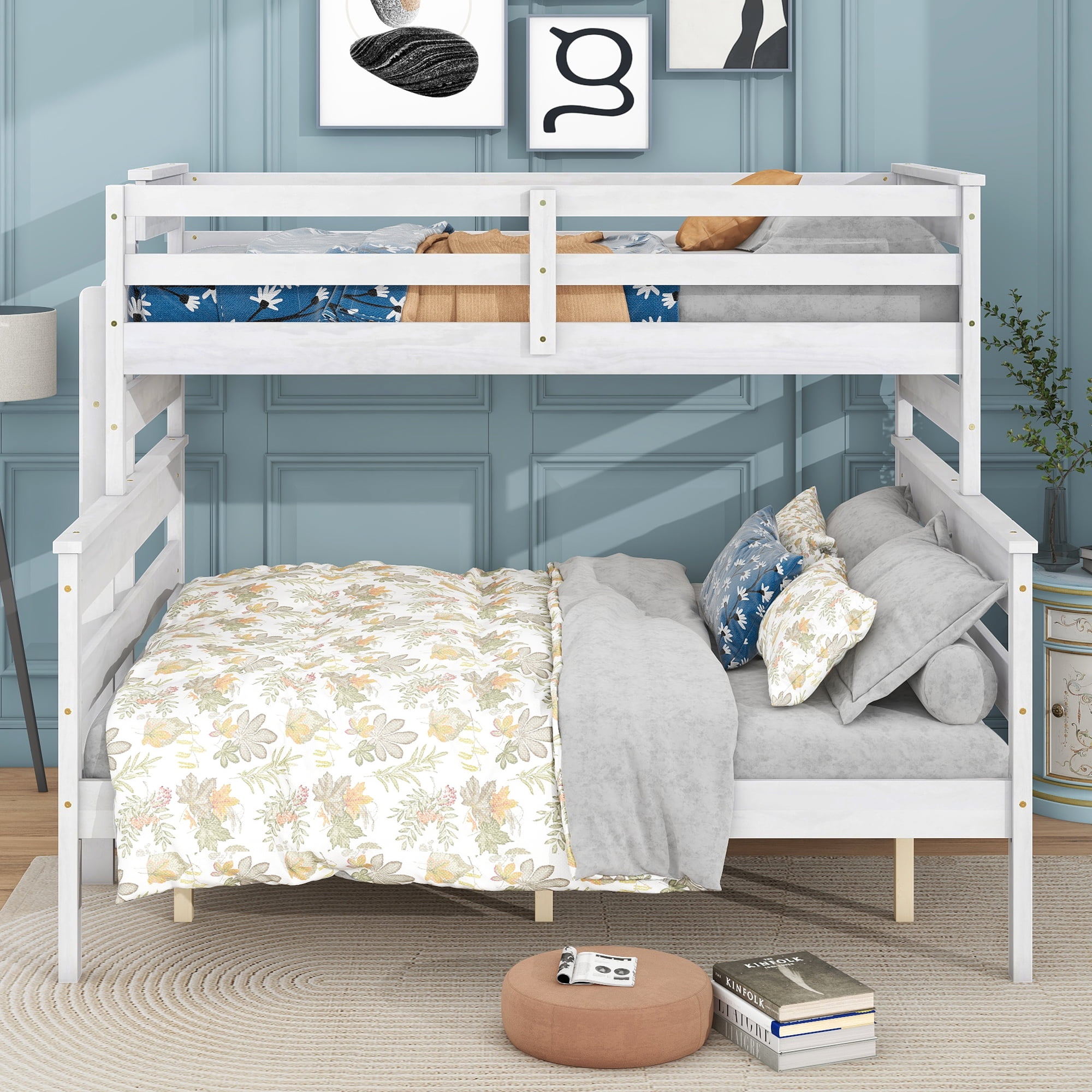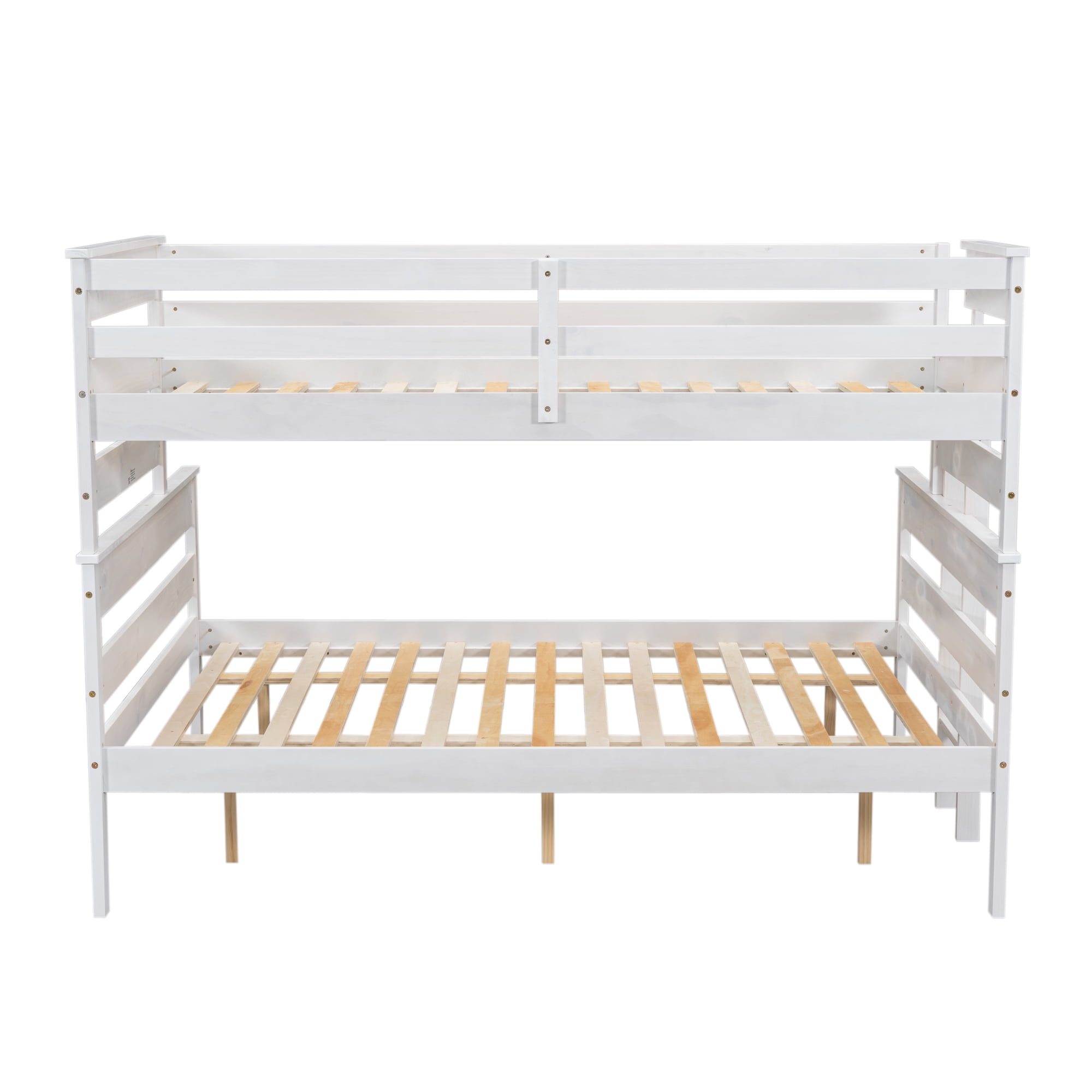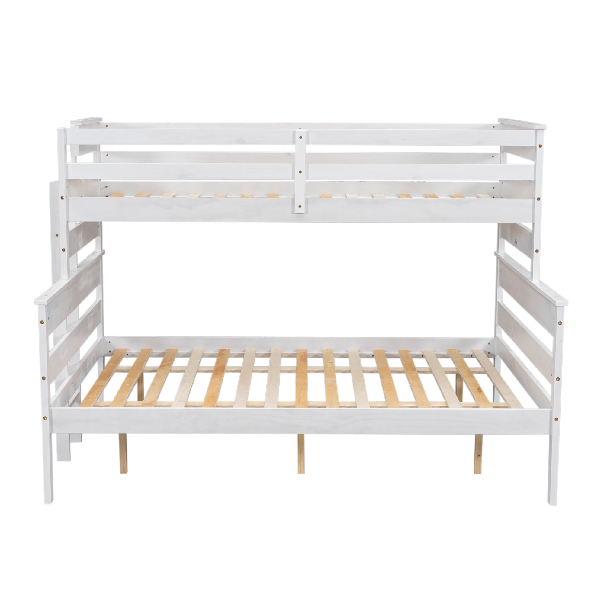 Features: [Convertible Bed]: This convertible bunk bed can be changed to two seperate beds. The lower bed is queen size to meet your different needs in the kid’s bedroom or living room. [Space-Saving]: This twin XL over queen bunk bed will give your children’s bedroom an extra bonus of fun. Additionally, the vertical ladder is attached to the bed, which is space-saving and it will provide easy access to the upper bed. [Safe for Children]: This bunk bed is equipped with high and full-length guardrails around both the upper bed and the lower bed. You will never need to worry about falling when sleeping. The attached ladder will also keep your child safe. [Solid Construction]: This bunk bed is made from solid pine wood, which will stand the test of time to serve your family for many years. Sturdy wood slat kits are included and box springs are not needed. [Easy to Assemble]: All the parts and tools needed for the assembly will be in the packages. It will be useful for you to assemble this simple bed. You just need to follow the instructions to assemble your own bed. Specification: Size: Twin XL ove Queen Overall Product Dimension: 84”L x 65”W x 60.6”H Upper Bed Inner Size: 81” x 39.3” Lower Bed Inner Size: 81” x 61.2” Overall Product Weight: 160 Lb Upper Bed Weight Capacity: 300 Lb Lower Bed Weight Capacity: 400 Lb Mattress Included: No Assembly Required: Yes Recommend Upper / Lower Bed Mattress Thickness: 6-8”/8-10”