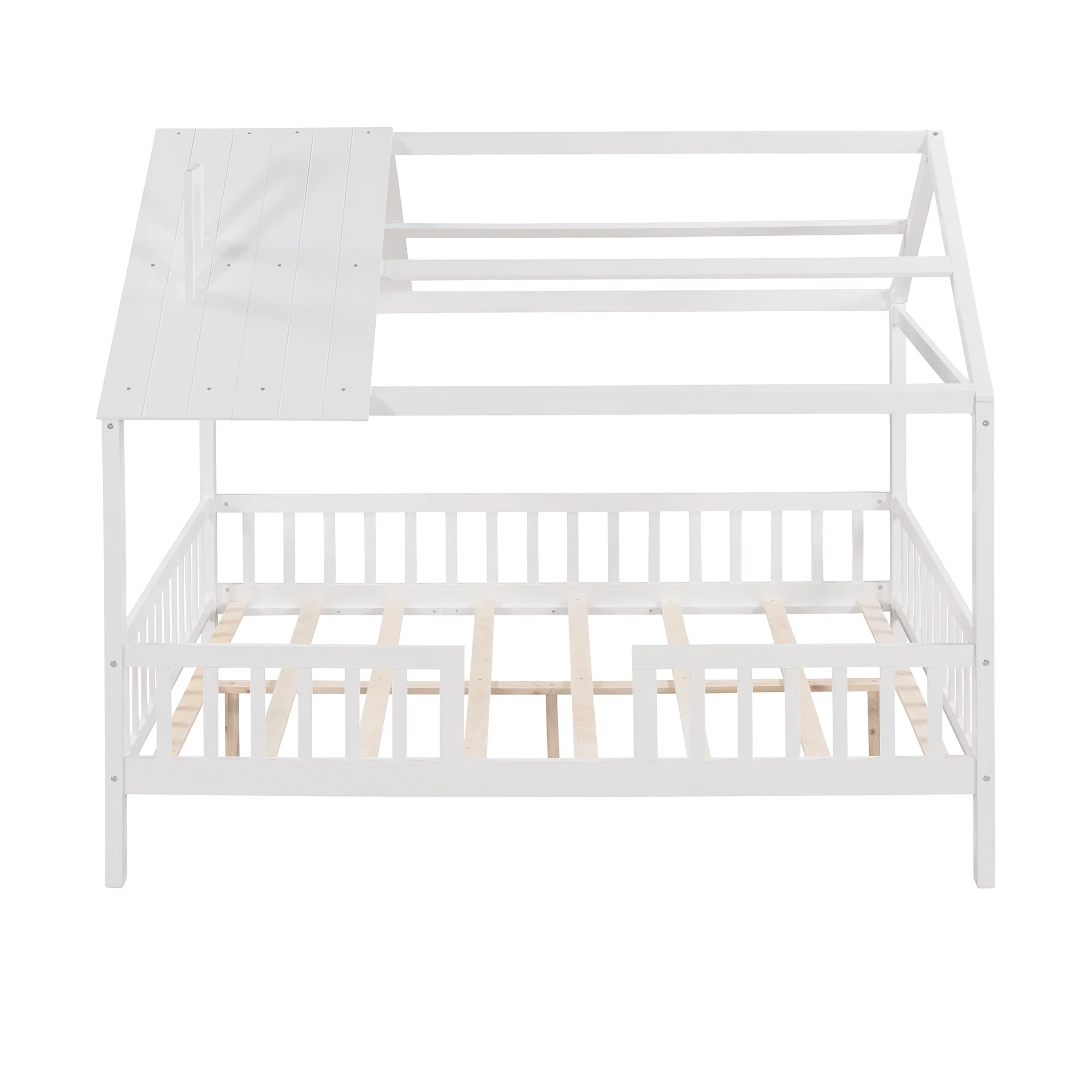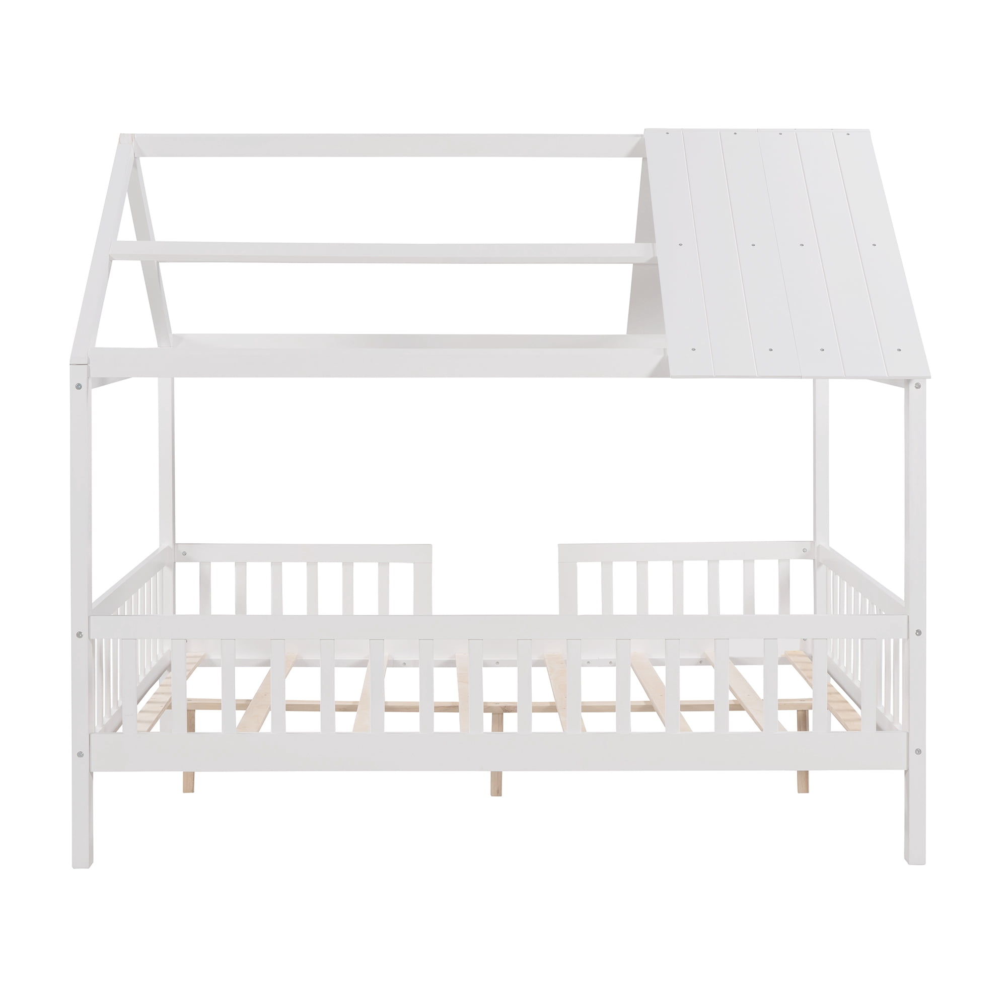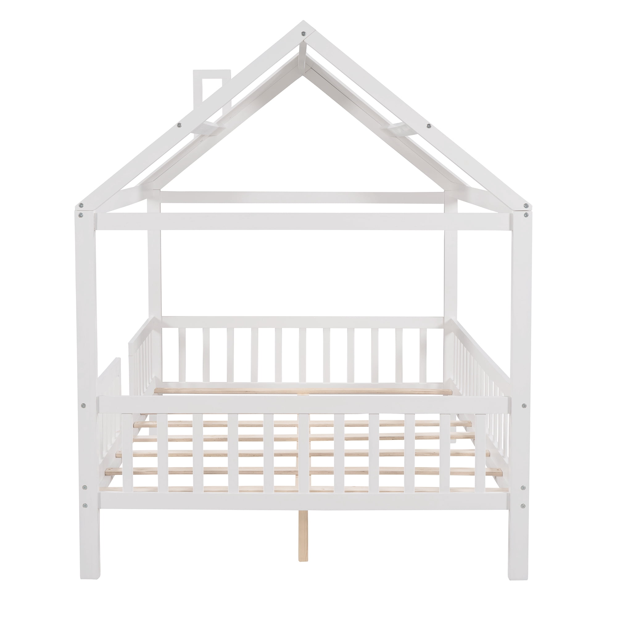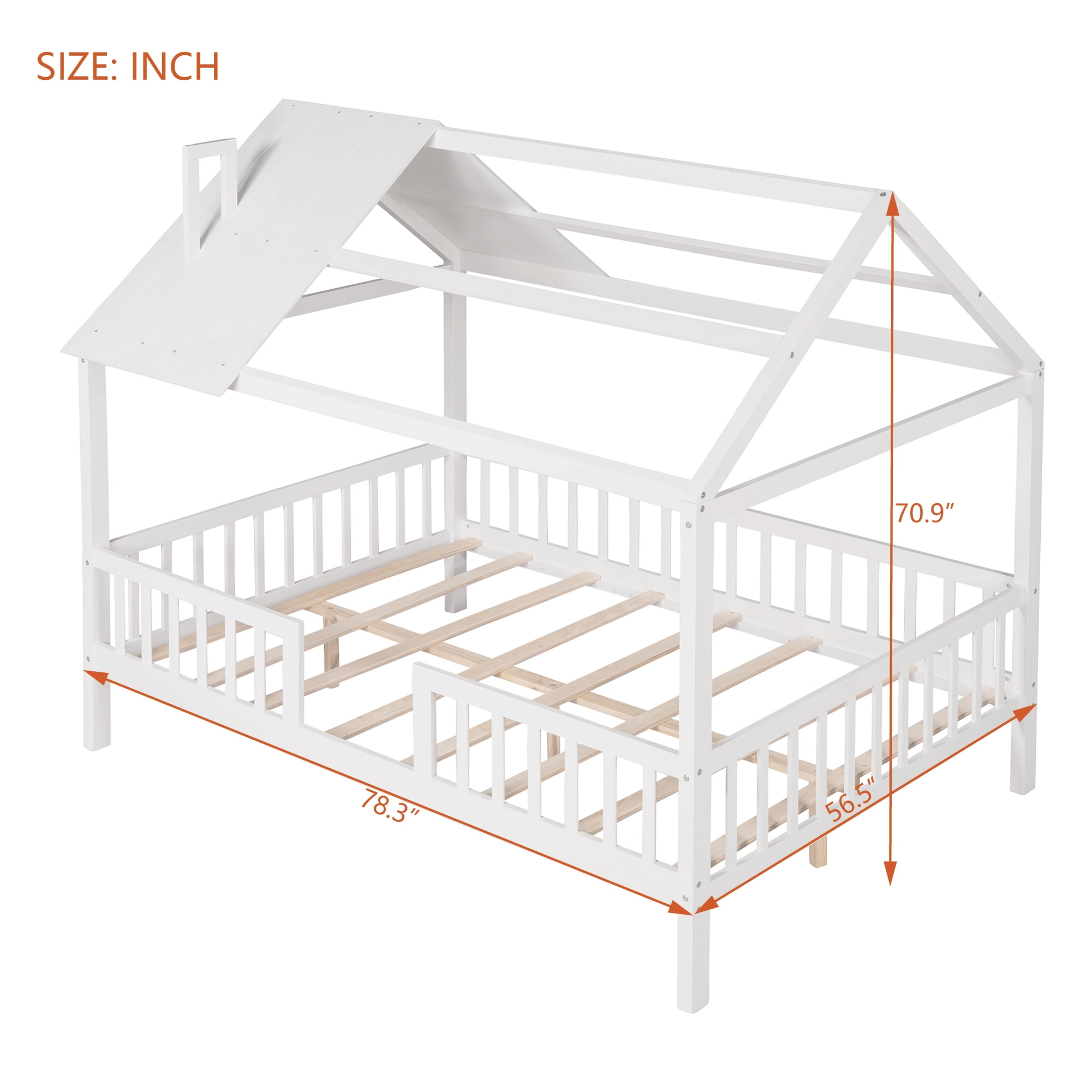 Euroco Full Size House Platform Bed with Roof and Guardrails Design, White