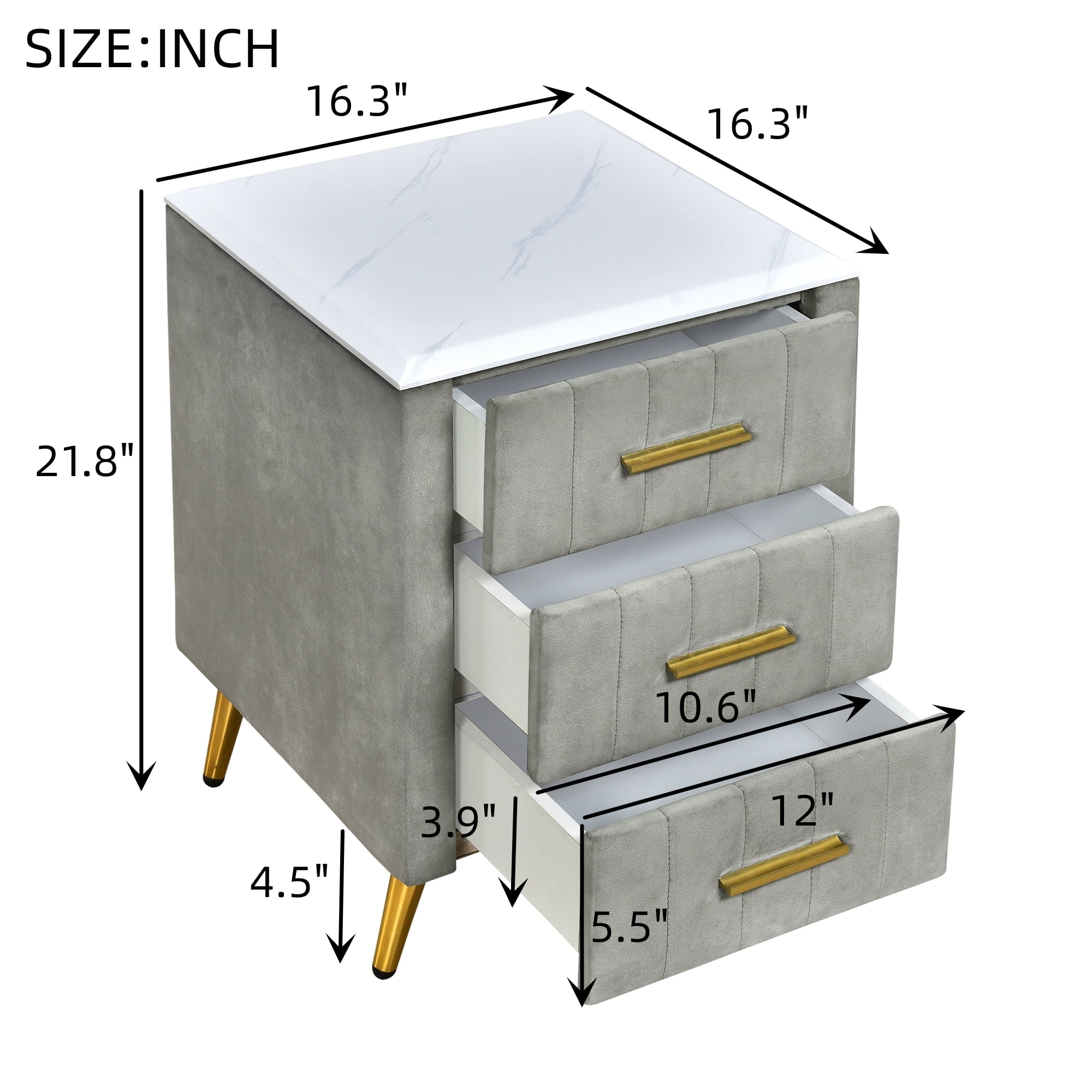 Sturdy Construction: The bedside table is made of solid wood panel frame and upholstered velvet with sturdy metal legs, very strong and reliable. Can be used for a long time. Modern Design: This modern and stylish upholstered bedside table has 3 drawers, the drawers can be opened smoothly and noiselessly, with metal handles, it is easy for you to open the drawers. It’s the ideal storage solution for your bedroom or living room, and goes well with any piece of furniture. Premium Velvet Upholstery: This bedside table is made of high-quality velvet fabric, the bedside table is soft and comfortable to the touch. Also adds charm to your room. Large-capacity Storage: The nightstand with 3 drawers provides an excellent storage solution for your daily items. The marble-patterned countertop can place lamps, mobile phones, glasses, books, etc., making these small items within easy reach. Organize household items including clothes, blankets, and everyday items in the spacious drawers. Easy Installation: Except for the handle and table legs, the rest are already installed. You can install this nightstand in a very short time. Nightstand Dimensions: 16.3″ x 16.3″ x 21.8″ (L x W x H). Weight Capacity: Table top 100lbs; drawers 35lbs.