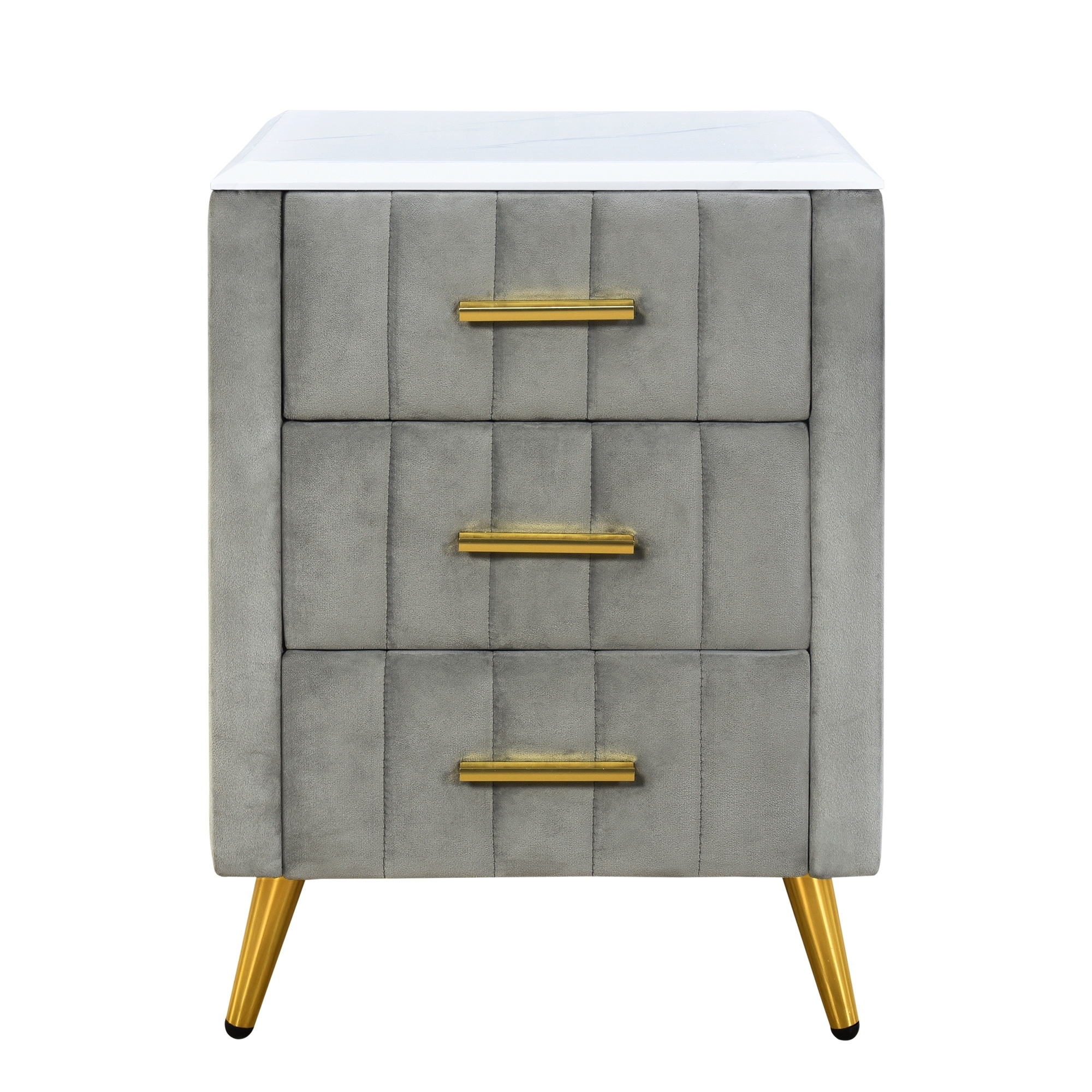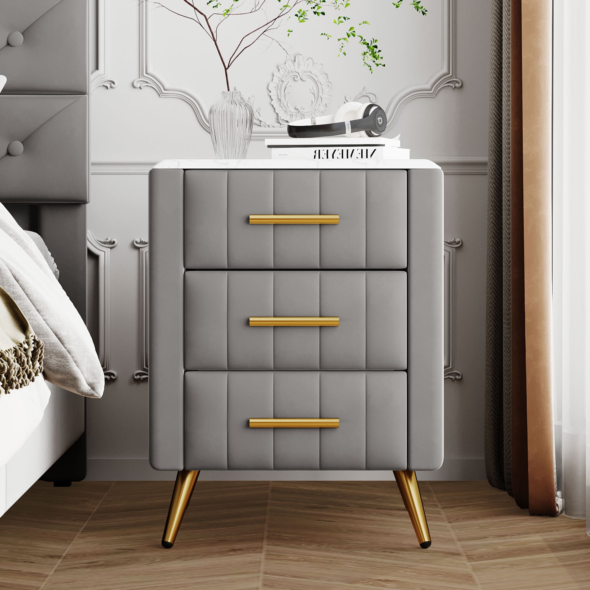 Euroco Upholstered Nightstand with 3 Drawers Wood Bedside Table with Marbling Worktop, Velvet Gray