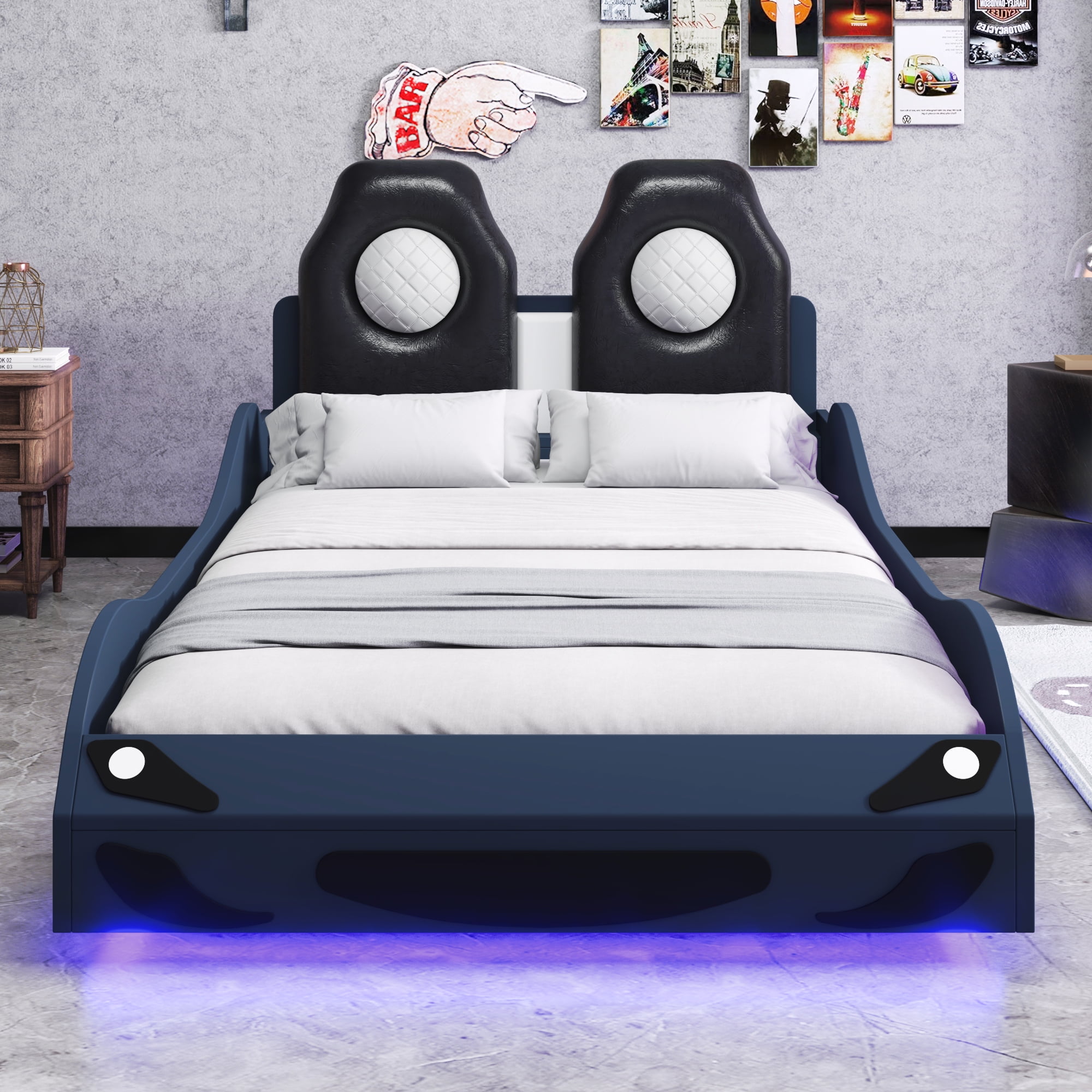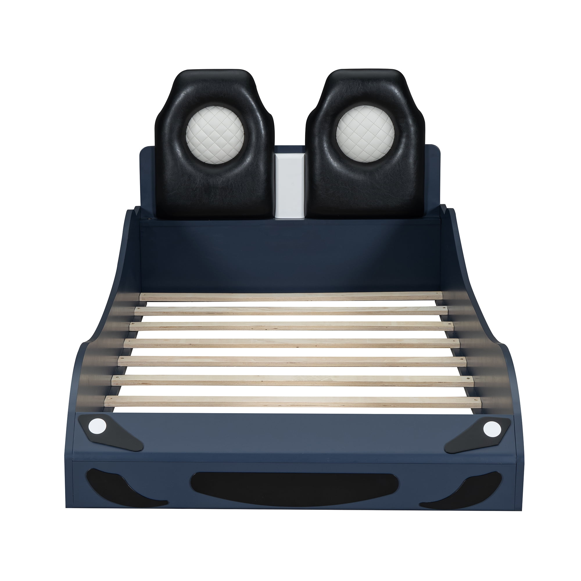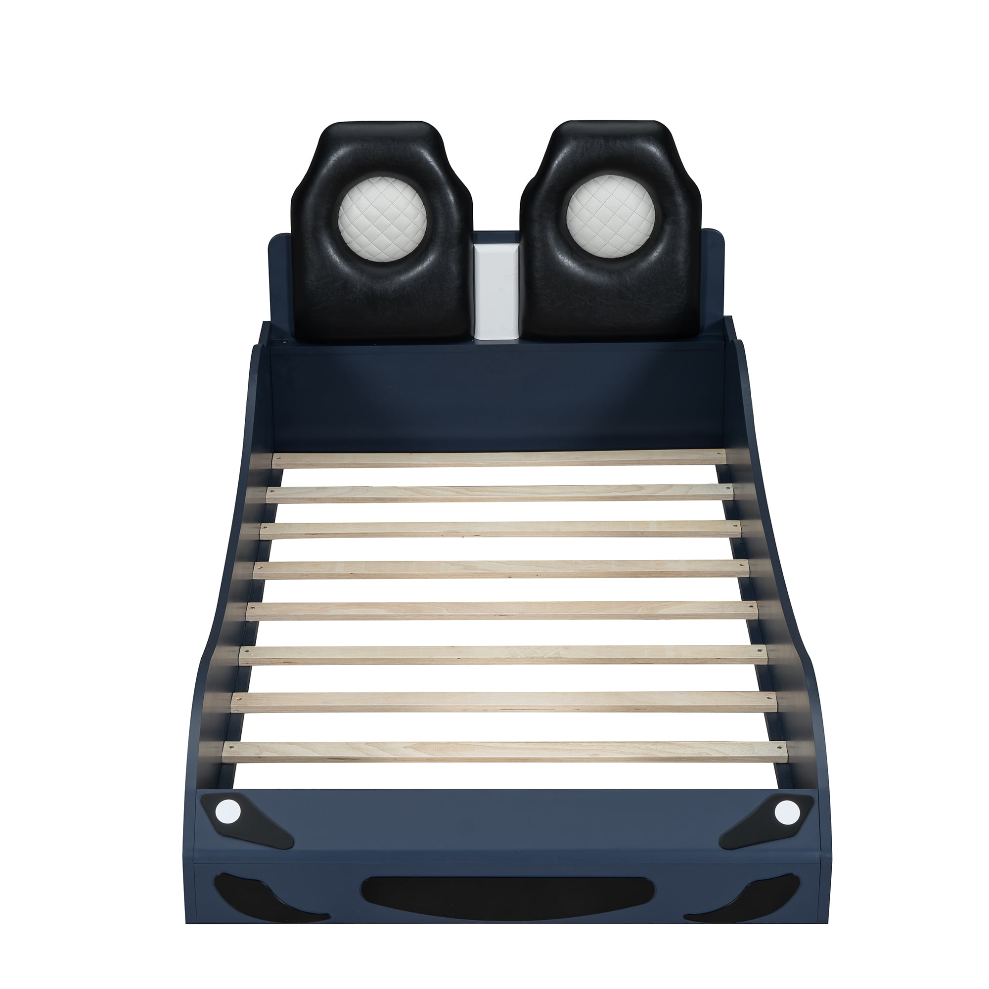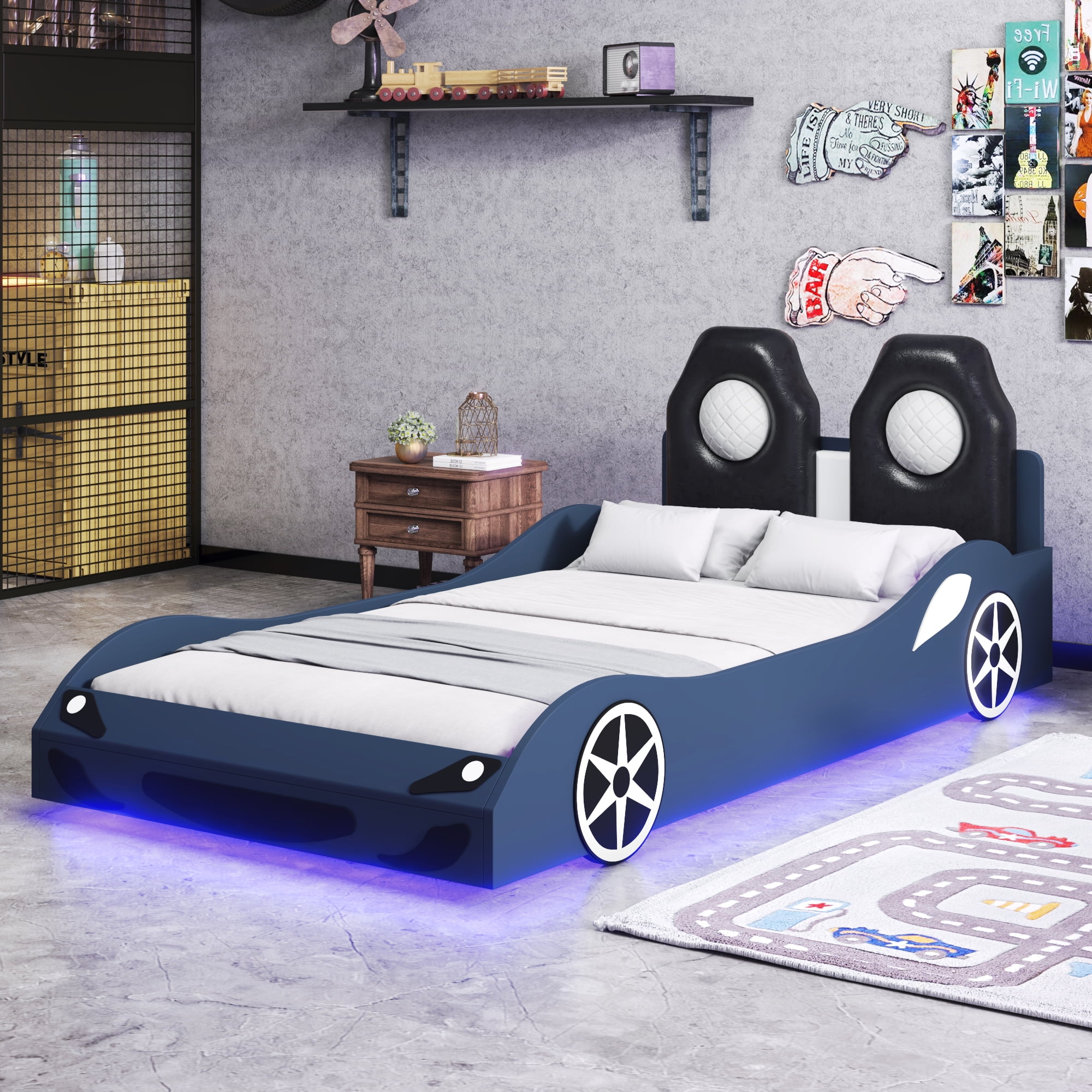[Car-Shaped]: This car shaped platform bed features tires, rims and backrest to make your kids feel like in a real car. For kids in different ages, the car frame bed will always catch their eyes. It will also turn to be a playground for your little one. [Platform Bed]: This low platform bed will be a safe choice for your little one. The full length guardrail around the platform will not only keep the mattress in place, but protect kids while sleeping. [LED Light]: The built-in LED lighting strip under the bed feature sets the mood, casting a gentle and soothing glow throughout your bedroom. [Solid Construction]: Constructed from solid pine wood, this car bed will stand the test of time and last for years. High-quality MDF and the upholstered design of the bed will be stable, without any wobbling when sleeping on it. [Easy to Assemble]: All the parts and tools needed will be packed in the package. The instruction and the accessories are also included in the package. Just follow the instruction, and then you will get your own car bed. Size: Twin Overall Product Dimension: 81”L x 40.75”W x 31.3”H Inner Size: 75” x 39.1” Overall Product Weight: 31.3lb Weight Capacity: 250lb Mattress Included: No Total Height: 31.3″ Assembly Required: Yes Material: Pine Wood+MDF+PU Spring Box: No need