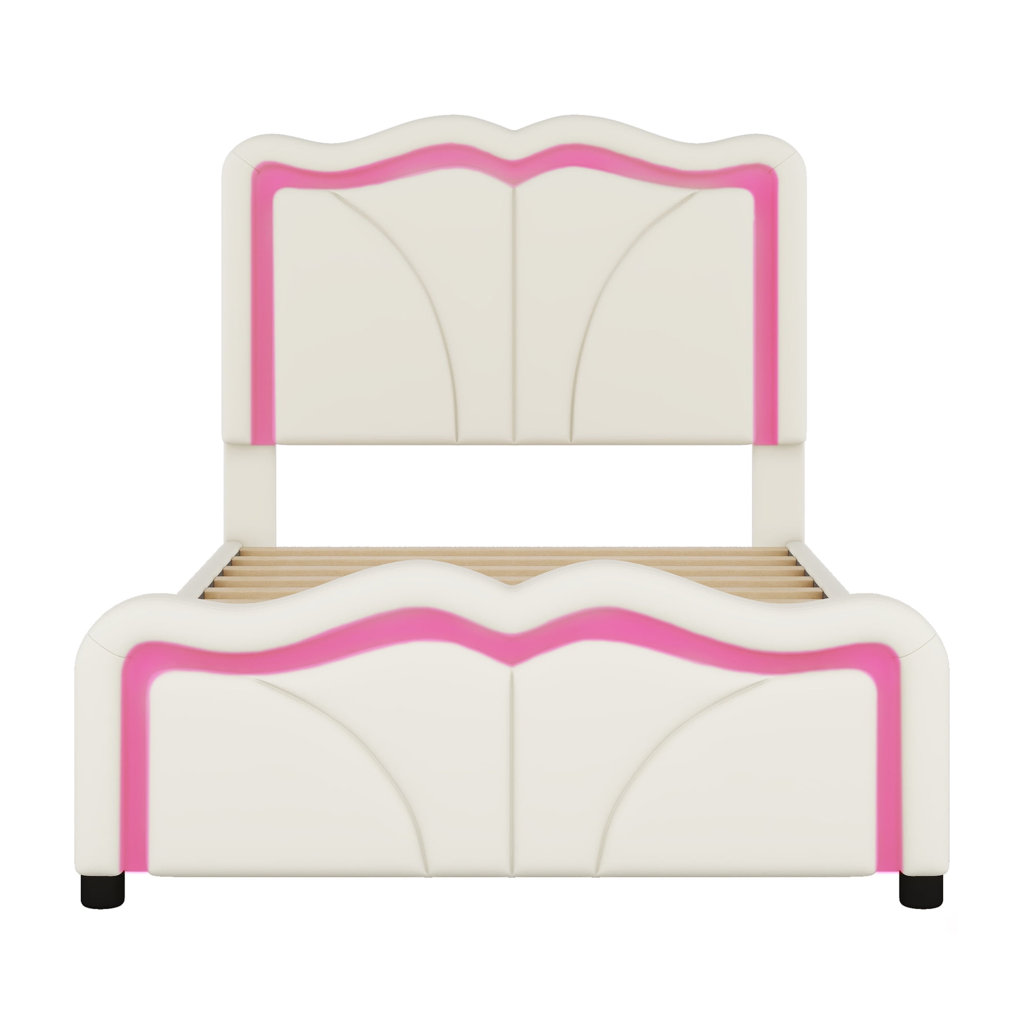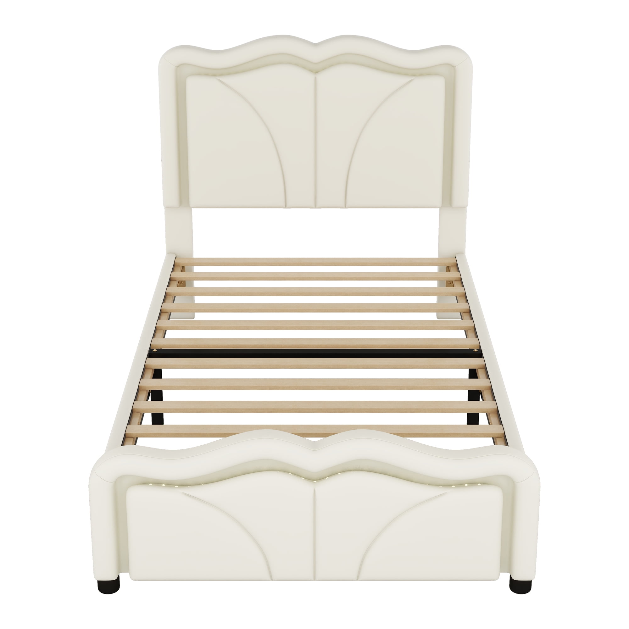 Features: [Special Bed Frame]: This Euroco upholstery platform is made of solid wood and high quality upholstery. The Waved headboard will provide a soft lean on it with adjustable height, making the bed be good for reading or writing. LED light strip also add convenience for night life. All bed frame is upholstered with PU leather for both kids and adults. [Low Profile]: This platform bed is low to the ground for your little one to enter. No need to worry falling when they are sleeping. Safe and convenient for your lovely kids. Twin and full size for different ages. The color and shape of the bed will also add any room decorations. [Solid Construction]: This bed is made from solid pine wood and PVC, which will stand the test of time to serve your family for many years. Salts are included, so box spring no needed. Headboard and footboard will keep the mattress in place. [Easy to Assemble]: This expertly crafted piece comes with everything you need to put it together, including all hardware and simple tools to get you from box to bedroom in less time than you’d think. Specification: Size: Twin/Full Twin Product Dimension: 79.1”L x 39”W x 44.8”H Full Product Dimension: 79.1”L x 54.1”W x 44.8”H Twin Bed Inner Size: 74.8″x 39″ Full Bed Inner Size: 74.8″x 54″ Twin/Full Overall Product Weight: 62.22lb/86.66lb Twin/Full Bed Weight Capacity: 250lb/400lb Mattress Included: No Total Height: 40.15″-44.8″ Assembly Required: Yes Recommend Bed Mattress Thickness: 6-10” Cartoon Headboard PU Leather