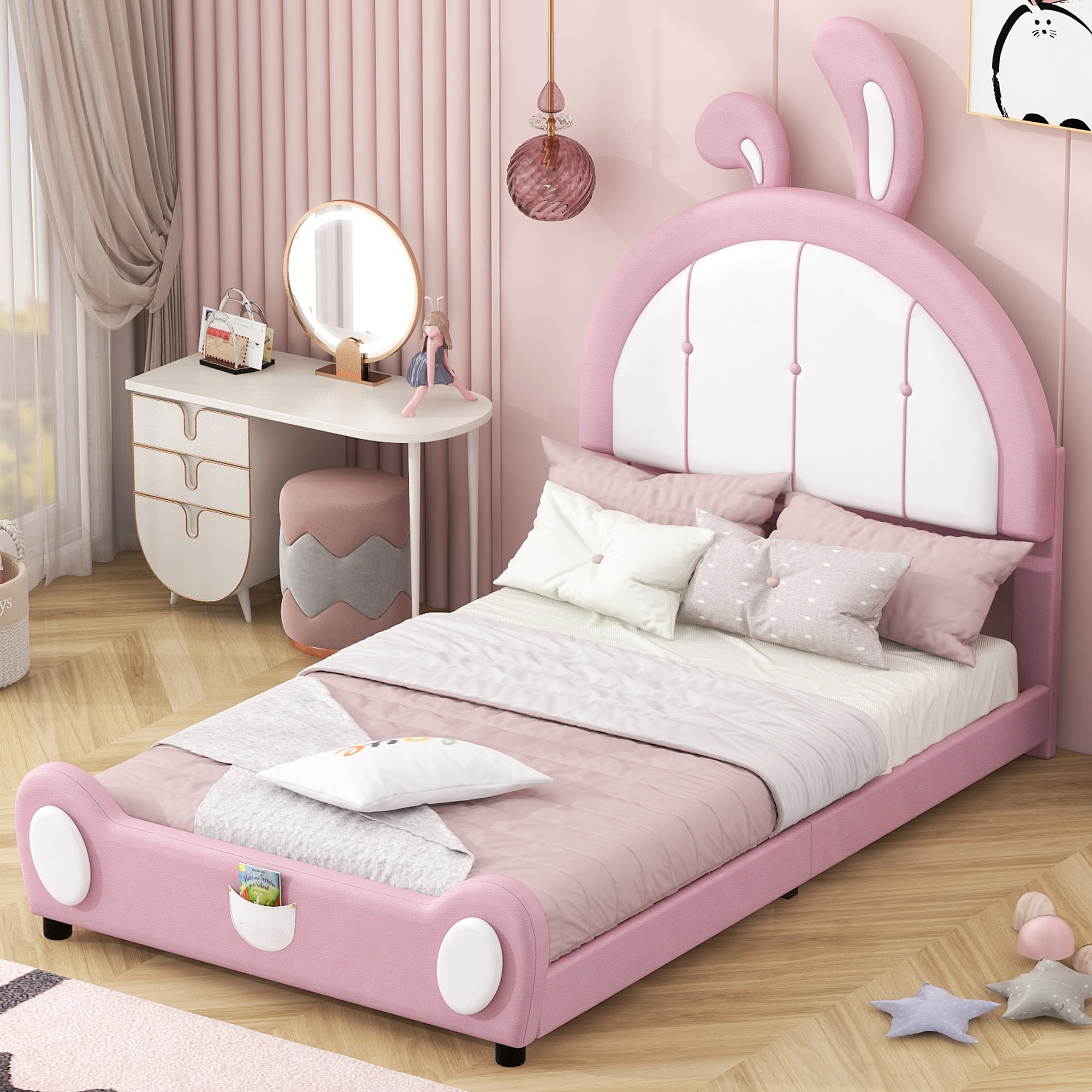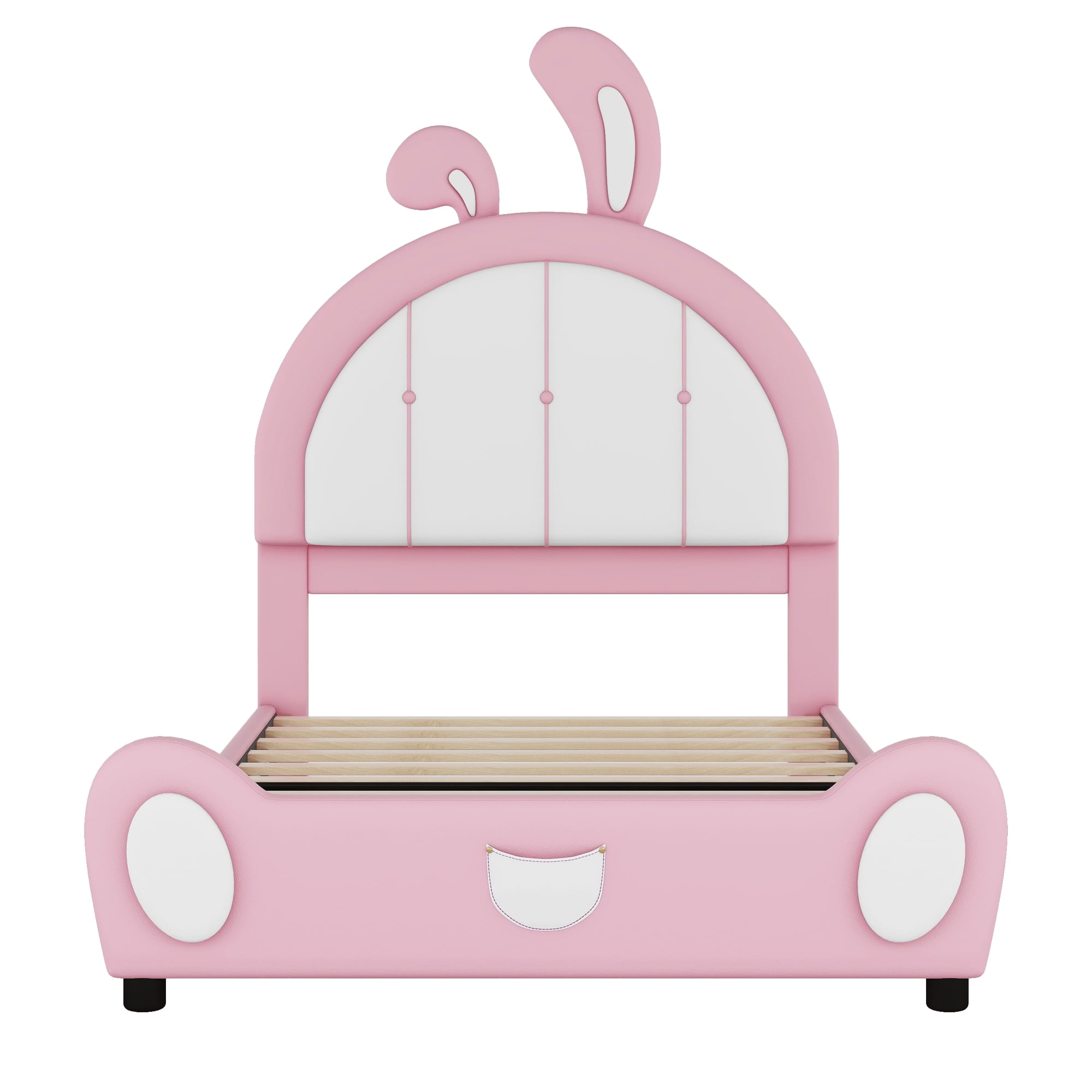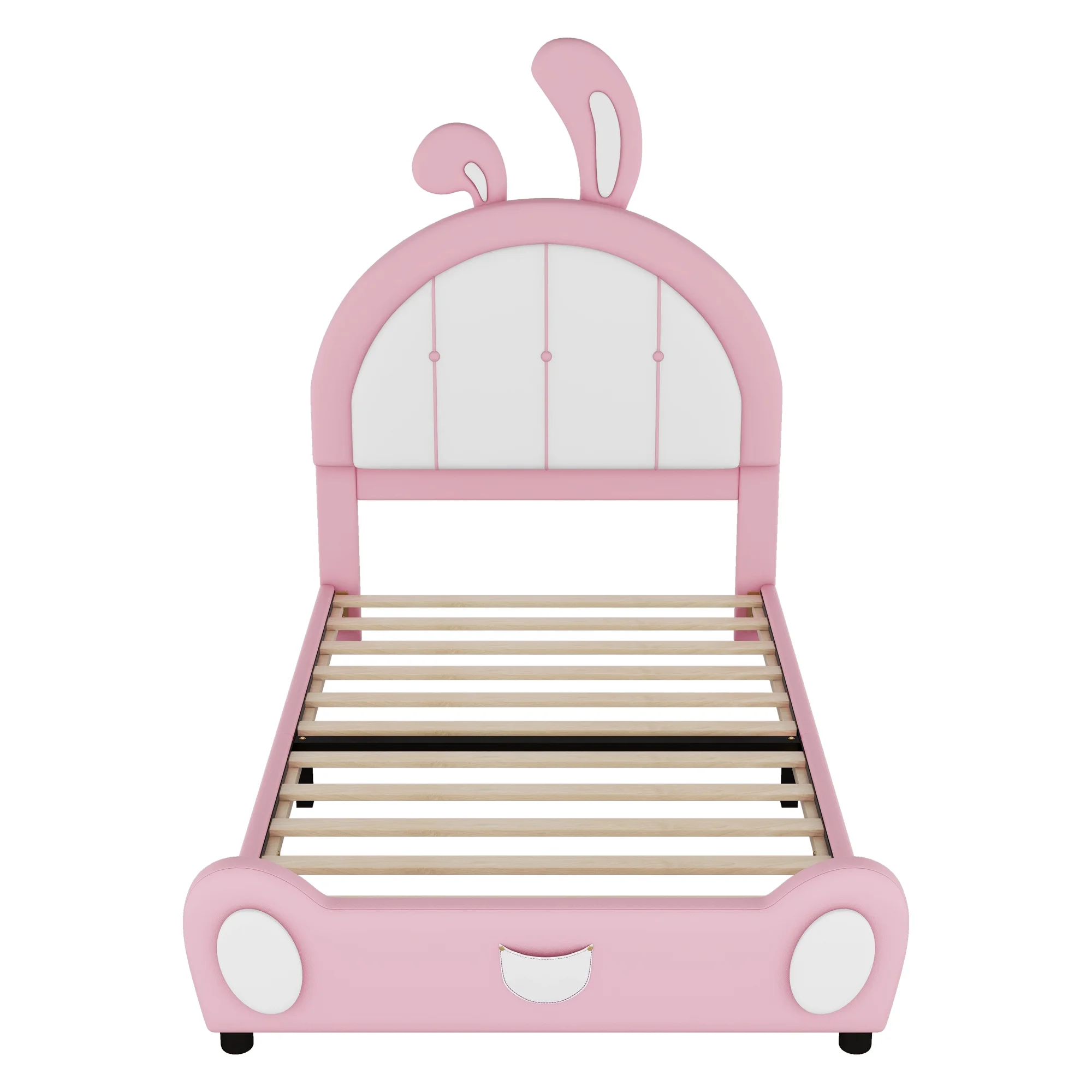 EUROCO Upholstered Twin Platform Bed, Cartoon Bunny Bed for Toddler Kids Teens, No Box Spring Needed, Pink