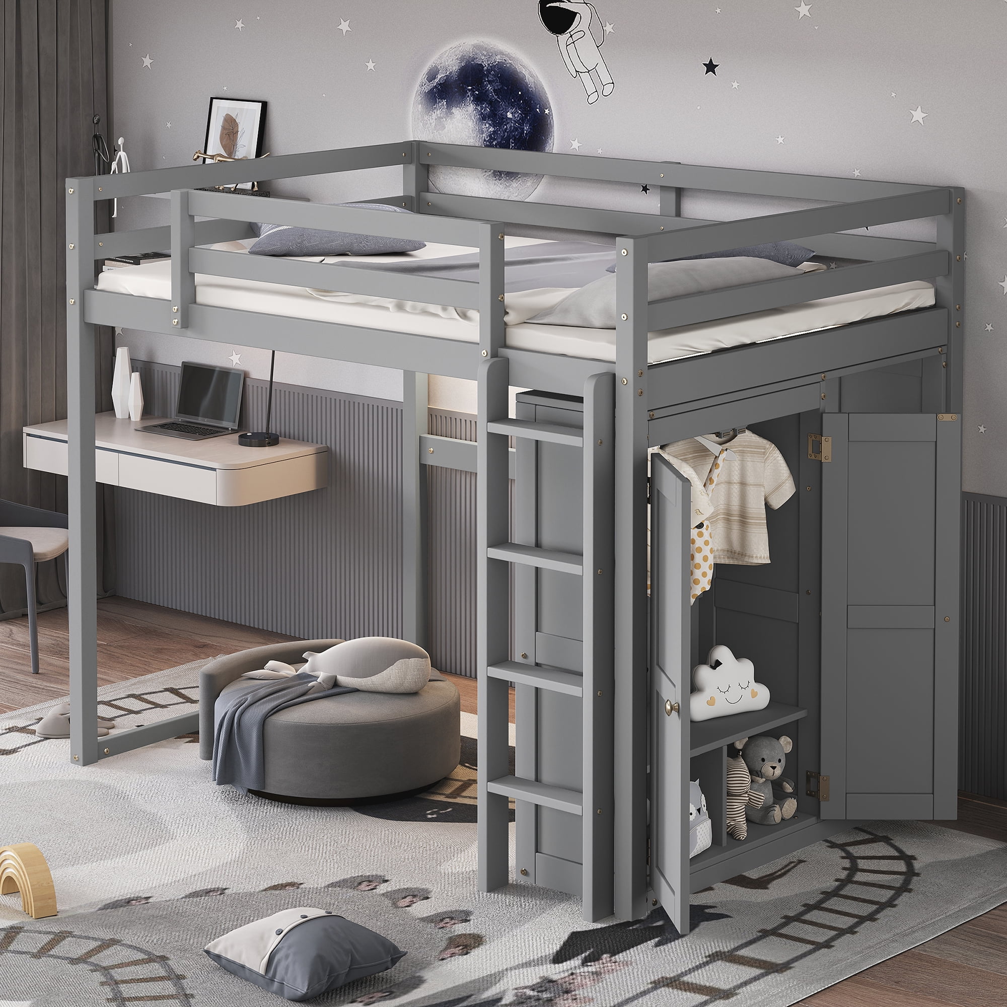 Features: [Functional Loft]: The gray full size loft bed will provide more space for your big boy. The space under the bed is fully used, so that it can save your space and make your room tidy and organized. White or gray finish will suit different room decorations. [Wardrobe and Shelf]: The wardrobe design will help you store daily clothes or off-season clothes. The four tier shelf can act us a bookcase for books and decorations. Attached LED light, so you do not need buy more lamps. [Safe and Comfortable]: Full-length guardrails on the upper bed prevent accidental falls. The built-in 4-step ladder tightly attaches to the bed for easy access and wobble-free footing. [Solid Construction]: Made of solid pine wood and MDF board, this loft bed is built to withstand the test of time and serve your family for years. The bed frame is manufactured for sound stability and security that can withstand playing without dangerous wobbling. [Easy to Assemble]: With detailed instructions included, you can easily assemble with loft bed on your own. White or gray painted finish is smooth and easy to clean. All the parts and tools needed will be packed in the package. Specification: Size: Full Overall Product Dimension: 79.5”L x 57”W x 65”H Bed Size: 76” x 54.5” Overall Product Weight: 176.88lb Weight Capacity: 350lb Mattress Included: No Total Height: 65″ Assembly Required: Yes Recommend Bed Mattress Thickness: 6” Material: Pine Wood+MDF Spring box: No need