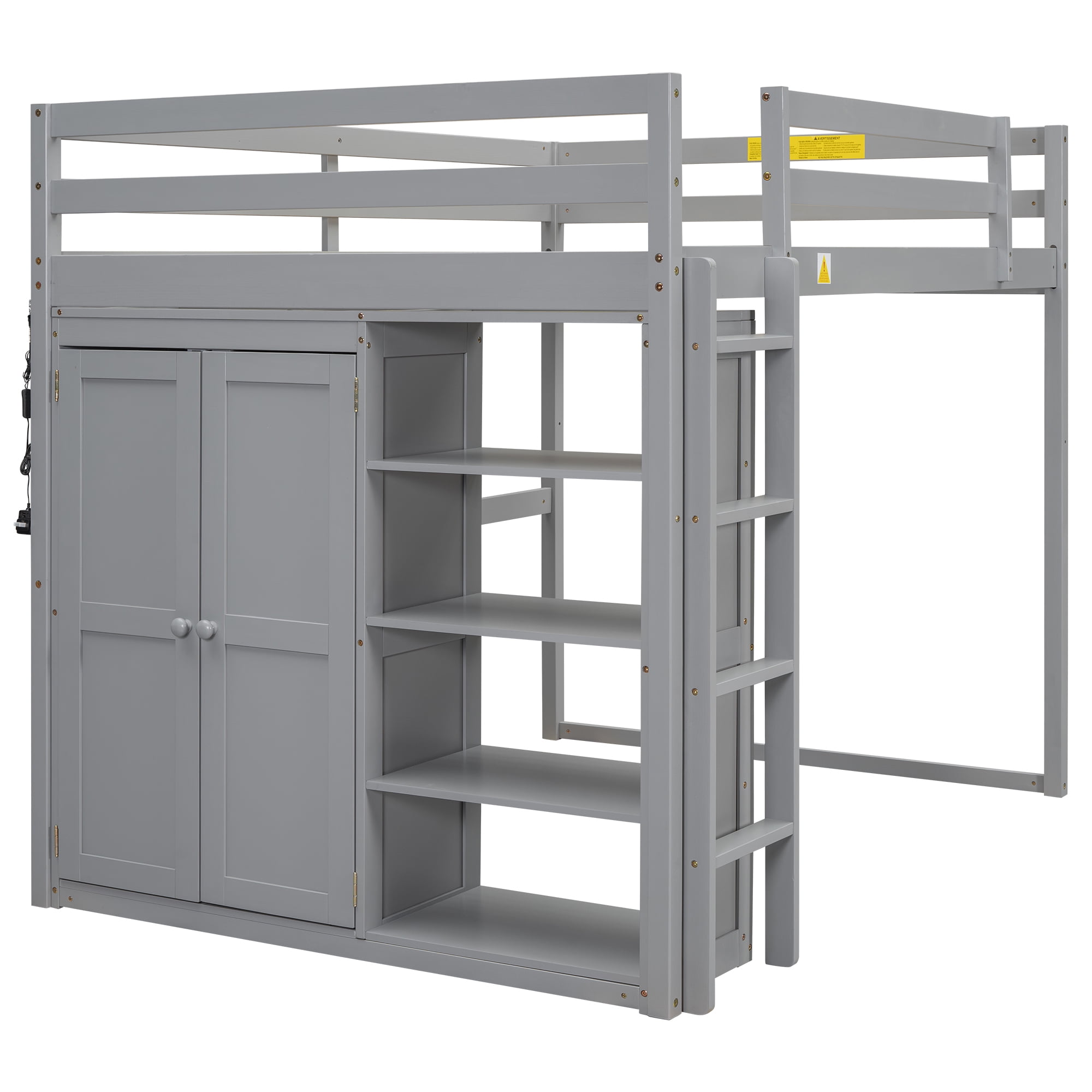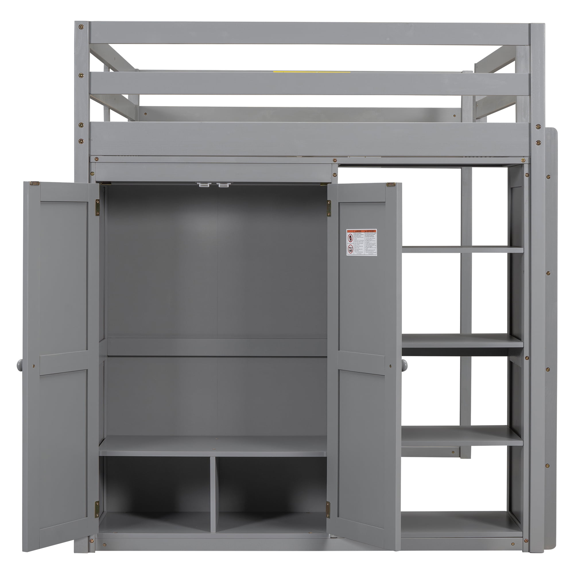 Euroco Wood Full Size Loft Bed with LED Light, Bookcase and Wardrobe, Storage Shelf for Kids Teens, Gray