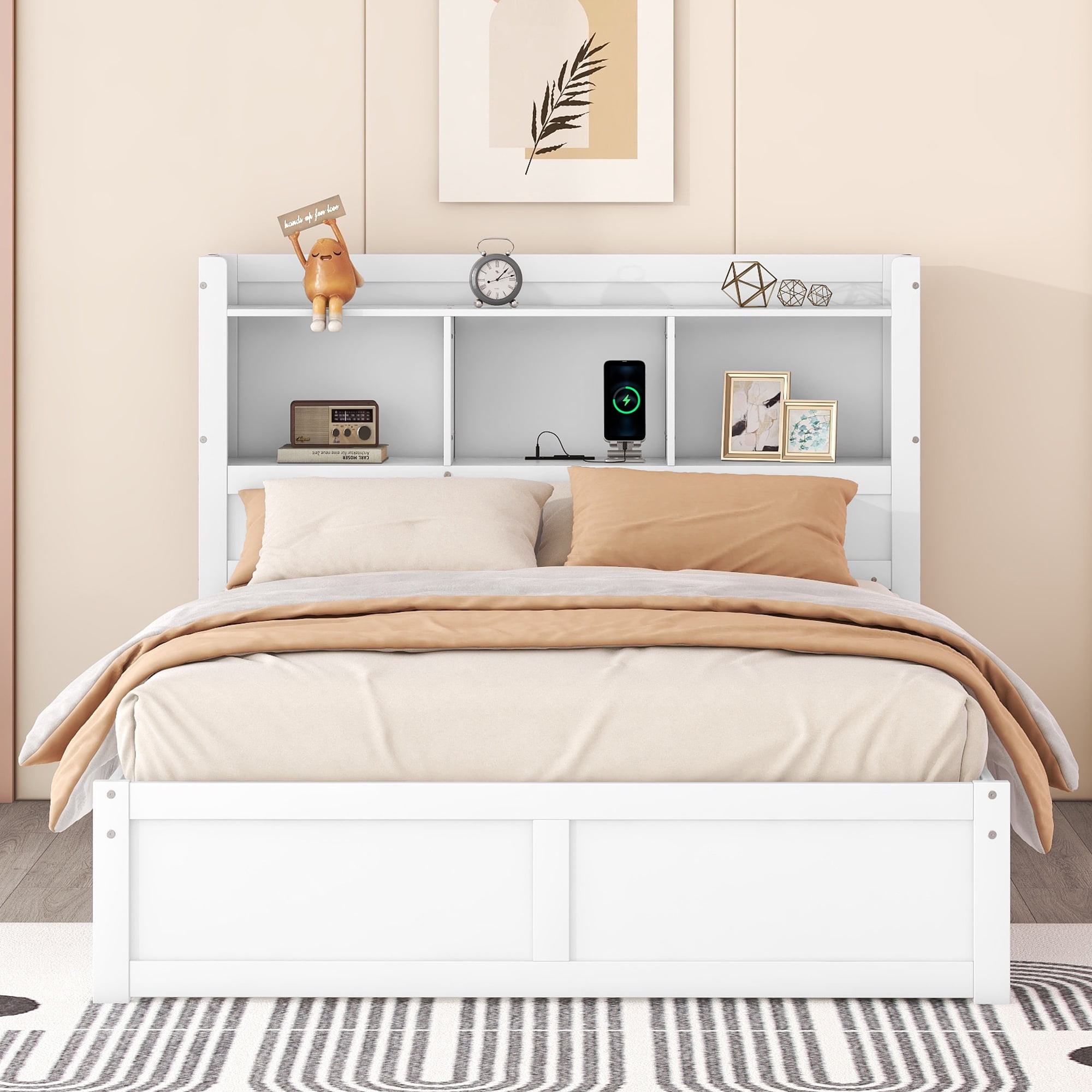 Features: [Storage Headboard and Drawers]: Storage headboard will save more space for books and toys. You can use it for decorations and attached USB charging will be convenient for lamps and phones. 2 drawers under the bed can store off season clothes or bedding for kids and adults. [Movable Shelves and Trundle]: This bed is equipped with two movable shelves for storage. You can store them under the headboard to save the space. With wheels on it, you can use it for bookcase or showcase in any rooms. Movable trundle bed can used for extra guests or storage too. [Low Profile]: This platform bed is low to the ground for your little one to enter. No need to worry falling when they are sleeping. Safe and convenient for your lovely kids. The color and shape of the bed will also add any room decorations. [Solid Construction]: This bed is made from solid pine wood, which will stand the test of time to serve your family for many years. Salts are included, so box spring no needed. Headboard and footboard will keep the mattress in place. [Easy to Assemble]: This expertly crafted piece comes with everything you need to put it together, including all hardware and simple tools to get you from box to bedroom in less time than you’d think. Specification: Size: Full Product Dimension: 88.6”L x 57.6”W x 43.3”H Bed Inner Size: 76” x 54.5” Overall Product Weight: 173lb Bed Weight Capacity: 600lb/250lb Mattress Included: No Total Height: 43.3″ Assembly Required: Yes Recommend Bed Mattress Thickness: 8-10” Material: Pine wood+MDF Spring Box: No need