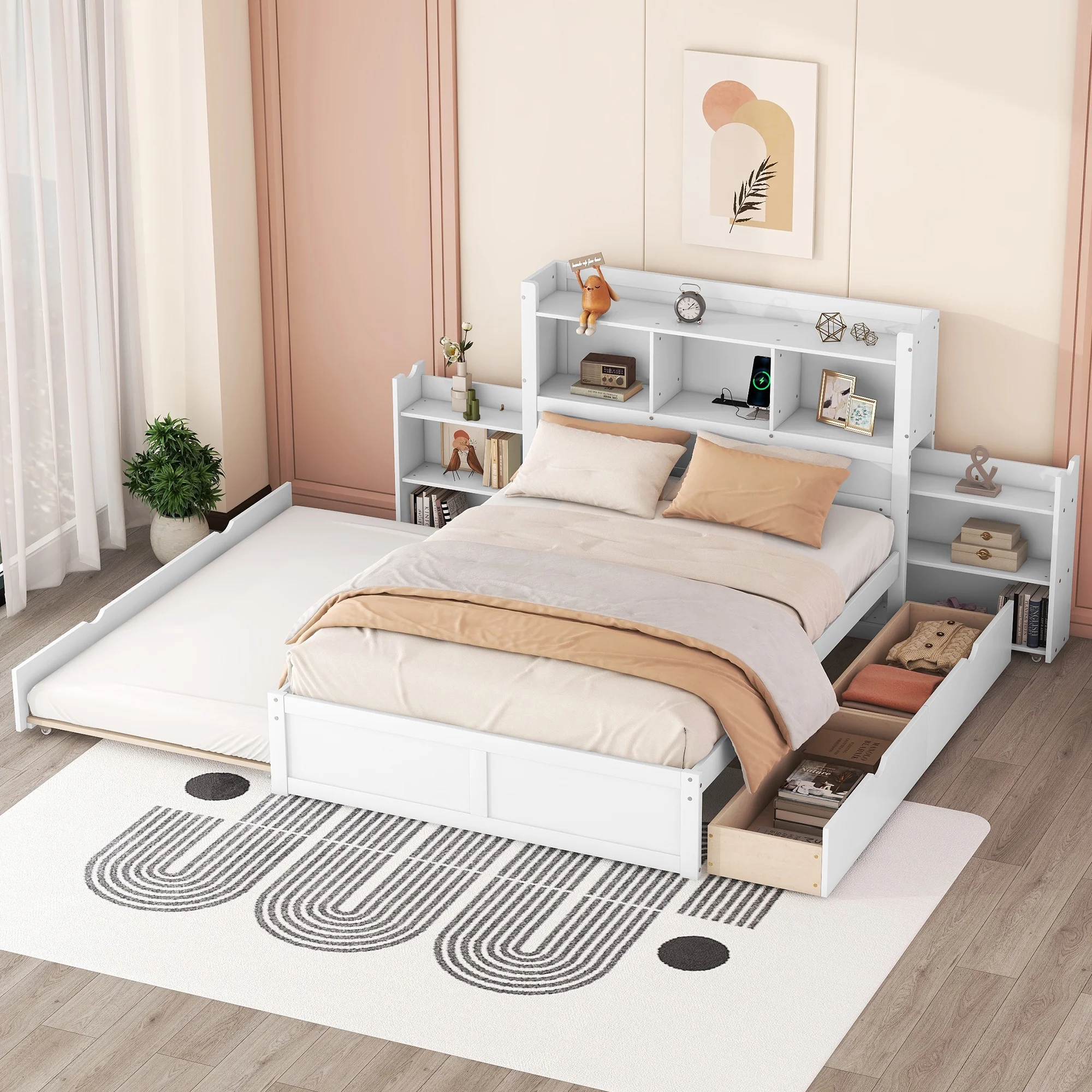 Euroco Wood Full Size Platform Bed with Movable Shelves and Drawers,Trundle with USB Charging Station