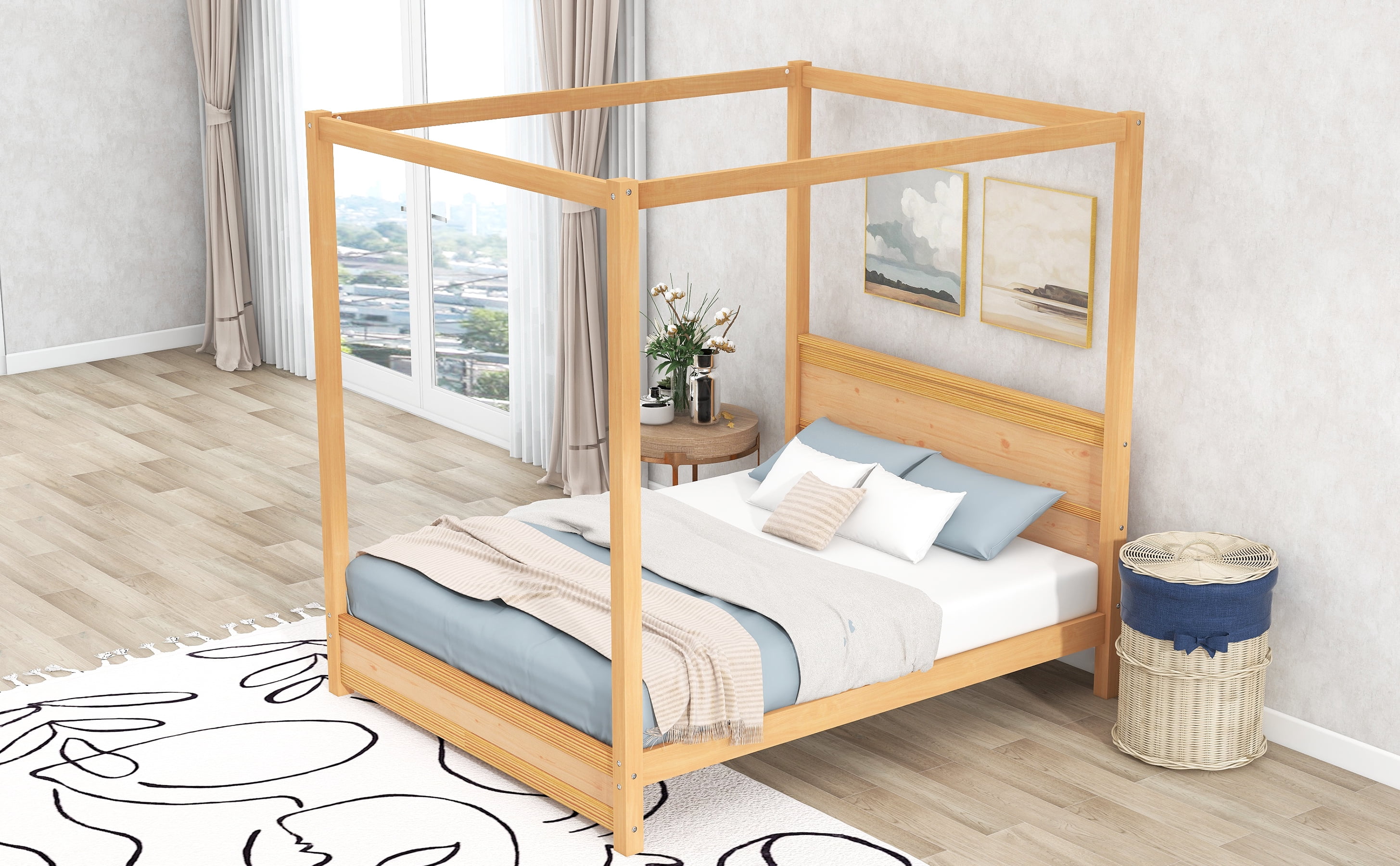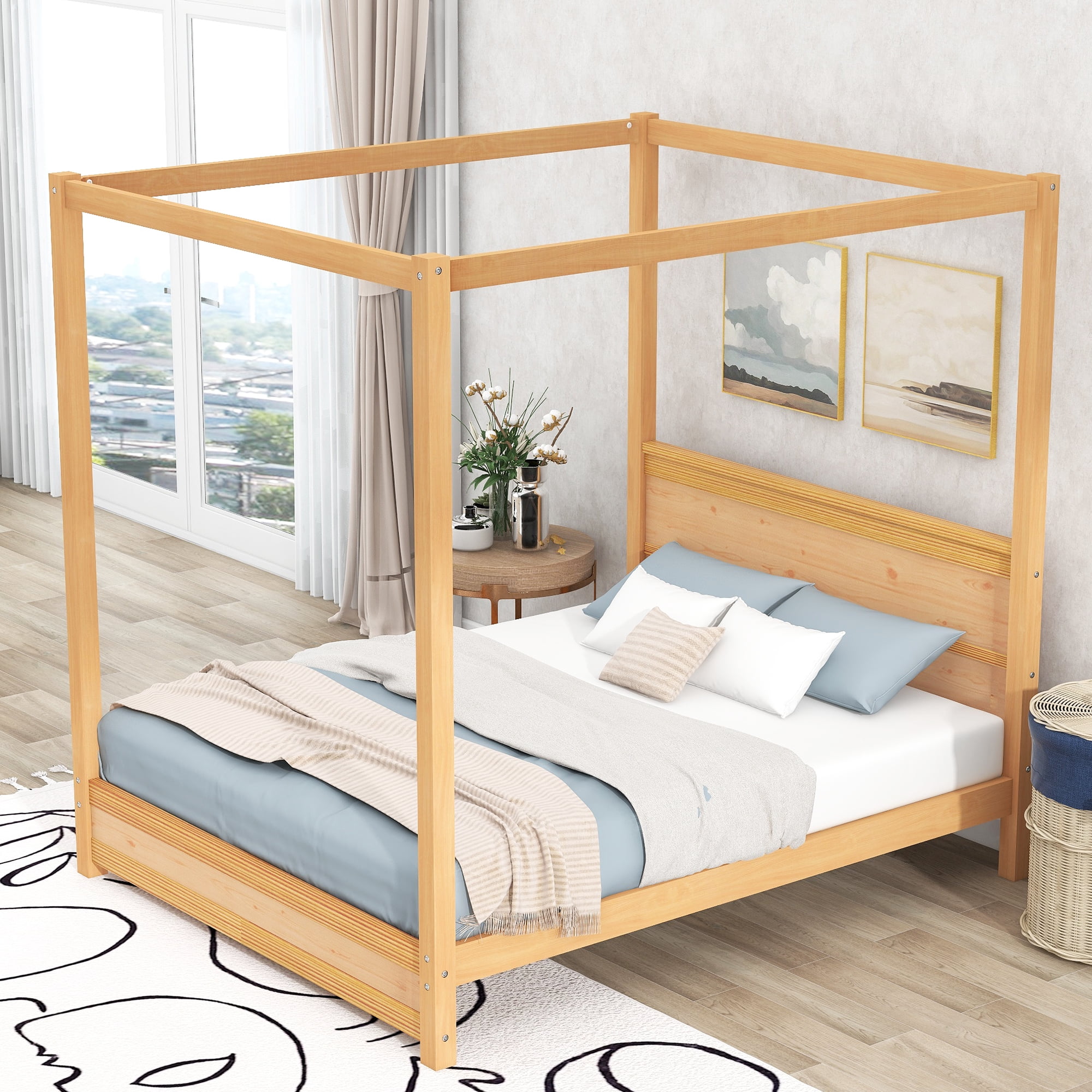 EUROCO Wood Queen Size Canopy Platform Bed with Headboard for Adults Bedroom, Natural