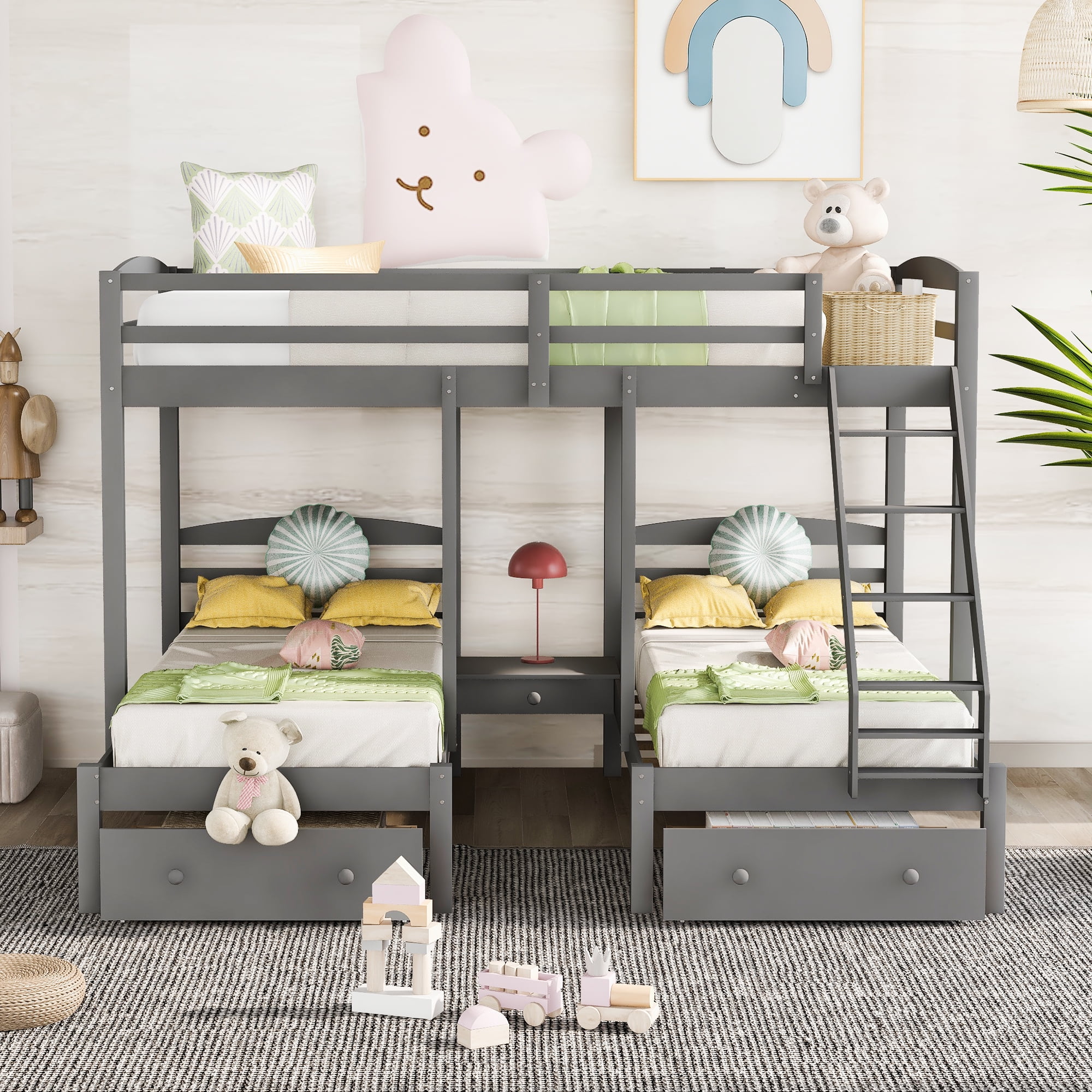 Features: [Three Twin Beds in One]: One full bed and 2 twin beds are made into a bunk bed to provide maximum sleeping space. For family with 2-3 children, this three-in-one bed is a perfect solution to share a room. Neutral color of gray combined with simple design, the bunk bed fits with any style of kids bedroom. [Sturdy and Durable]: Crafted with pine wood and MDF board, the bed frame is sturdy and solid enough to withstand the test of time. With strong wood slats to support the mattress, no box spring is needed, and kids can fully enjoy their sleeping time. [Safety in Mind]: Safety is the top for children’s furniture. Full-length guardrails are equipped with the upper bed to protect your child from accidental falls to keep them safe and secure during sleep. Comply with ASTM and CPSC safety standards, this bunk bed is designed with reliable quality. [Storage Space & Ladder]: The under-bed drawers provides extra space for the storage of children’s clothes, toys and clutters. With the vertical built-in ladder, it is easy and safe for children to climb up and down. [Easy to Assemble]: With detailed instructions included, you can easily assemble with bunk bed on your own. Gray painted finish is smooth and easy to clean. Specification: Size: Full over Twin & Twin Overall Product Dimension: 99.4”L*99”W*70”H Dimension of the Upper Bed: 53.3”x 95.6” Dimension of the Lower Bed: 39.2”x 76” Overall Product Weight: 251lb Upper/Lower Weight Capacity: 400lb/400lb Mattress Included: No Total Height: 70″ Assembly Required: Yes Recommend Upper/Down Bed Mattress Thickness: 6”/8-10”