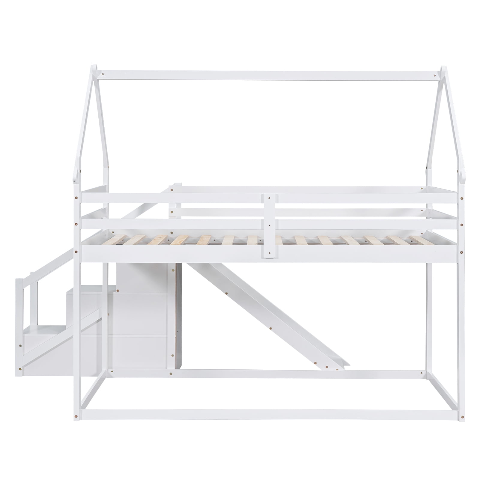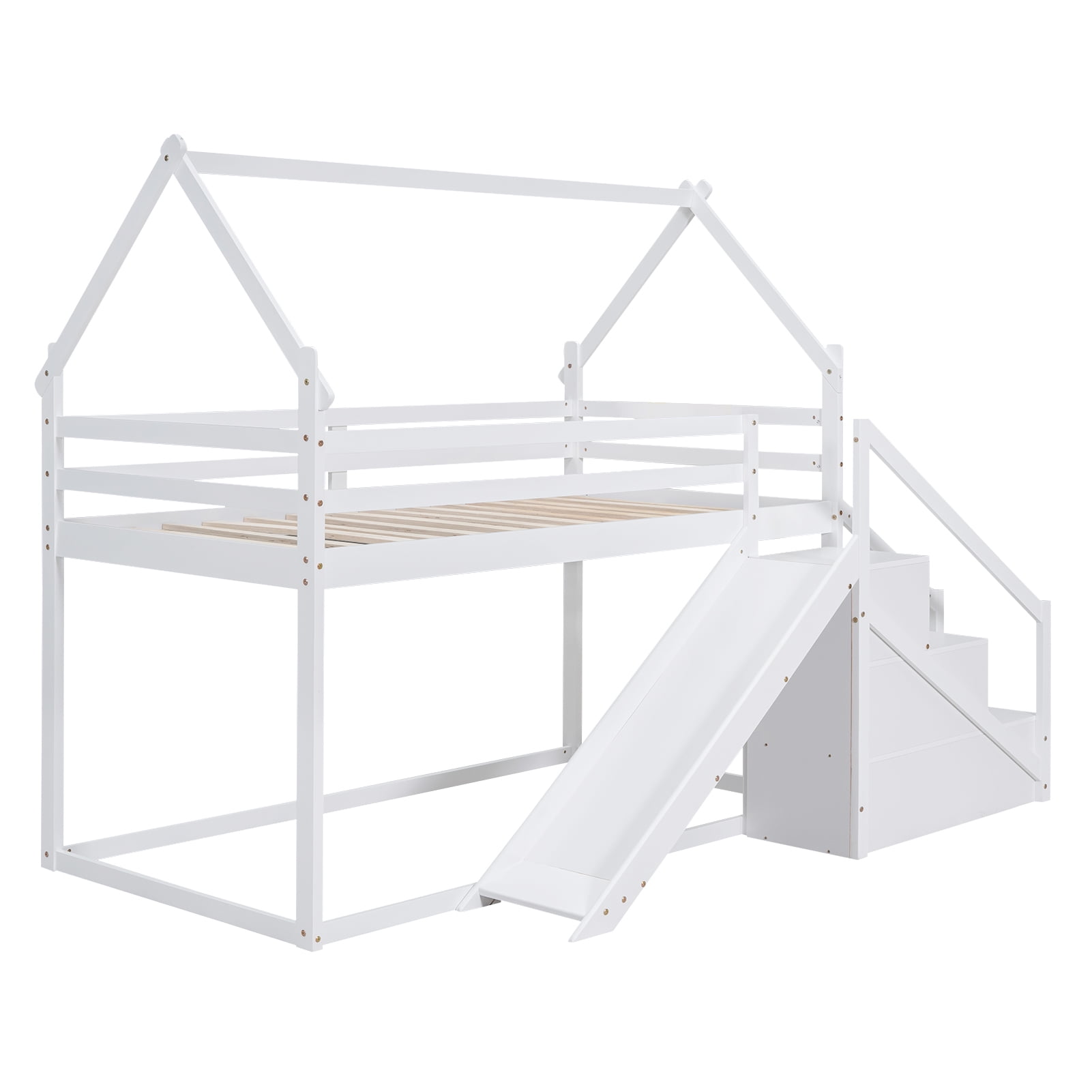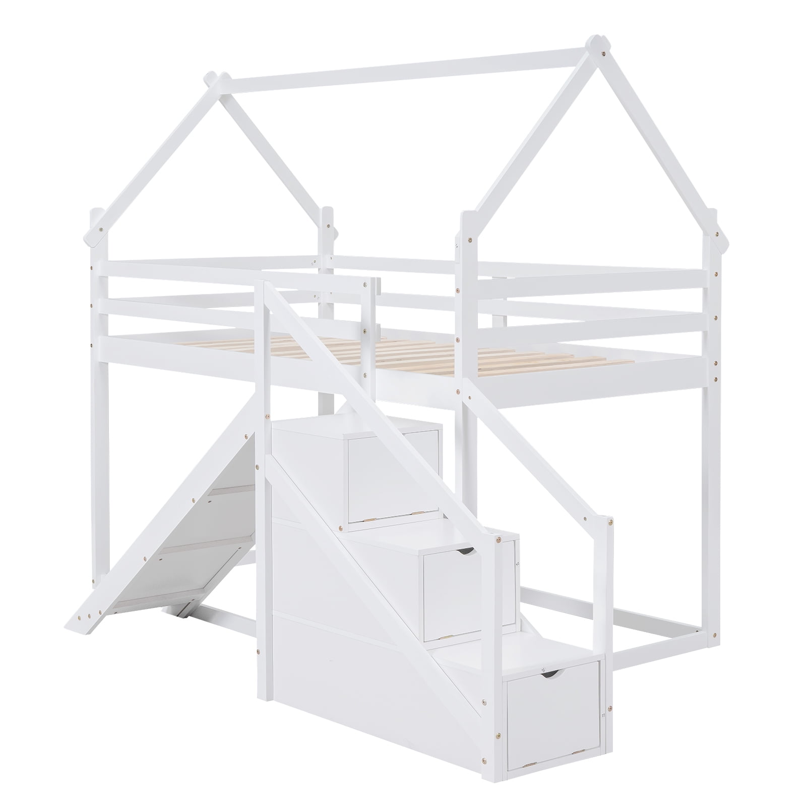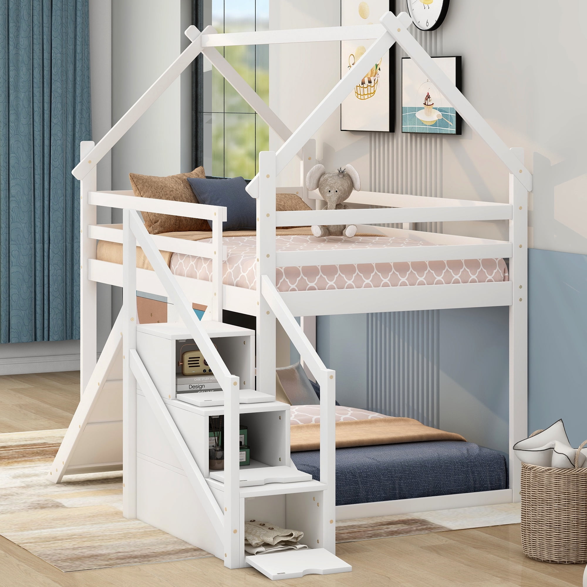 Features: [Twin Bunk Bed]: The twin over twin size bunk bed will provide more space for your child. The storage staircase will provide more storage room for you, so that save your space and make your room tidy and organized. [Low Profile Bed] The low bed is low to the ground, so your little one will be easy and safe to enter. Attached slide will add more fun to kids and the staircase will also protect your bare foot. [Safe and Comfortable]: Full-length guardrails on the house bed will prevent accidental falls. The attached staircase will provide easy access and wobble-free footing. [Solid Construction]: Made of solid pine wood and MDF board, this bed is built to withstand the test of time and serve your family for years. The bed frame is manufactured for sound stability and security that can withstand playing without dangerous wobbling. [Easy to Assemble]: With detailed instructions included, you can easily assemble this bed on your own. White or natural painted finish is smooth and easy to clean. All the parts and tools needed will be packed in the package. Specification: Size: Twin over Twin Overall Product Dimension: 77.4”L x 41.7”W x 73”H Loft Bed Size: 75.4” x 38.6” Overall Product Weight: 155lb Weight Capacity: 250lb Mattress Included: No Total Height: 73″ Assembly Required: Yes Recommend Bed Mattress Thickness: 6”/6-8”